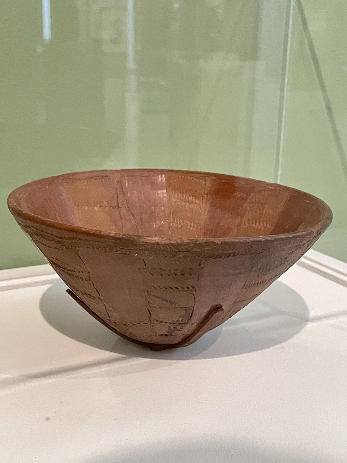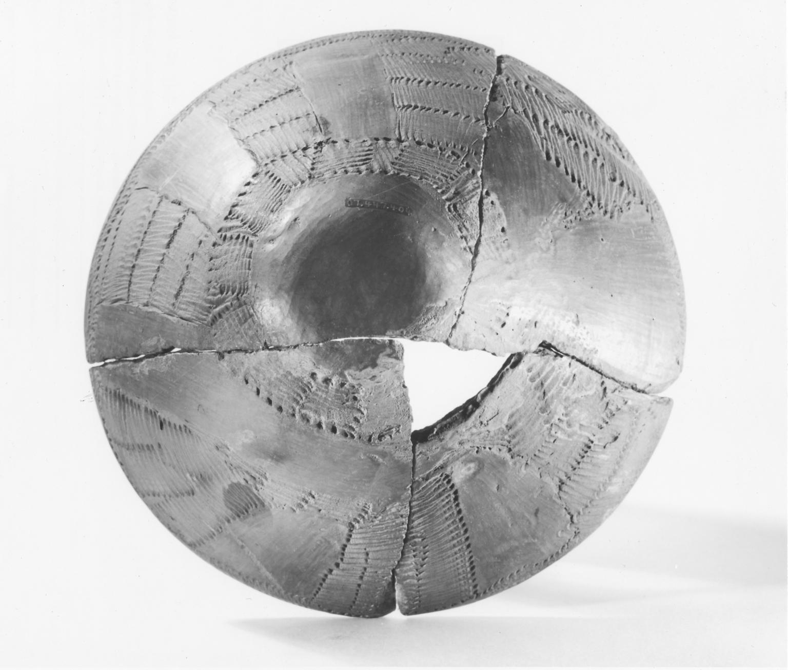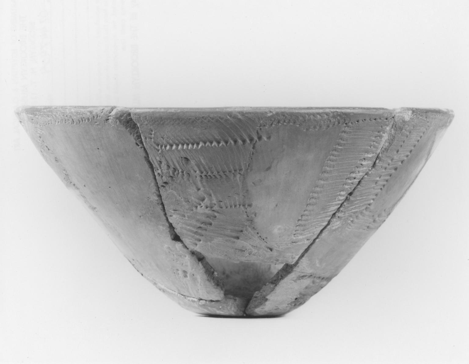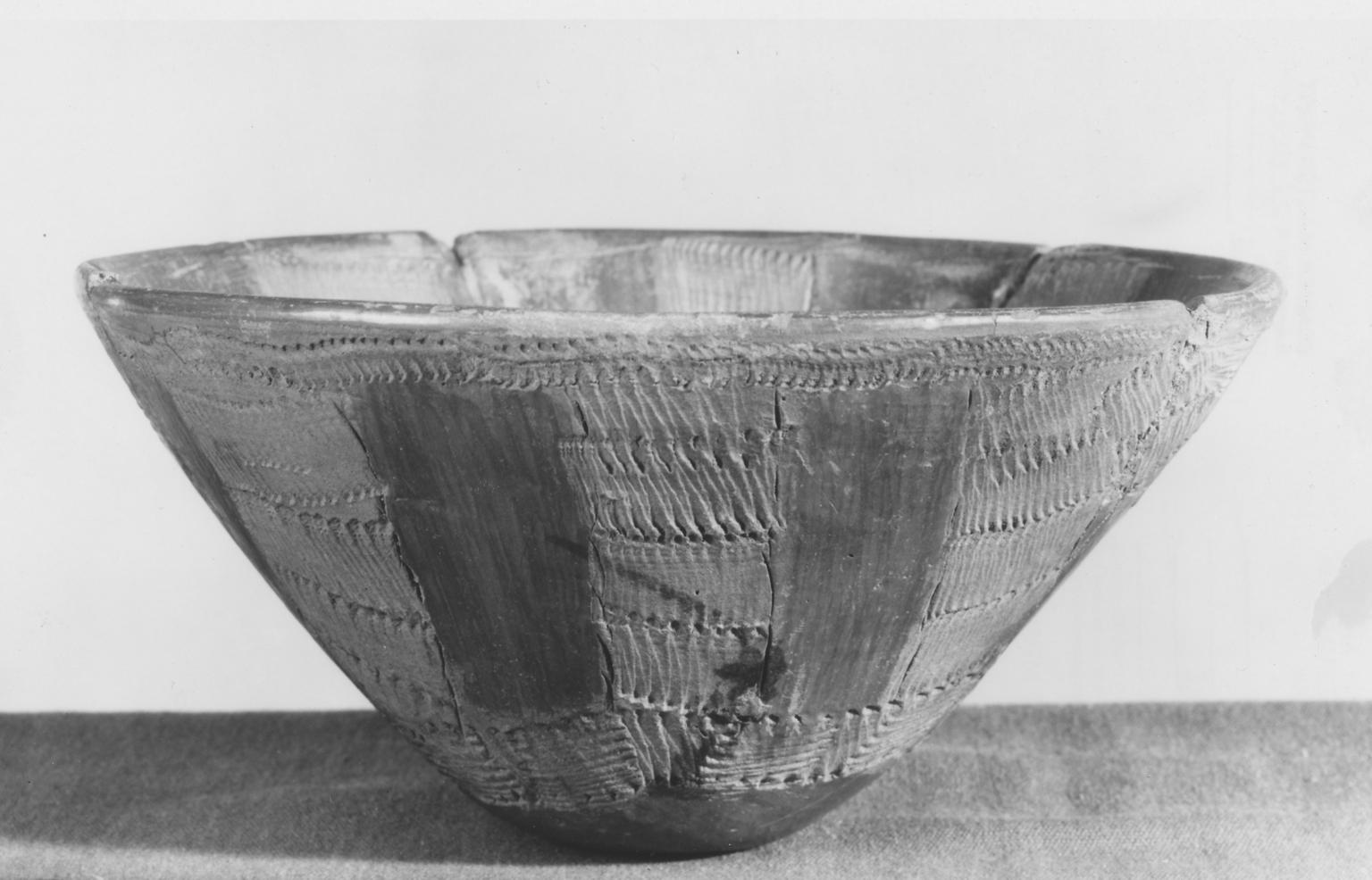 Egyptologists are not certain whether this bowl from an Upper Egyptian grave was made by a Nubian or an Egyptian. The zigzag patterns created by the use of rocker stamps and the alternation of polished and impressed panels reflect Nubian traditions of pottery decoration. Perhaps it was an Egyptian reproduction of the Nubian style.