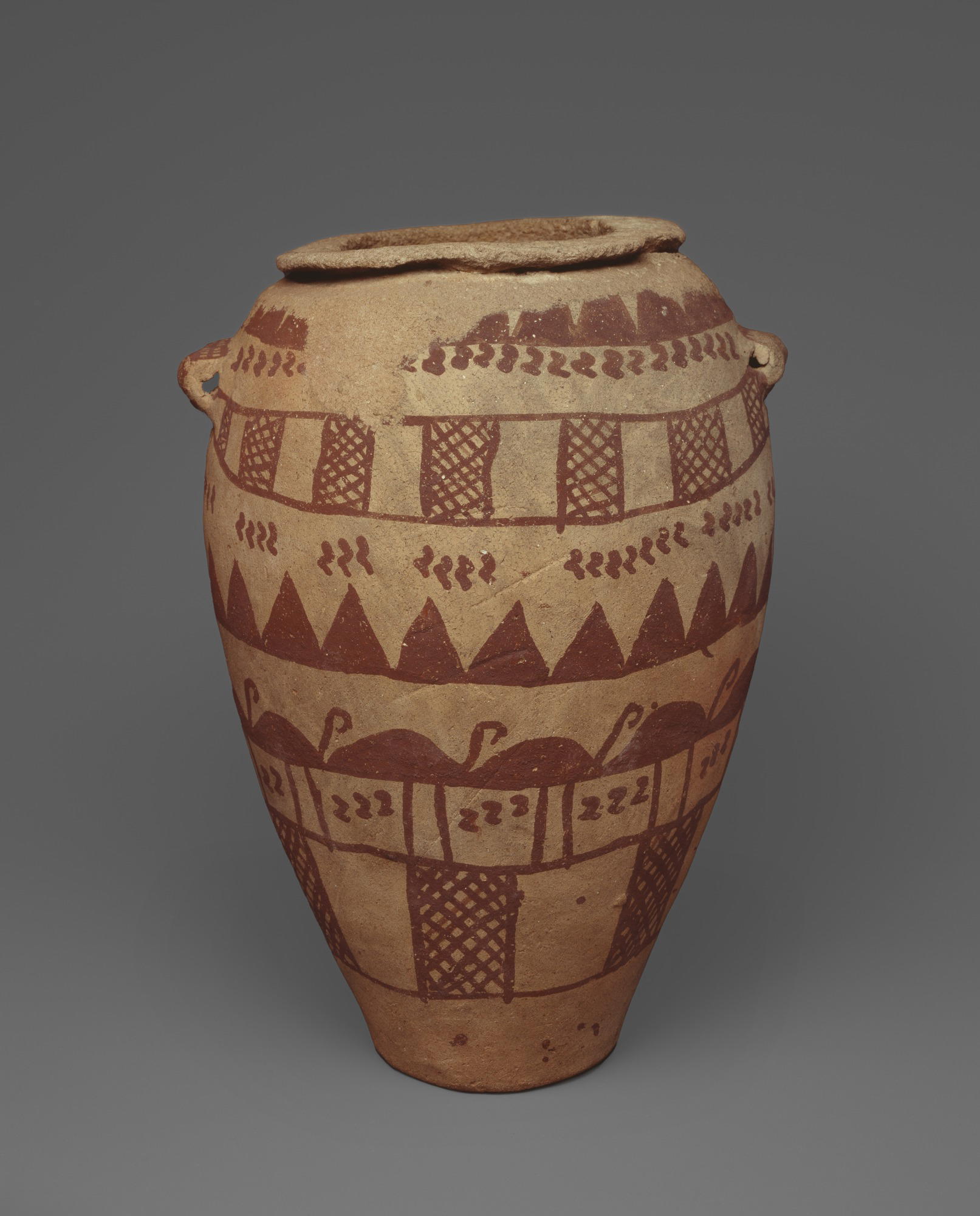 Jar with Two Tubular String-Hole Handles, ca. 3500–3300 B.C.E.. Clay, pigment, 8 1/16 x Greatest Diam. 6 in. (20.4 x 15.3 cm). Brooklyn Museum, Charles Edwin Wilbour Fund, 07.447.441. (Photo: Brooklyn Museum)