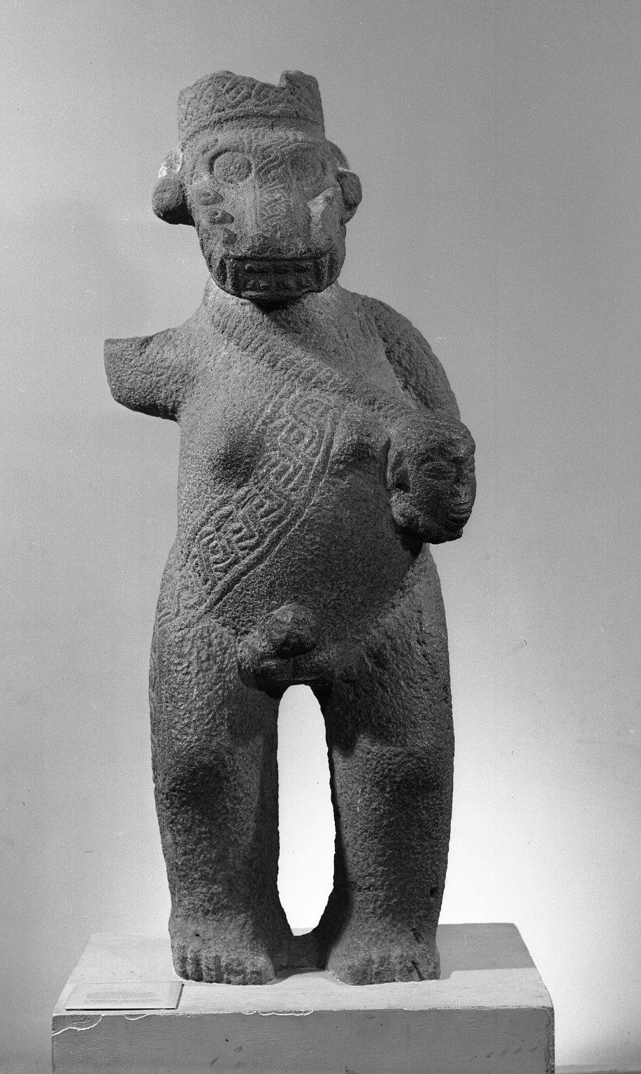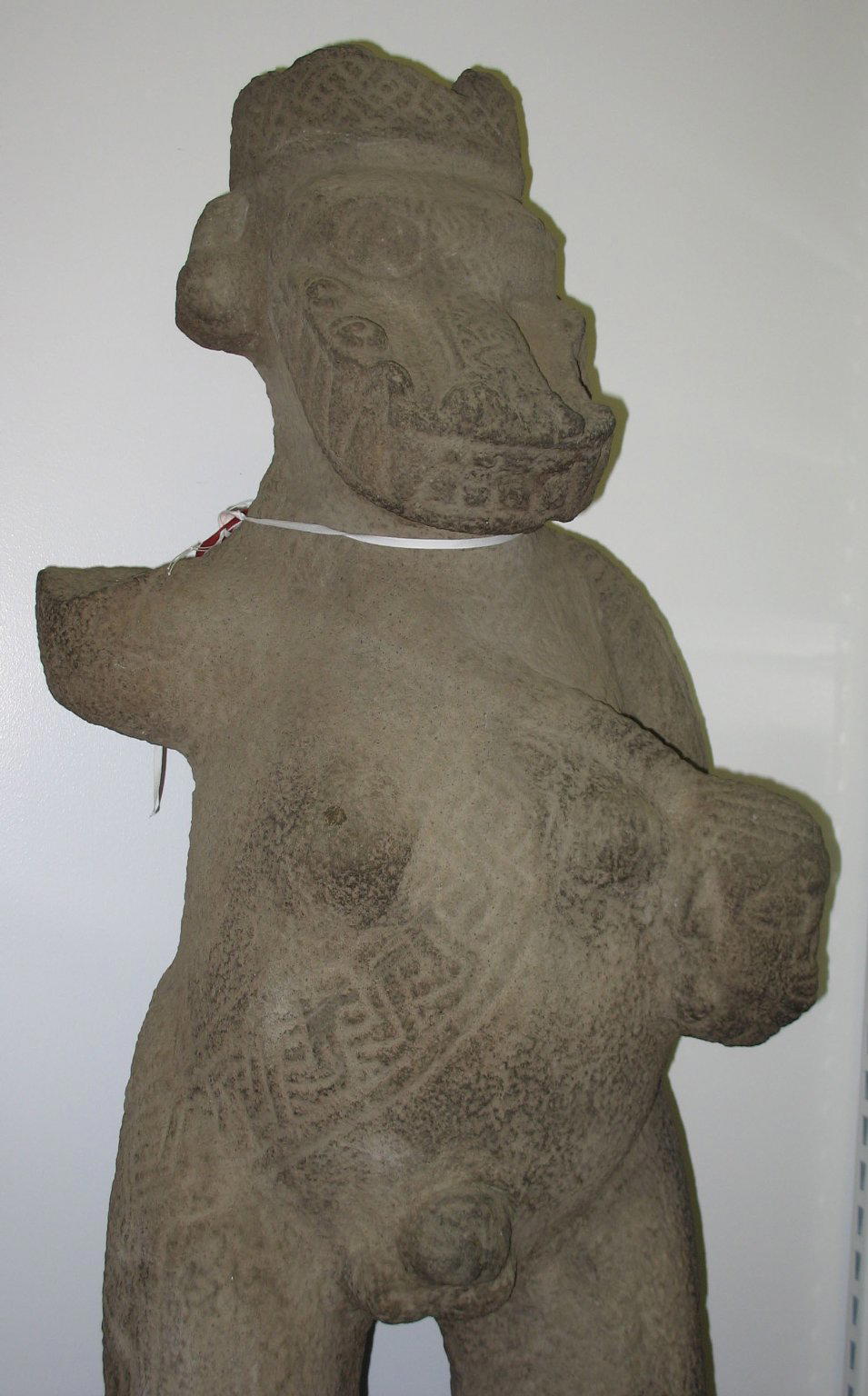 This statue was made between the 8th to the 11th century by the indigenous people in the Central Caribbean in the region of Costa Rica. It represents a male warrior wearing a crocodile mask. The figure has pronounced breasts and male genitalia. His right arm is broken and missing but appears to have been flexed upward, probably holding an axe similar to other sculptures of this genre. The carved and incised crocodilian head has a broad, flat snout with visible fangs and teeth. Scholars suggest that the statue could have been used as a kind of mask during ritual.Stone?