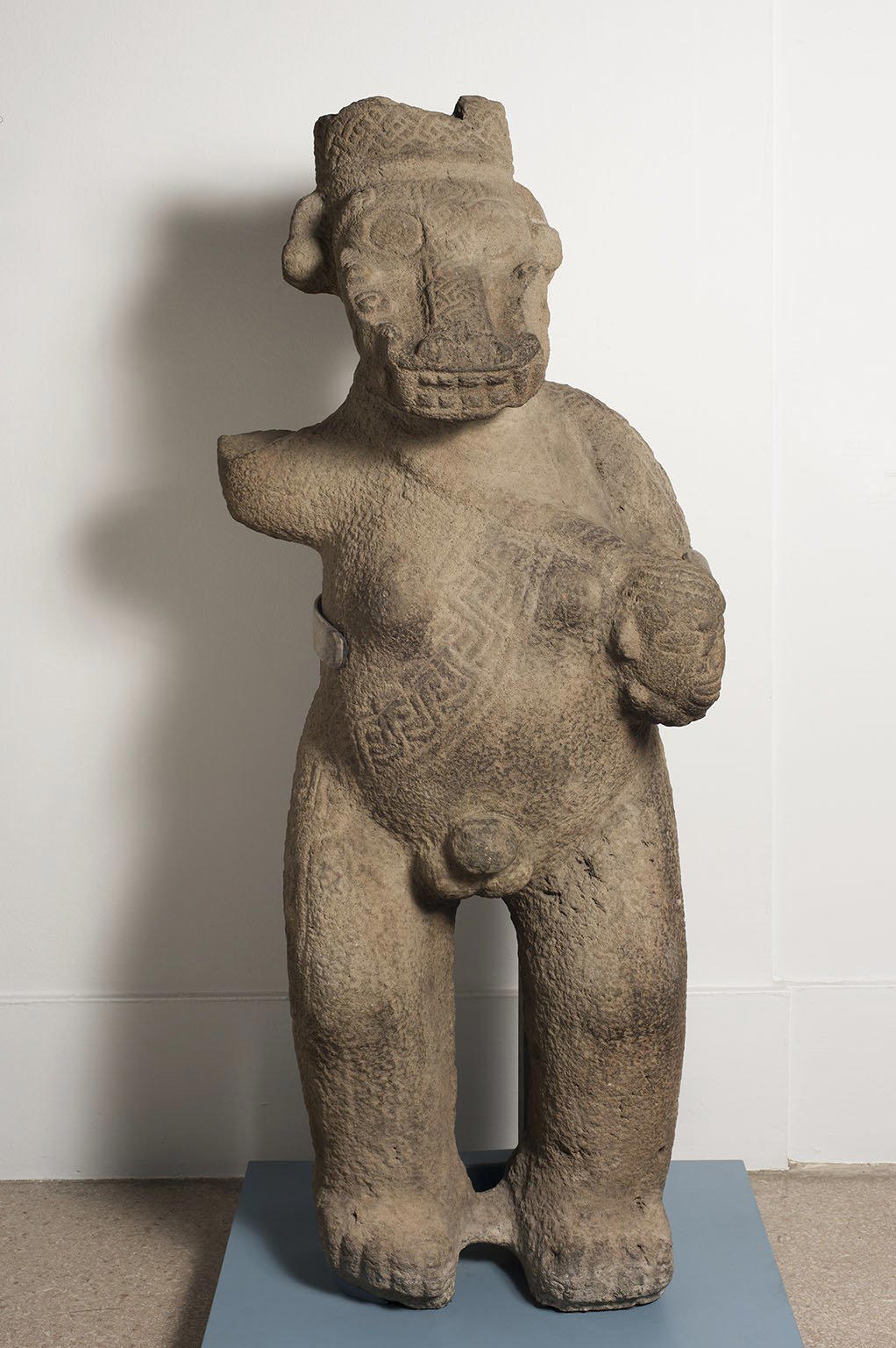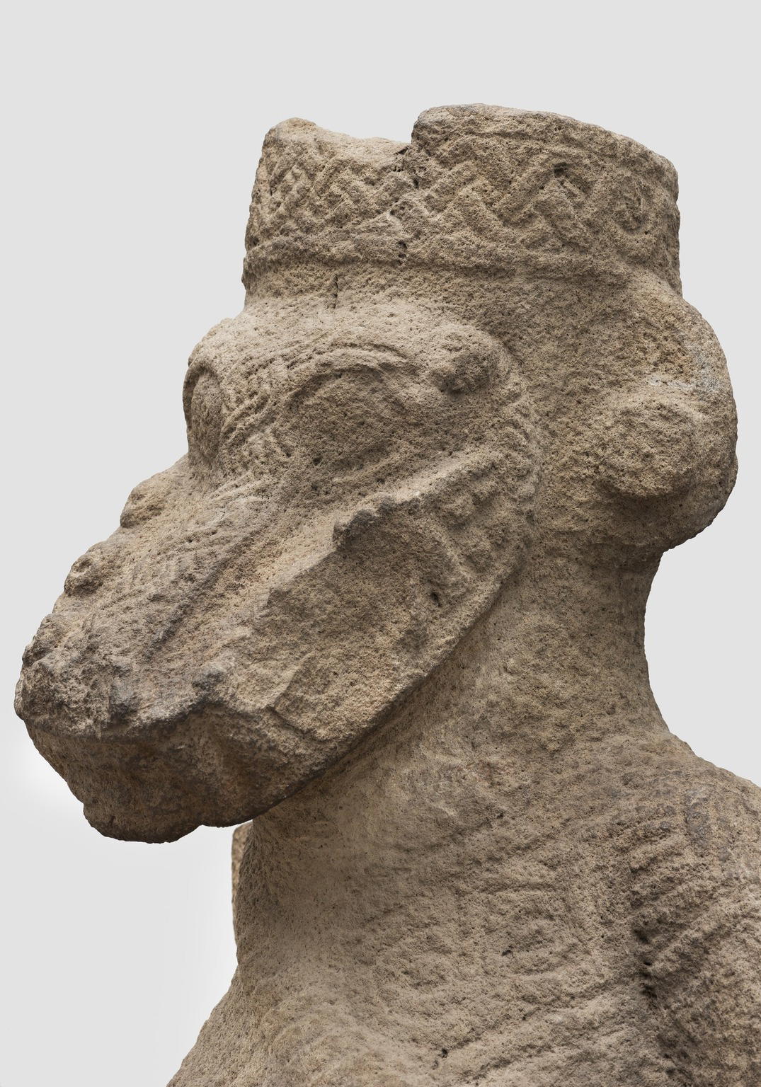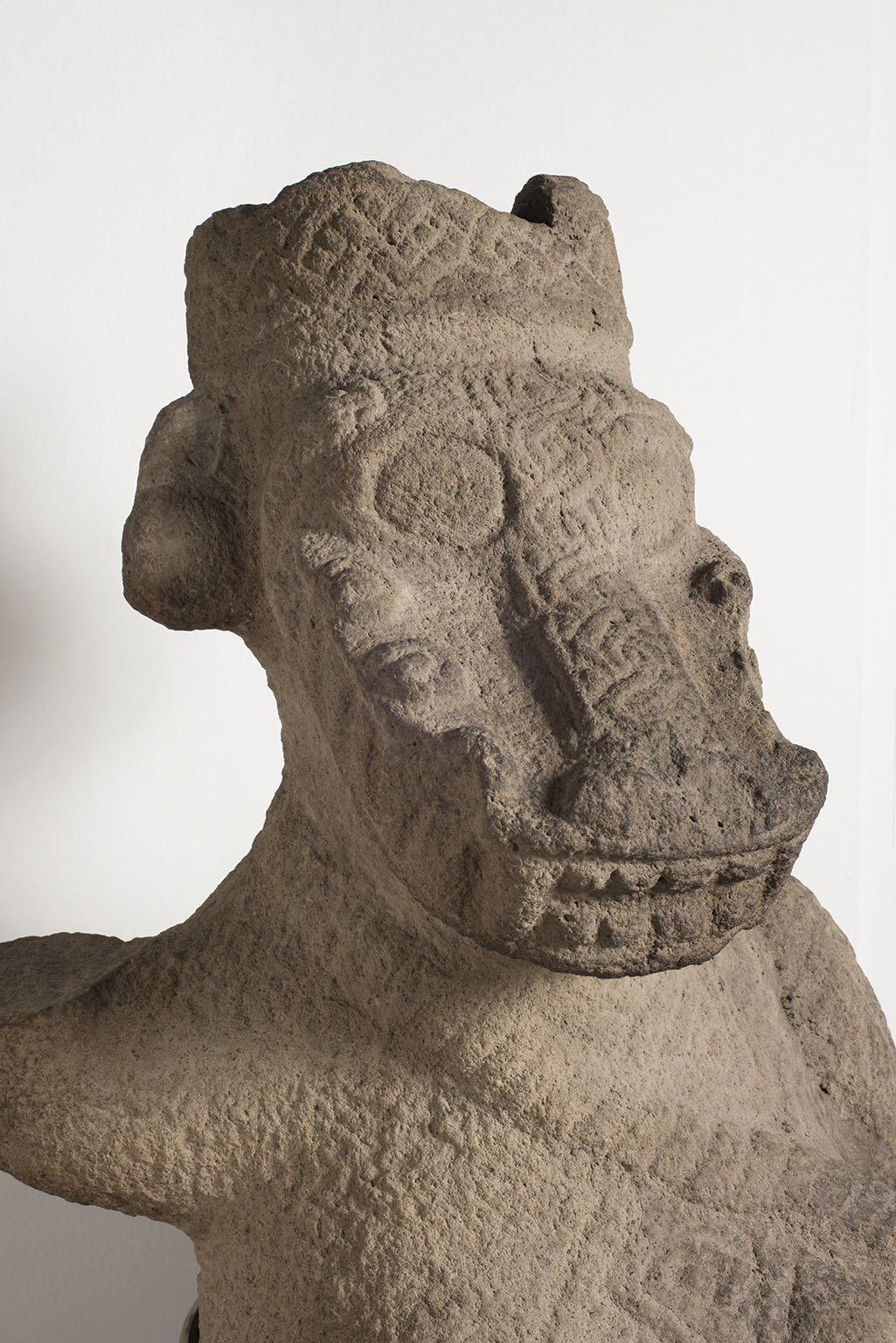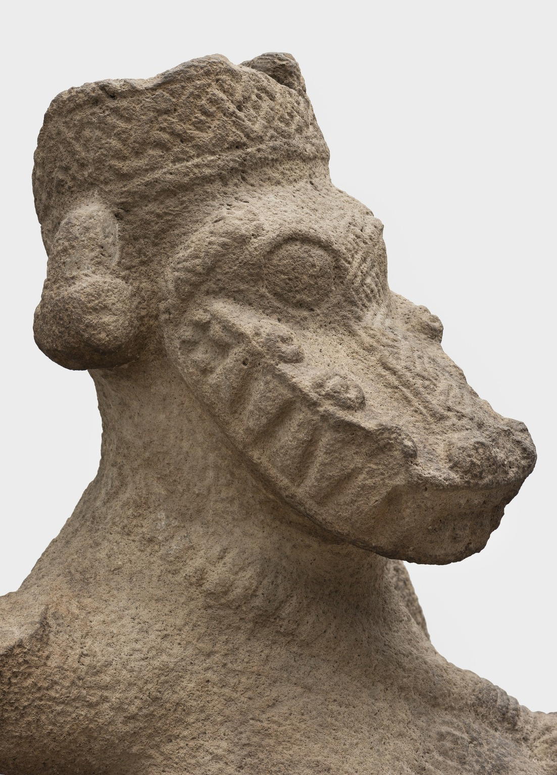 Central Caribbean. Human Figure Wearing Crocodile Mask, 700–1000. Vesicular (porous) andesite, 61 x 24 1/2 x 20 in., 631 lb. (154.9 x 62.2 x 50.8 cm, 286.22kg). Brooklyn Museum, Alfred W. Jenkins Fund, 34.5084. (Photo: Brooklyn Museum)