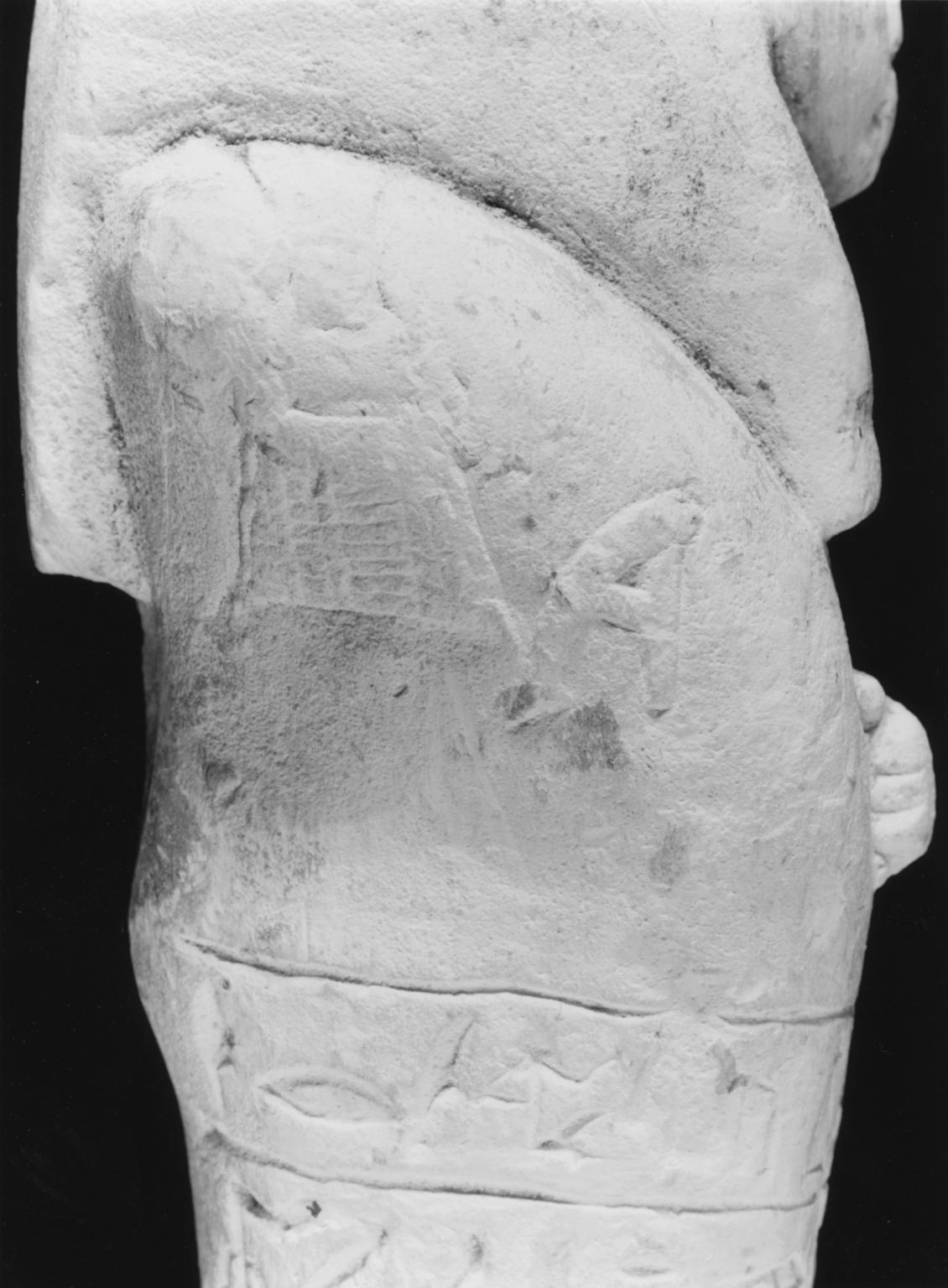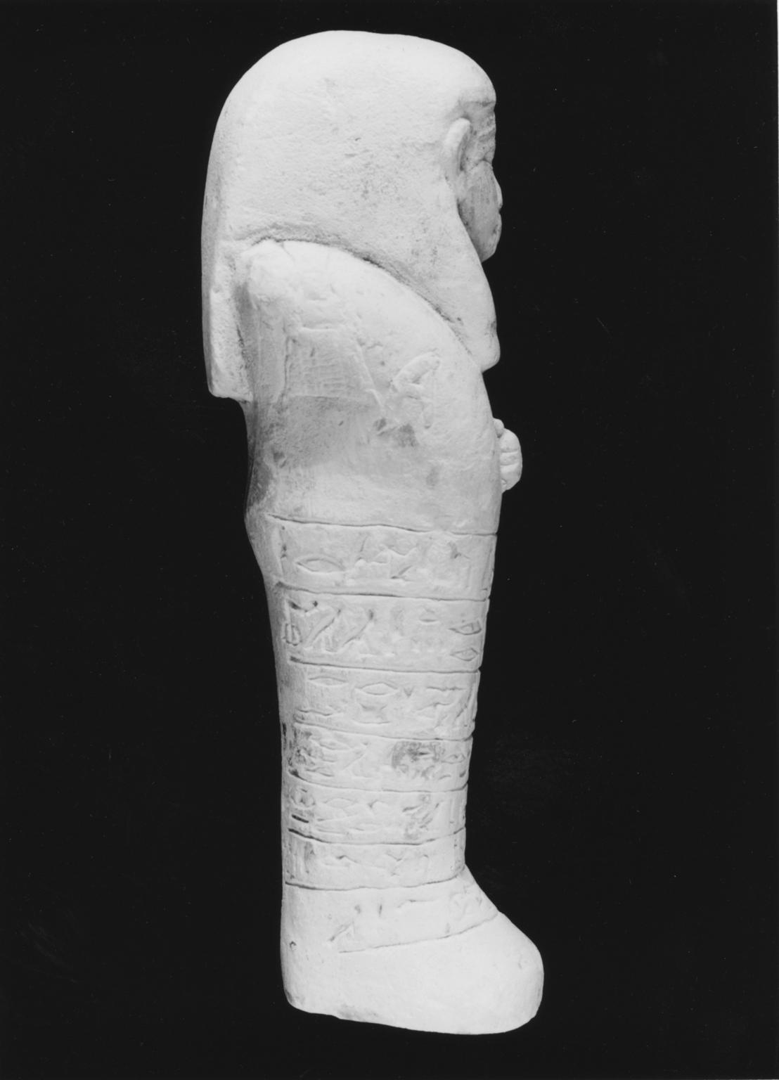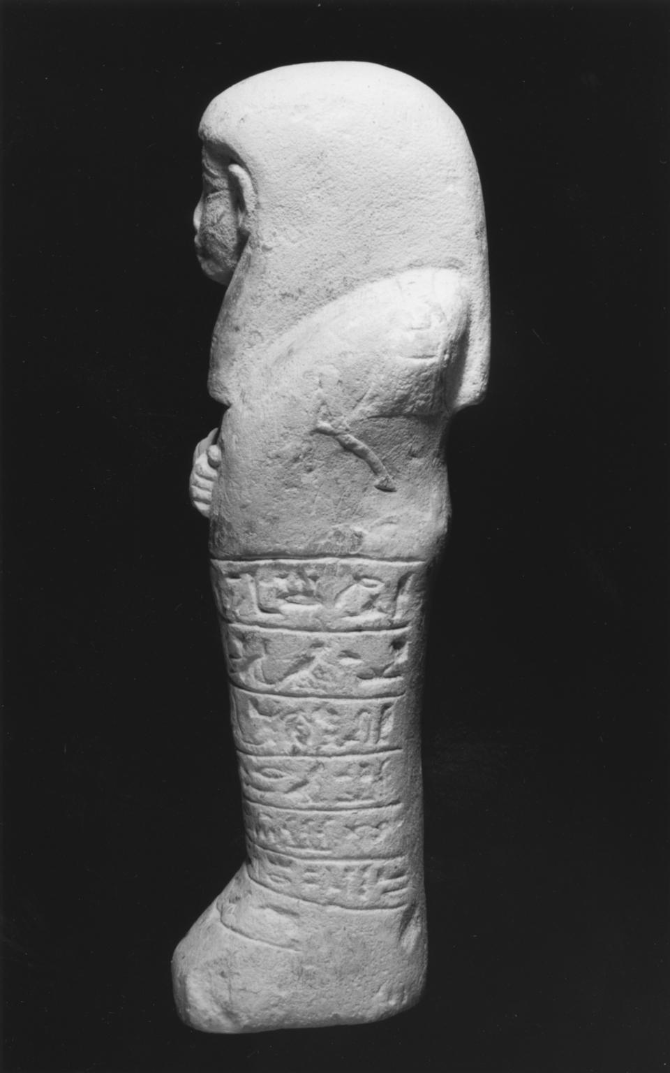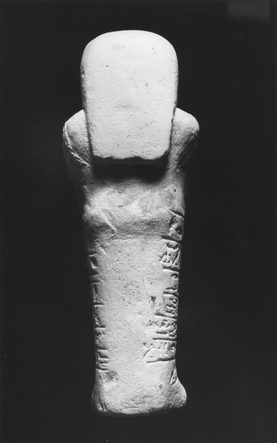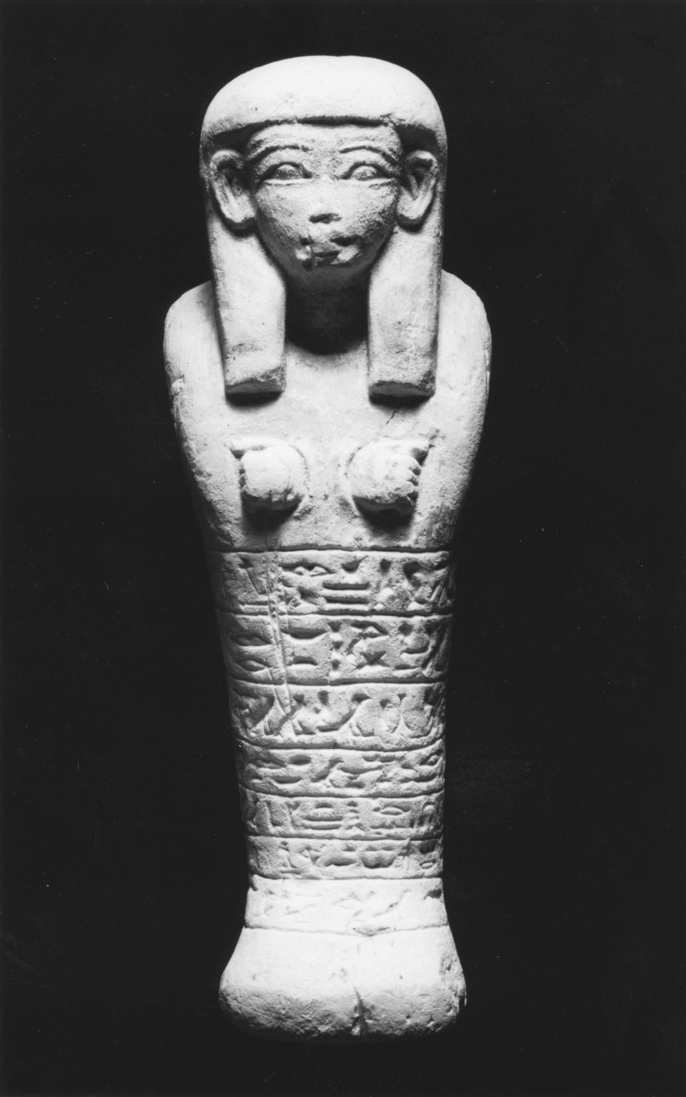 The Egyptians manufactured funerary figurines, originally called shabties, as early as Dynasty 12 (1932–1759 B.C.E.). The earliest shabties are inscribed with either the deceased’s name (see nos. 1 and 2) or a simple form of Chapter 6 of the Book of the Dead. The rarity and high quality of the early shabties suggest that they were costly items produced for privileged persons.