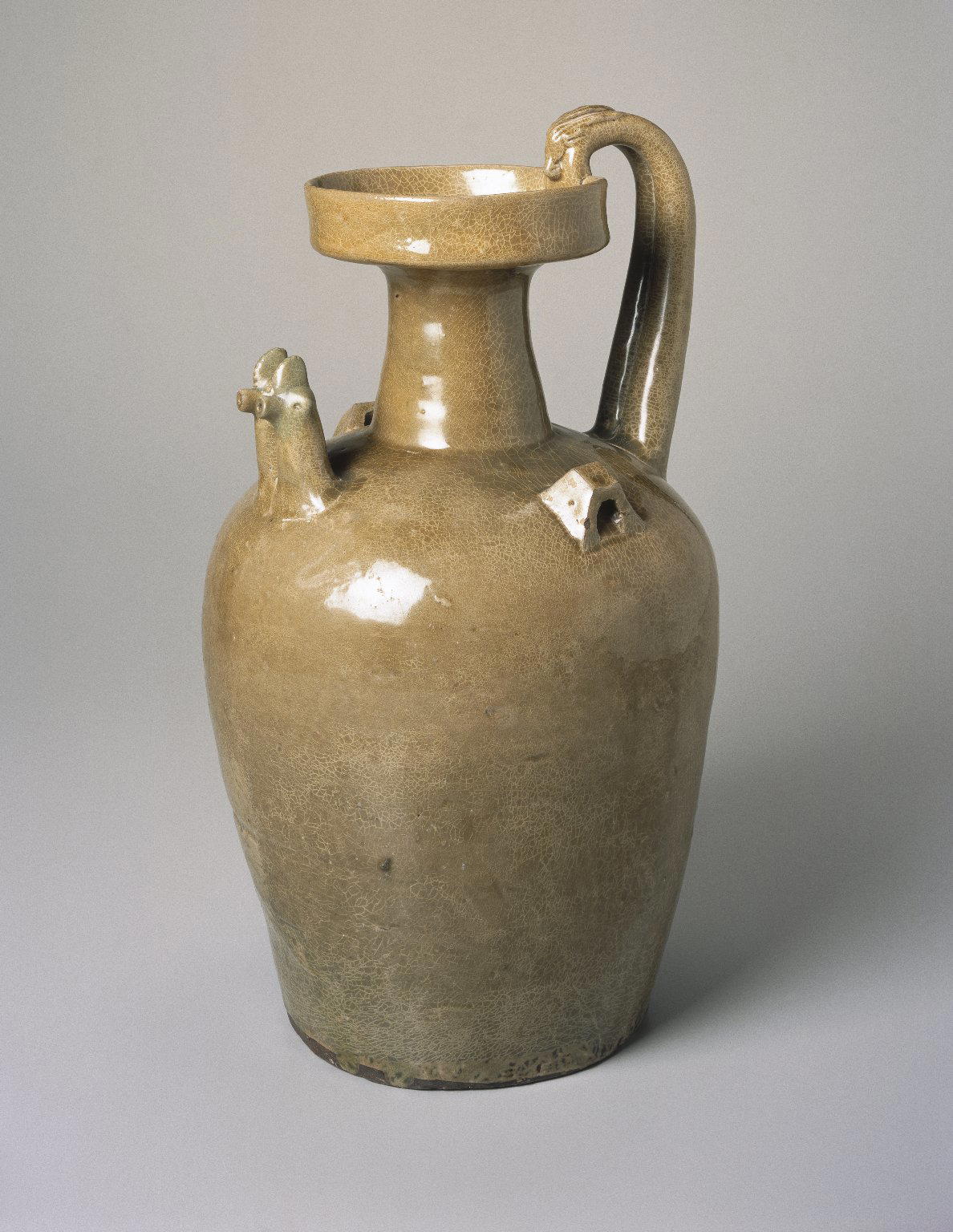 Especially during the ninth to eleventh centuries, Chinese connoisseurs prized high-fired green-glazed ceramics and compared their exquisite gray-green glazes to precious jade. Green-glazed ware, know generally as Yue ware but often called "celadon" in the West, was manufactured both for daily use and for burial. The Chicken-Headed Ewer was most likely produced as a burial good, and excavations have revealed comparable early examples in tombs from the fourth century to the seventh. The two spouts on the remarkable, tall Chicken-Headed Ewer are not functional, further identifying it as a burial object.