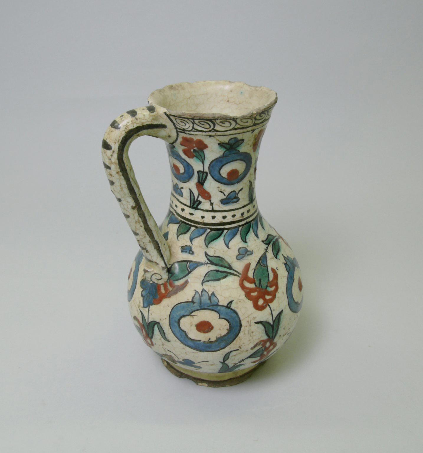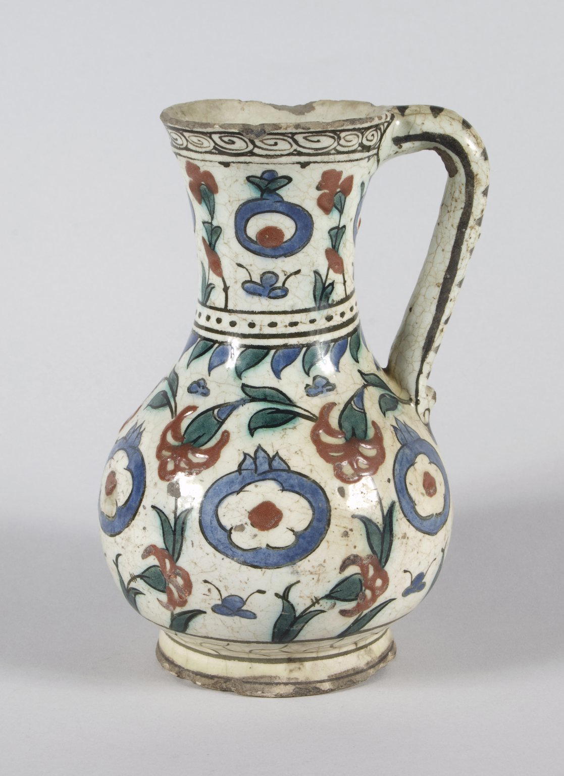 Jug, 17th century. Ceramic; fritware, painted in black, cobalt blue, green, and red on a white slip ground under a transparent glaze, 8 3/8 x 5 1/2 in. (21.3 x 14 cm) Diameter at mouth: 3 1/8 in. (8 cm). Brooklyn Museum, Brooklyn Museum Collection, 34.6030. (Photo: Brooklyn Museum)