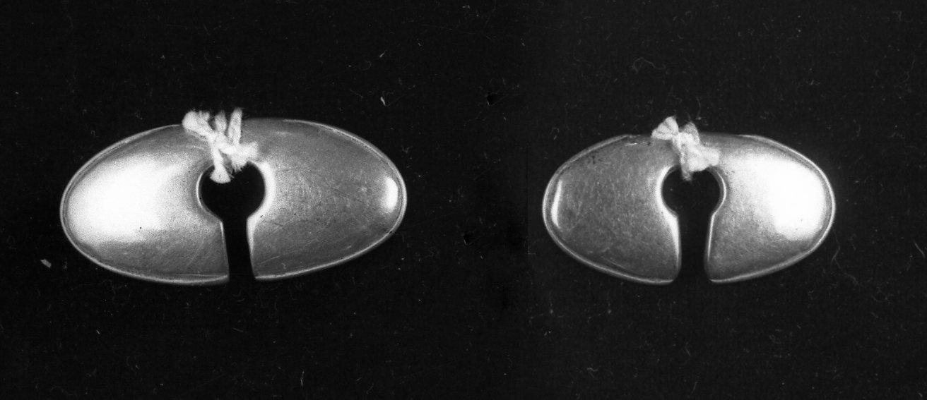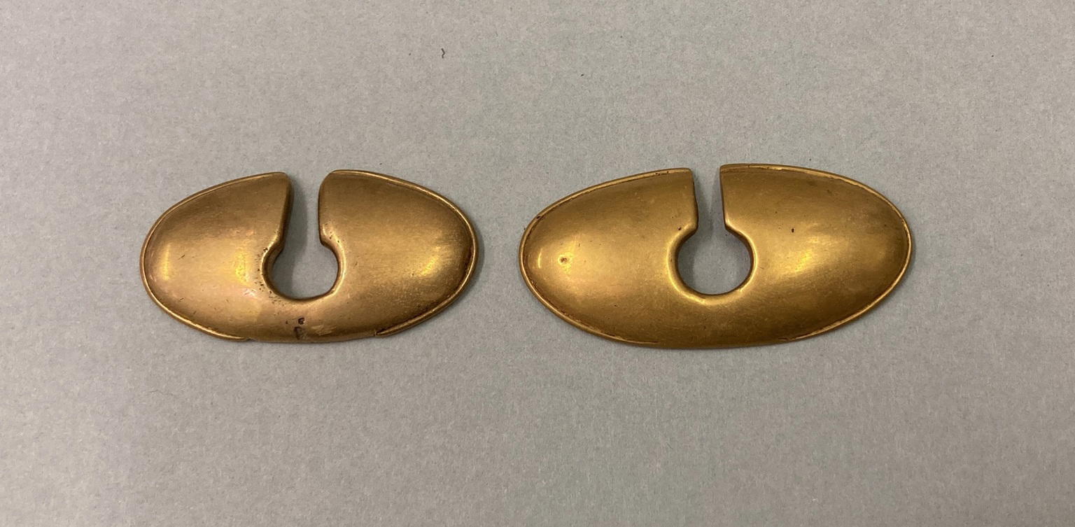 Quimbaya. Nose Ornaments, 300 BCE–700 CE. Gold, a: 1 × 1 13/16 × 1/8 in. (2.5 × 4.6 × 0.3 cm) b: 1 × 2 3/16 × 1/8 in. (2.5 × 5.6 × 0.3 cm). Brooklyn Museum, Alfred W. Jenkins Fund, 35.194a-b. (Photo: Brooklyn Museum)