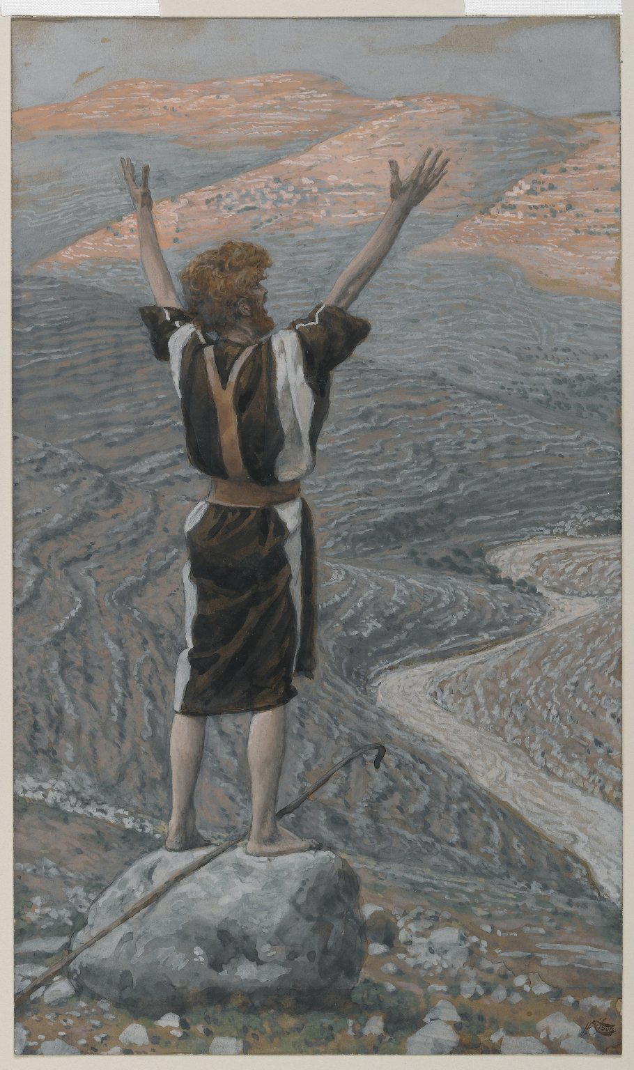 James Tissot (Nantes, France, 1836–1902, Chenecey–Buillon, France). The Voice in the Desert (La voix dans le désert), 1886–1894. Opaque watercolor over graphite on gray wove paper, Image: 11 7/16 x 6 11/16 in. (29.1 x 17 cm) Sheet: 11 7/16 x 6 11/16 in. (29.1 x 17 cm) Frame: 20 x 15 x 1 1/2 in. (50.8 x 38.1 x 3.8 cm). Brooklyn Museum, Purchased by public subscription, 00.159.44. (Photo: Brooklyn Museum)