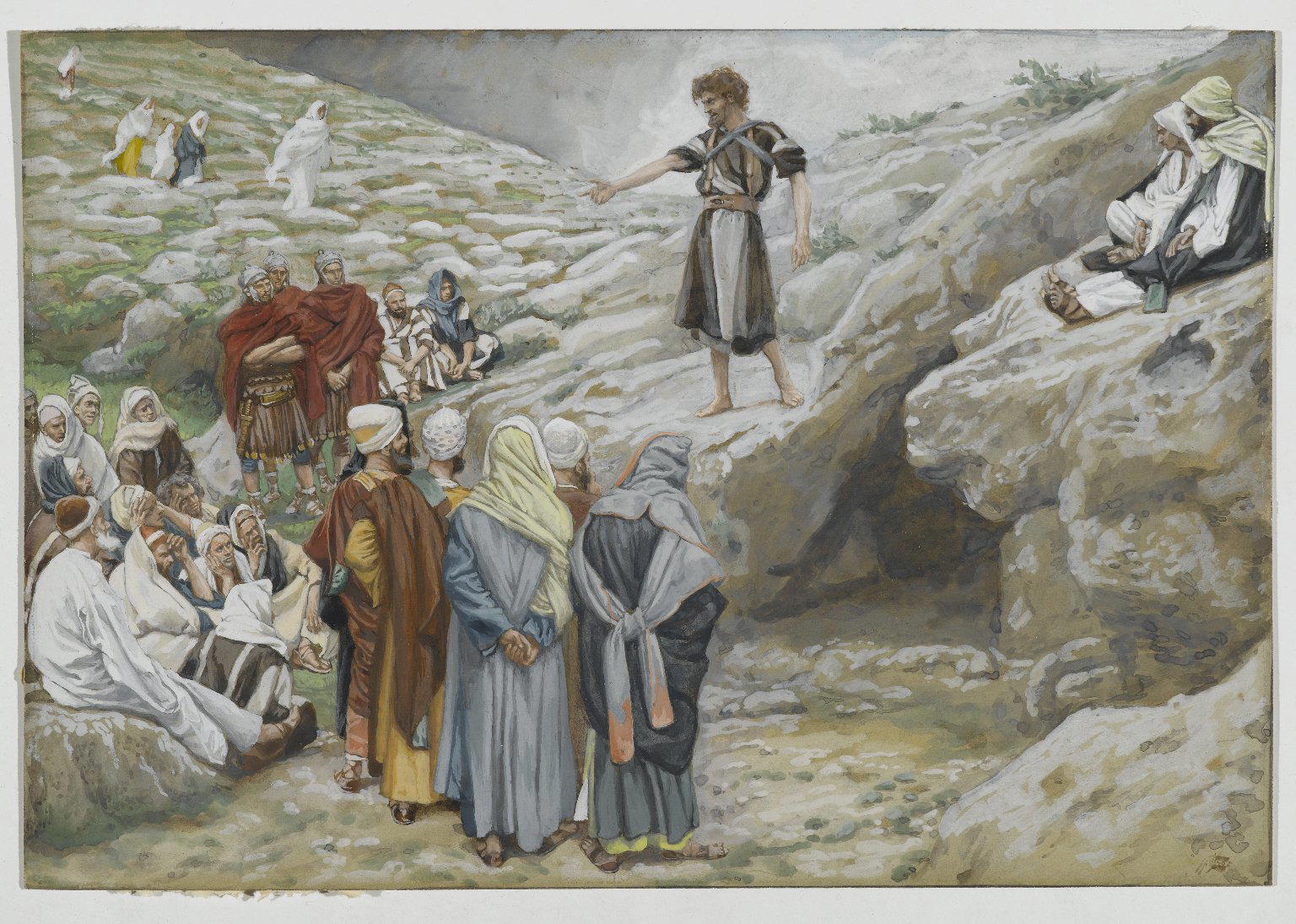 James Tissot (Nantes, France, 1836–1902, Chenecey–Buillon, France). Saint John the Baptist and the Pharisees (Saint Jean-Baptiste et les pharisiens), 1886–1894. Opaque watercolor over graphite on gray wove paper, Image: 6 3/16 x 9 1/16 in. (15.7 x 23 cm) Sheet: 6 3/16 x 9 1/16 in. (15.7 x 23 cm). Brooklyn Museum, Purchased by public subscription, 00.159.47. (Photo: Brooklyn Museum)