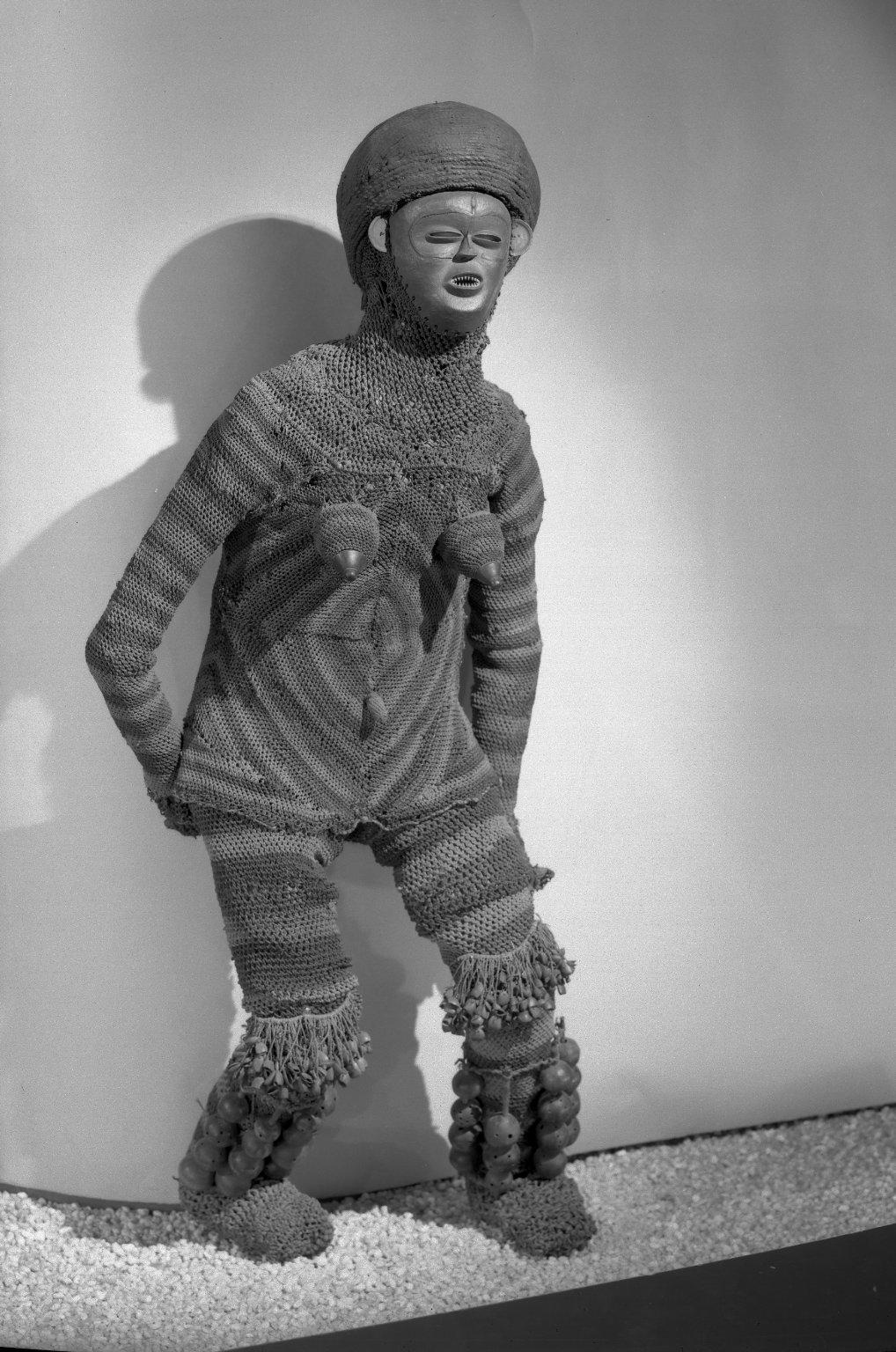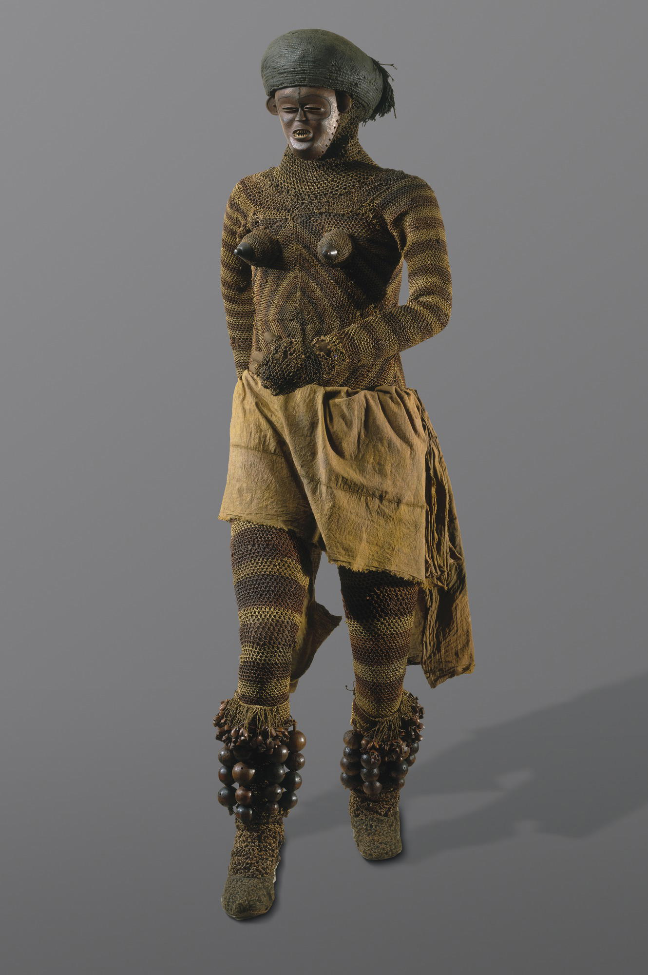 Luvale; or Chokwe. Likishi Dance Costume Shirt and Head Cover with Pwo Mask, late 19th or early 20th century. Fiber, wood, seedpods, hide, metal, 40 1/2 x 8 1/2 in. (102.9 x 21.6 cm). Brooklyn Museum, Museum Collection Fund, 36.548. (Photo: Brooklyn Museum)
