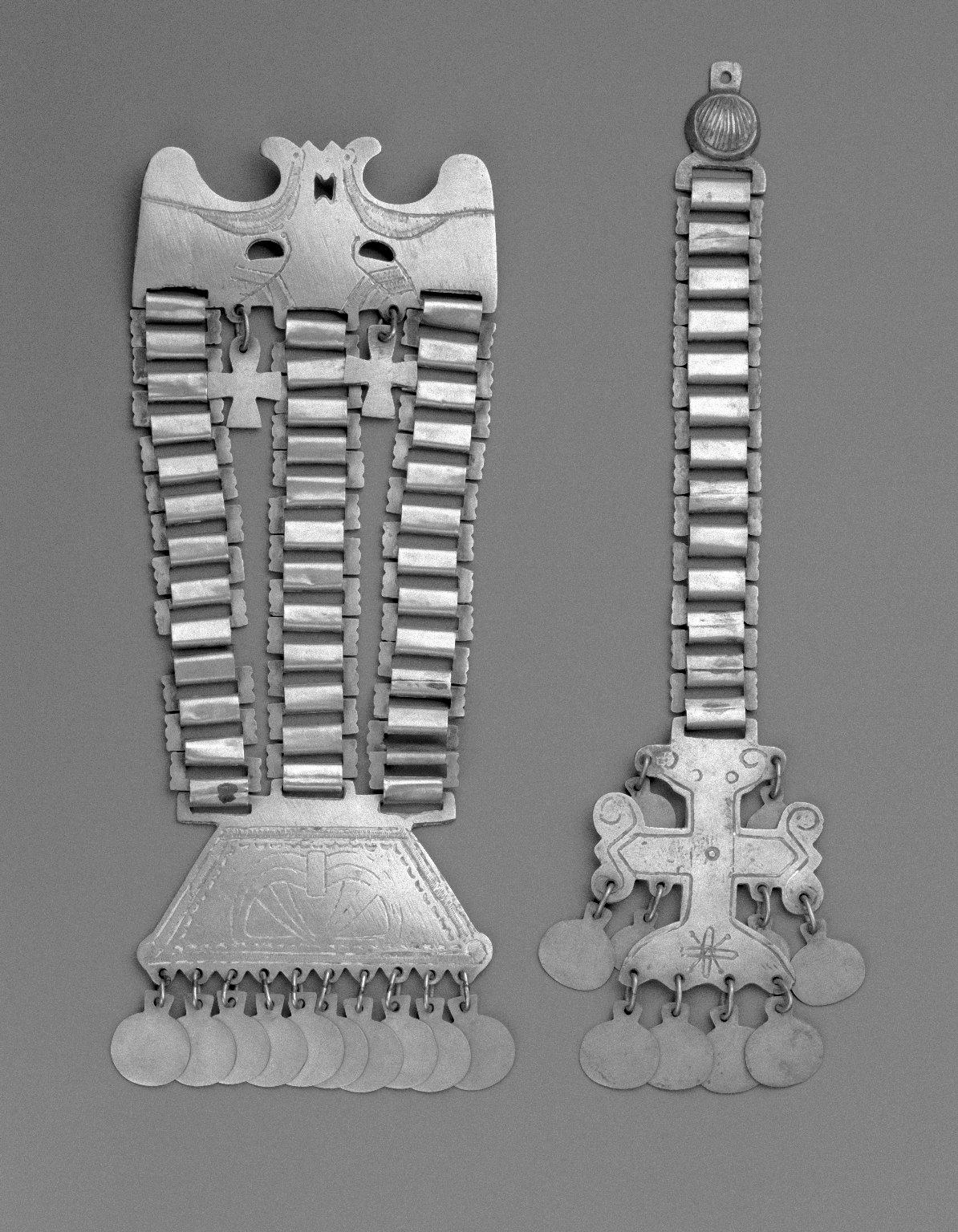 Mapuche. Woman's Breast Ornaments, late 19th–early 20th century. Silver, a: 11 x 4 3/16 in. (27.9 x 10.6 cm.) b: 11 7/8 x 2 5/8 in. (30.2 x 6.7 cm.). Brooklyn Museum, Ella C. Woodward Memorial Fund, 36.929a-b. (Photo: Brooklyn Museum)