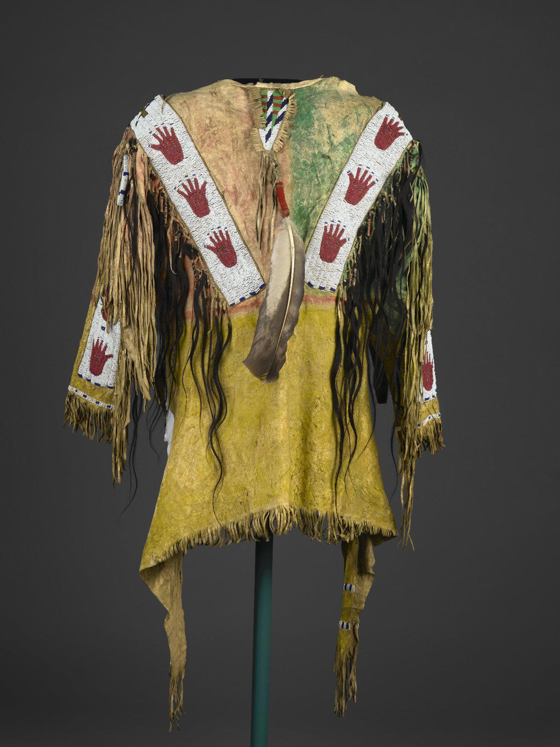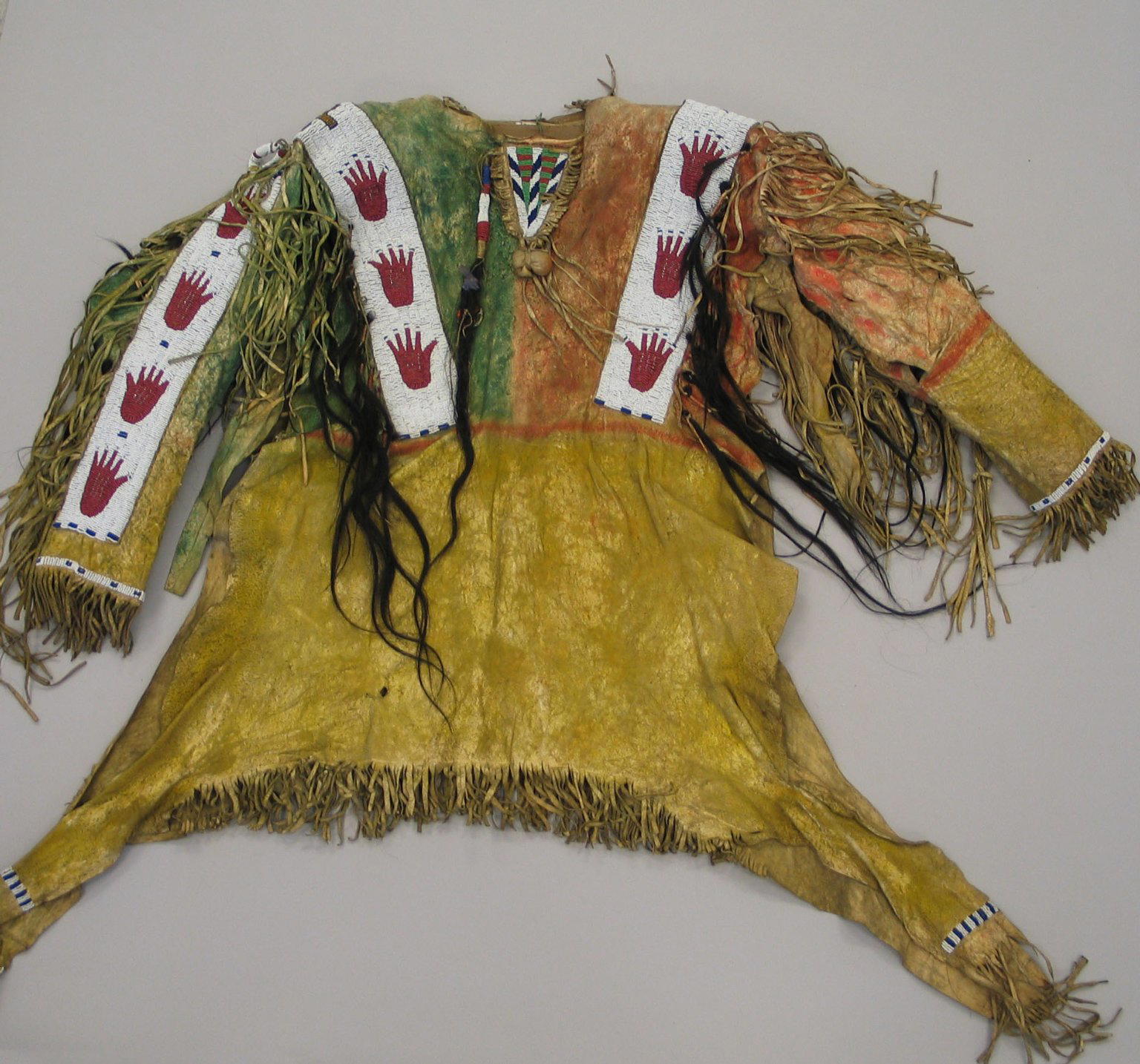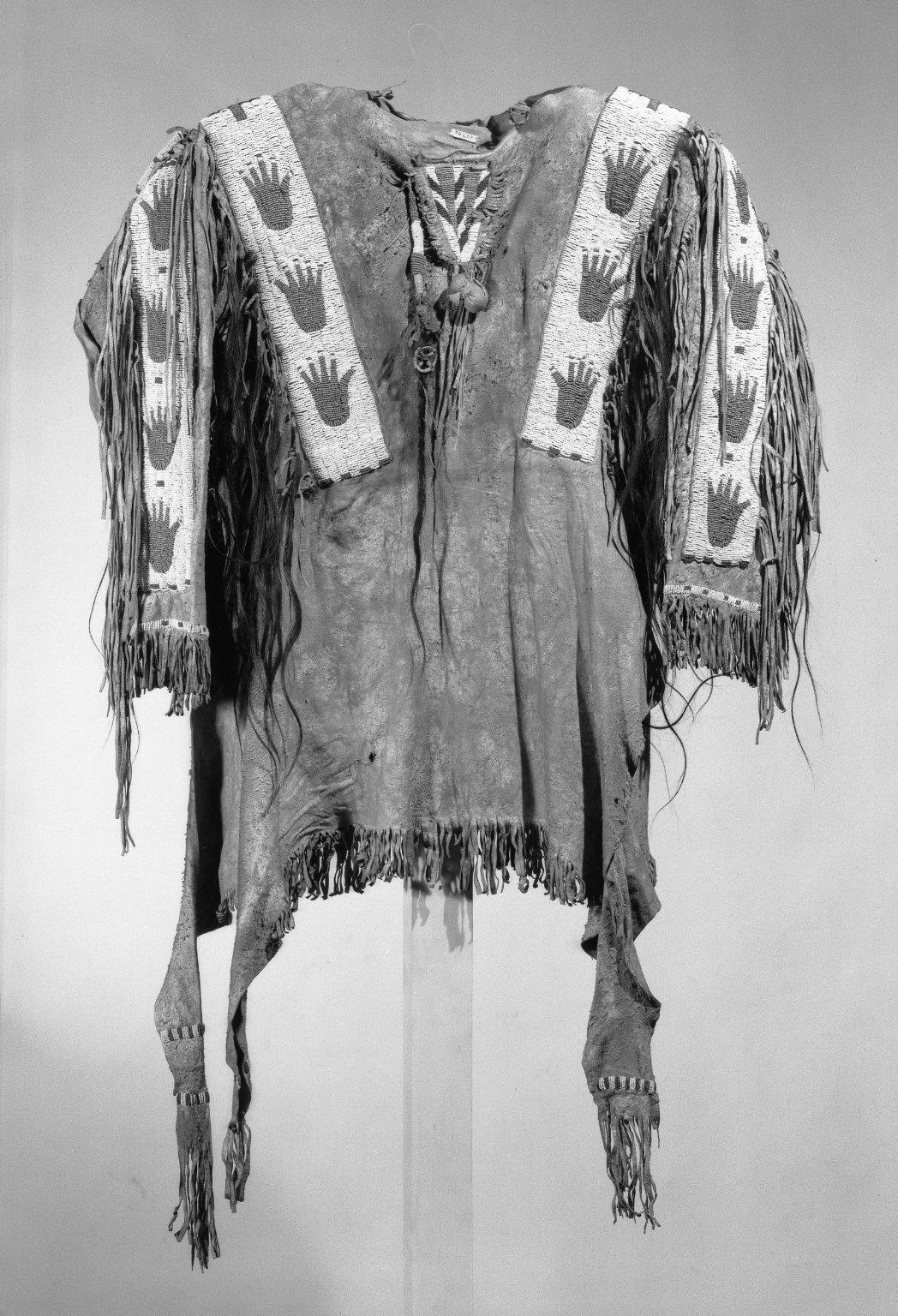 Sioux. Decorated Shirt, 1801–1900. Buckskin, pigment, beads, hair, feather, fiber, 46 x 67 x 5 in. (116.8 x 170.2 x 12.7 cm). Brooklyn Museum, Dick S. Ramsay Fund, 38.629. (Photo: Brooklyn Museum)