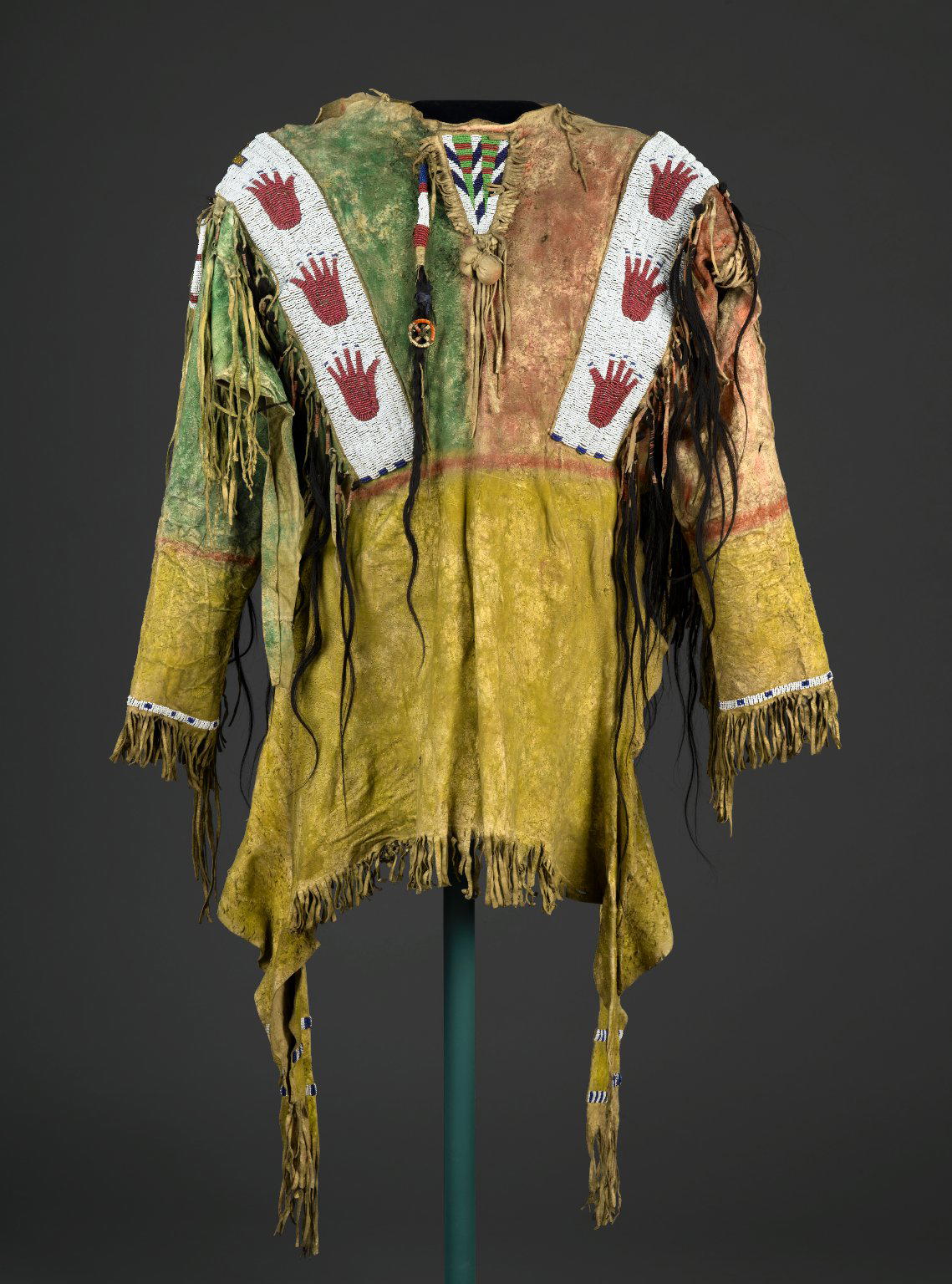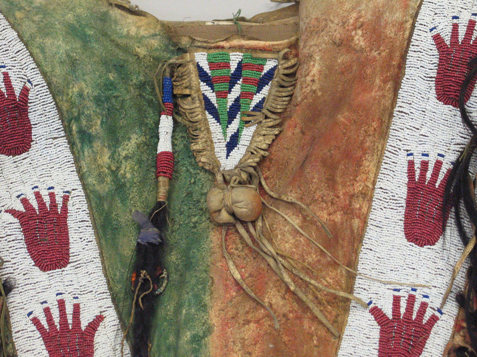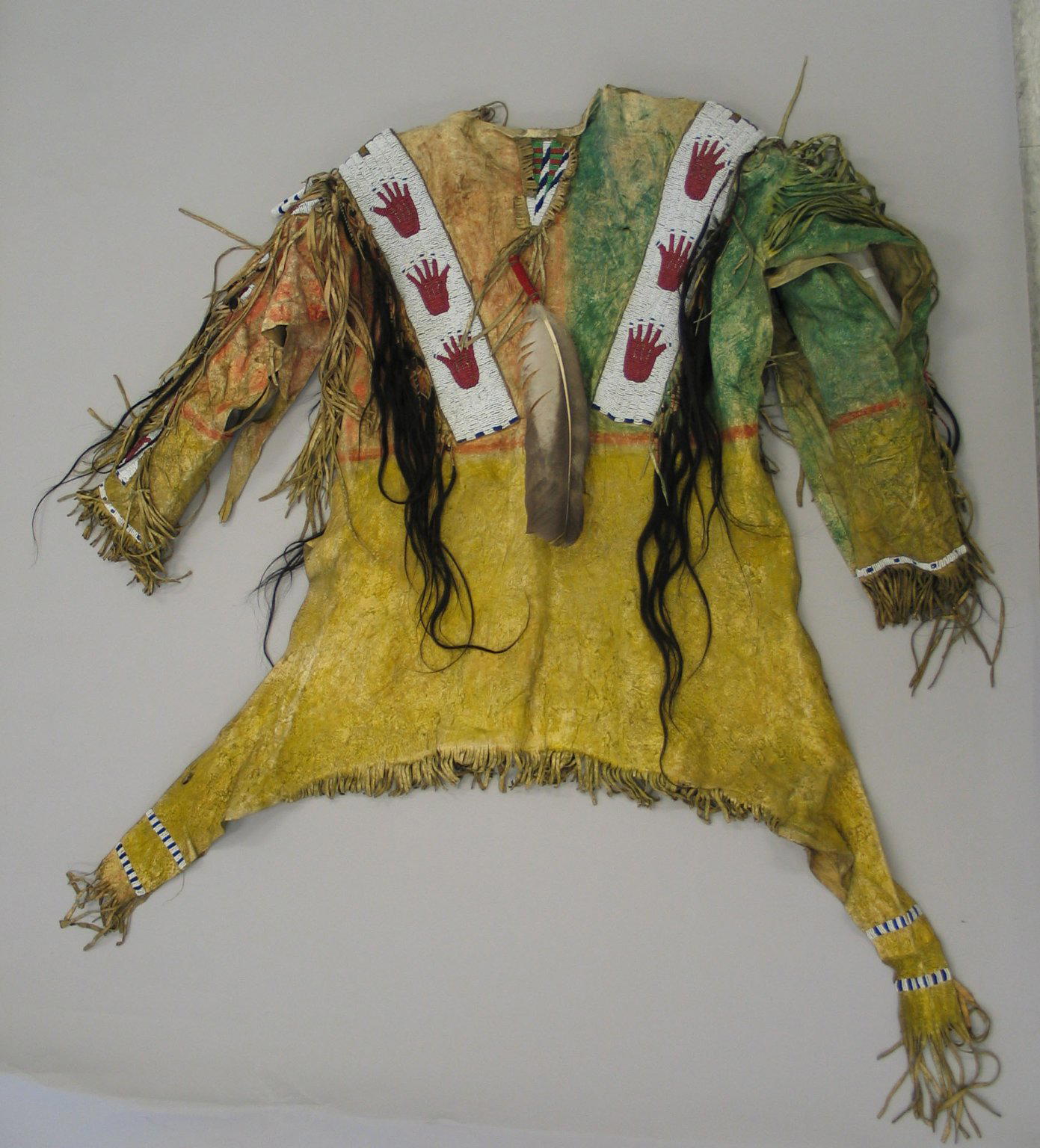 Sioux. Decorated Shirt, 1801–1900. Buckskin, pigment, beads, hair, feather, fiber, 46 x 67 x 5 in. (116.8 x 170.2 x 12.7 cm). Brooklyn Museum, Dick S. Ramsay Fund, 38.629. (Photo: Brooklyn Museum)
