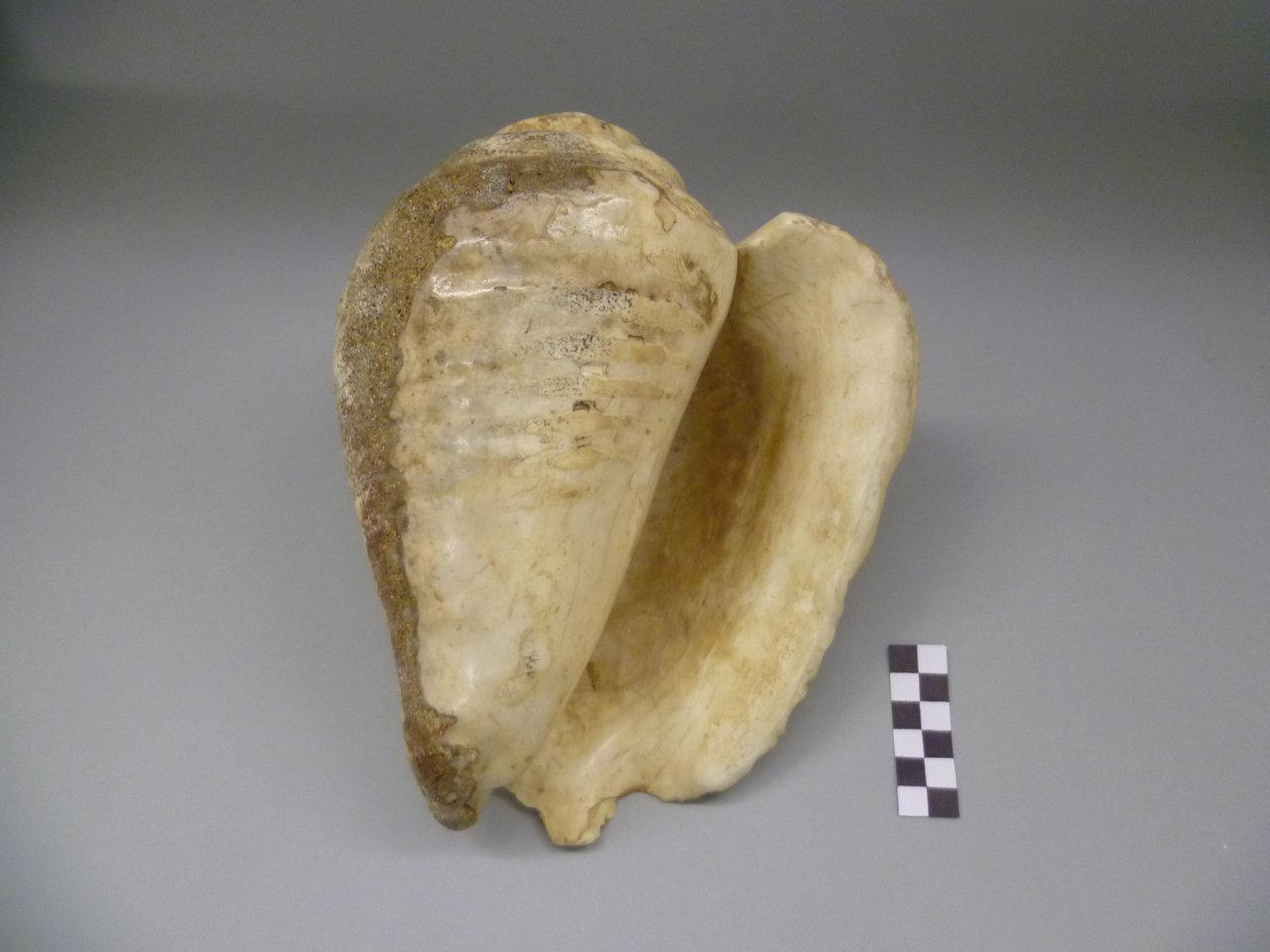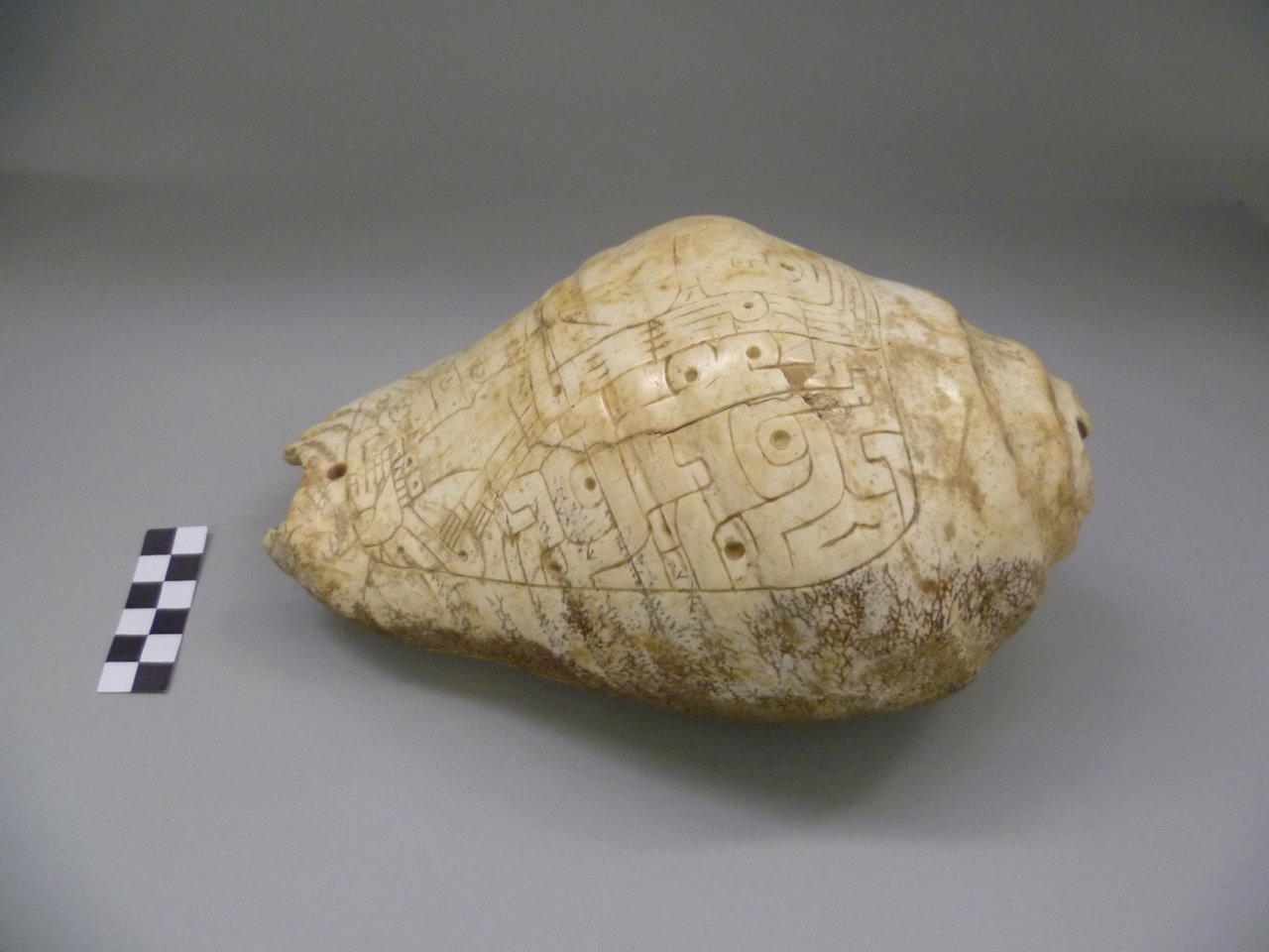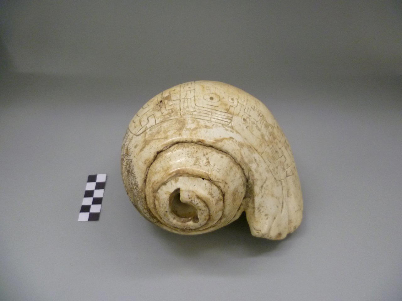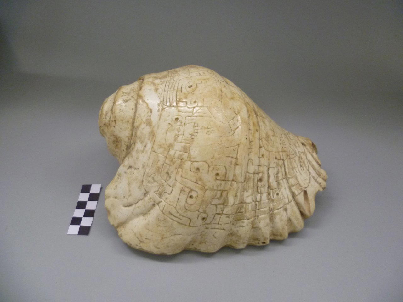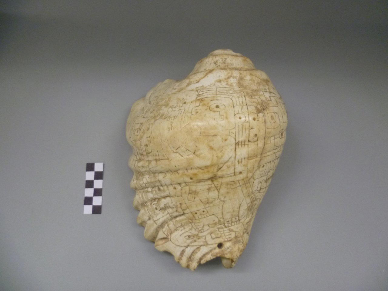 Yes! Conch shells have a natural form that allows them to be played as a horn. It is even decoration with an incised drawing of a human figure blowing a shell trumpet. Shells were an important trade item for the Chavin, a major pre-Incan culture in Peru. Shells brought in from the coast were also worn as ornaments, or ground to make a powder chewed with coca leaves.What is this and what is it used for?