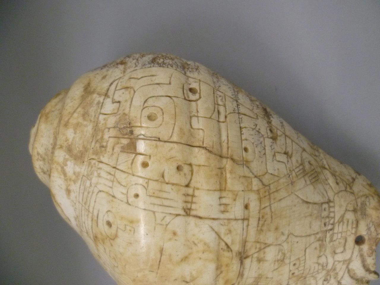 Chavin. Incised Strombus-Shell Trumpet, 400–200 B.C.E.. Strombus shell, 11 1/4 x 7 1/8 x 11 1/4 in. (28.6 x 18.1 x 28.6 cm). Anonymous Loan, L52.1. (Photo: Brooklyn Museum)