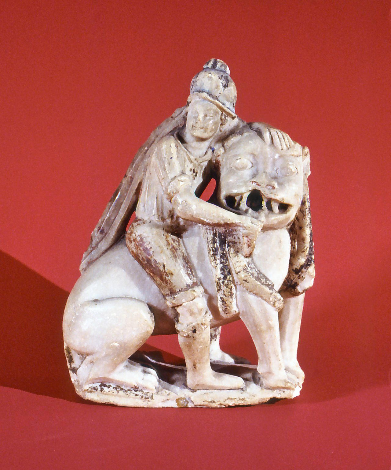 Man subjugating lion, Stone; Huamanga stone, 7 x 1/16 x 5 1/8 x 2 3/8 in. Brooklyn Museum, Museum Expedition 1941, Frank L. Babbott Fund, 41.1275.205. (Photo: Brooklyn Museum)