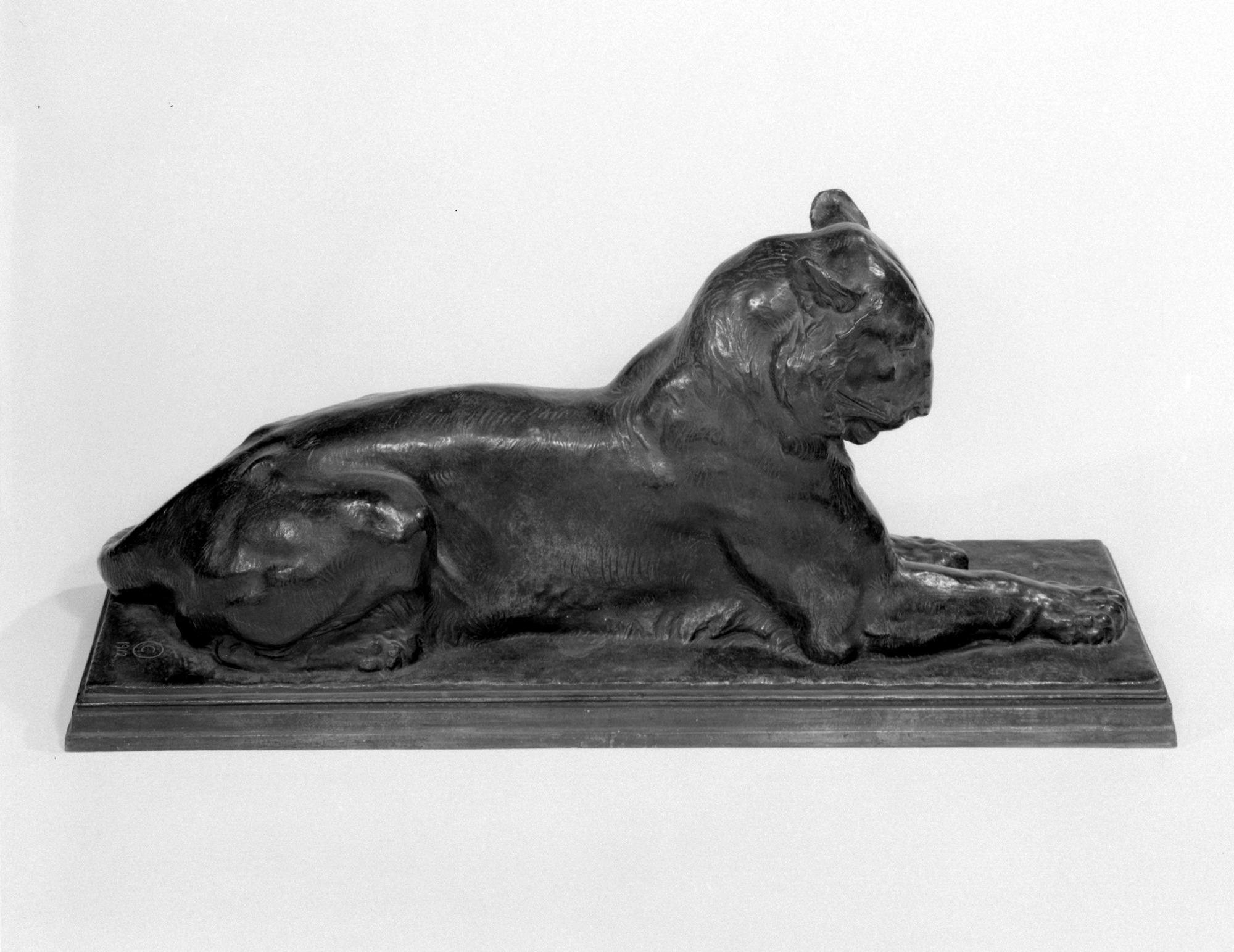 Inscribed on base along proper left side of tiger: "A. PHIMISTER PROCTOR" Inscribed on base at proper right rear corner: " © / 1912"