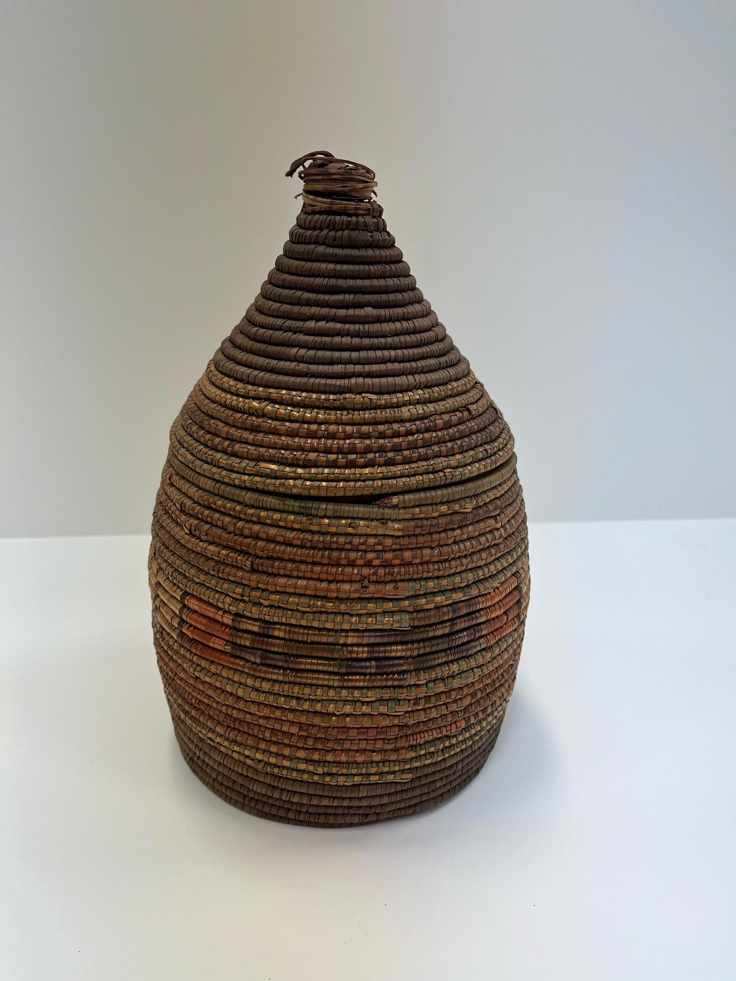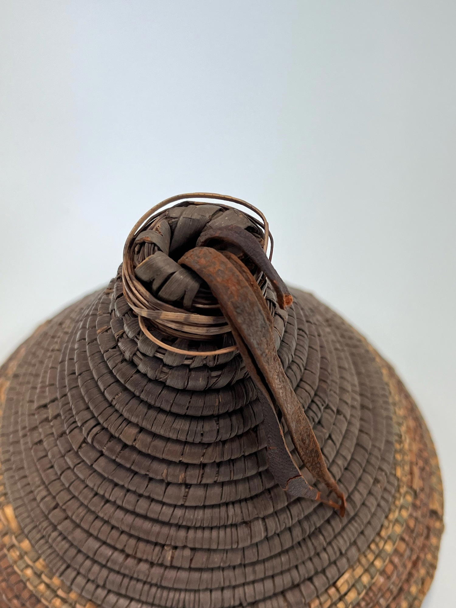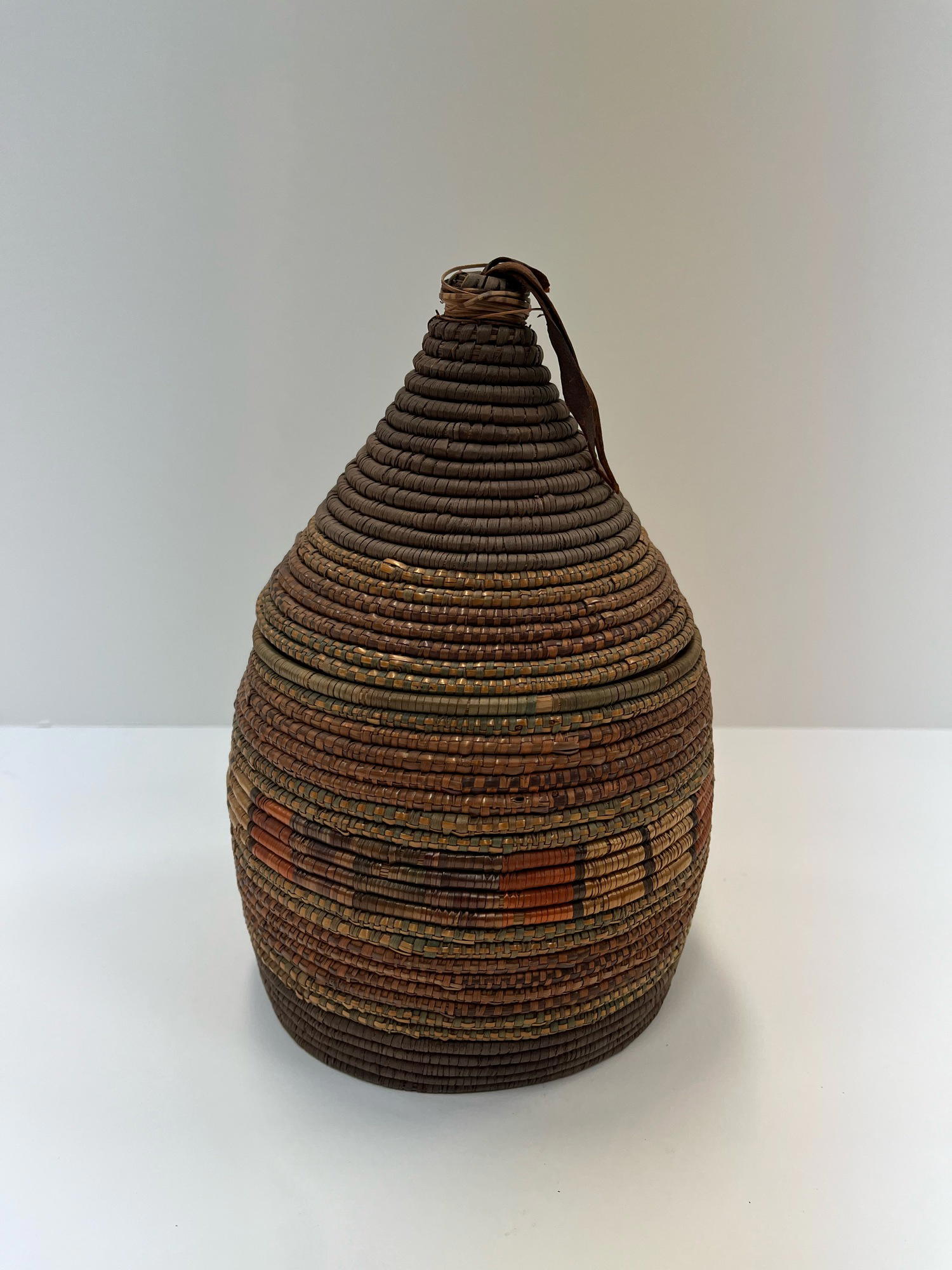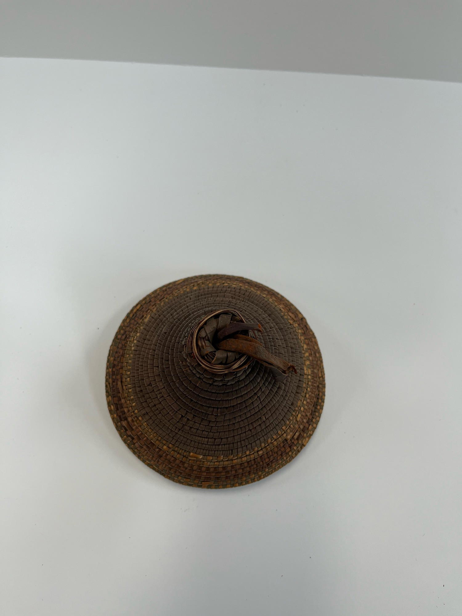 Coiled Basket with Lid, Vegetable fiber, leather, overall: 5 1/8 × 5 1/8 × 5 7/8 in. (13 × 13 × 15 cm) base: 5 1/8 × 5 7/8 × 5 1/8 in. (13 × 15 × 13 cm) lid: 4 1/2 × 5 1/8 × 4 1/2 in. (11.5 × 13 × 11.5 cm). Brooklyn Museum, Anonymous gift in memory of Dr. Harlow Brooks, 43.201.302a-b. (Photo: Brooklyn Museum)