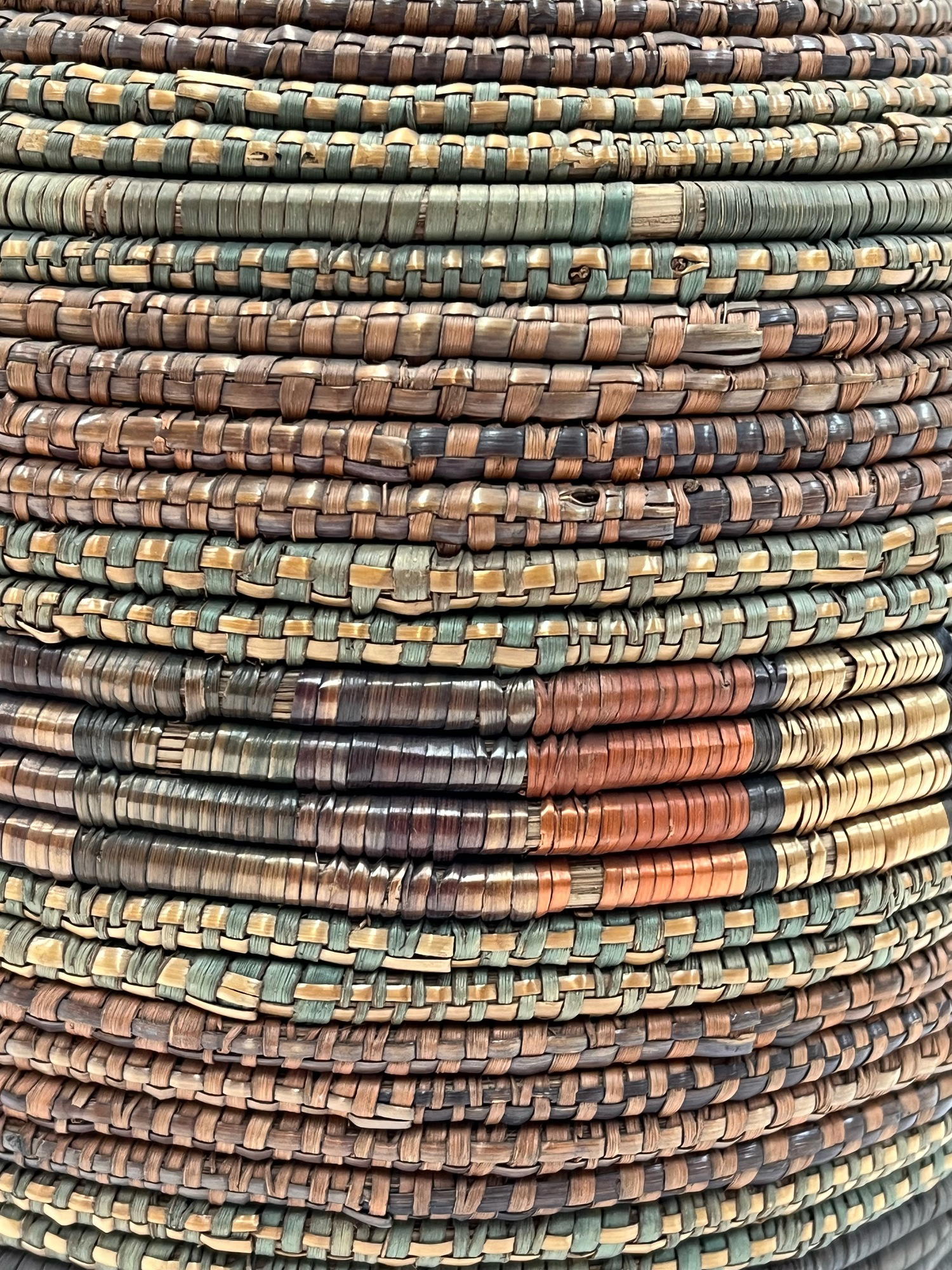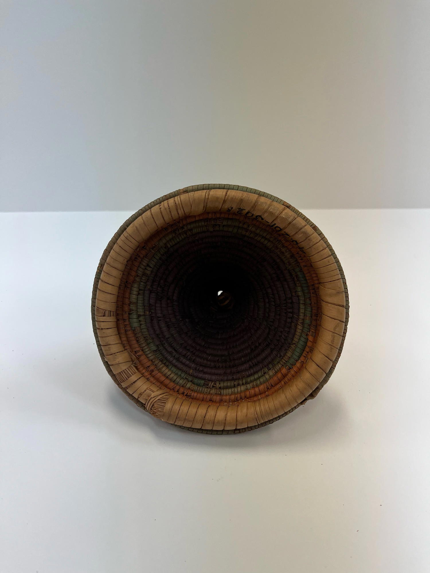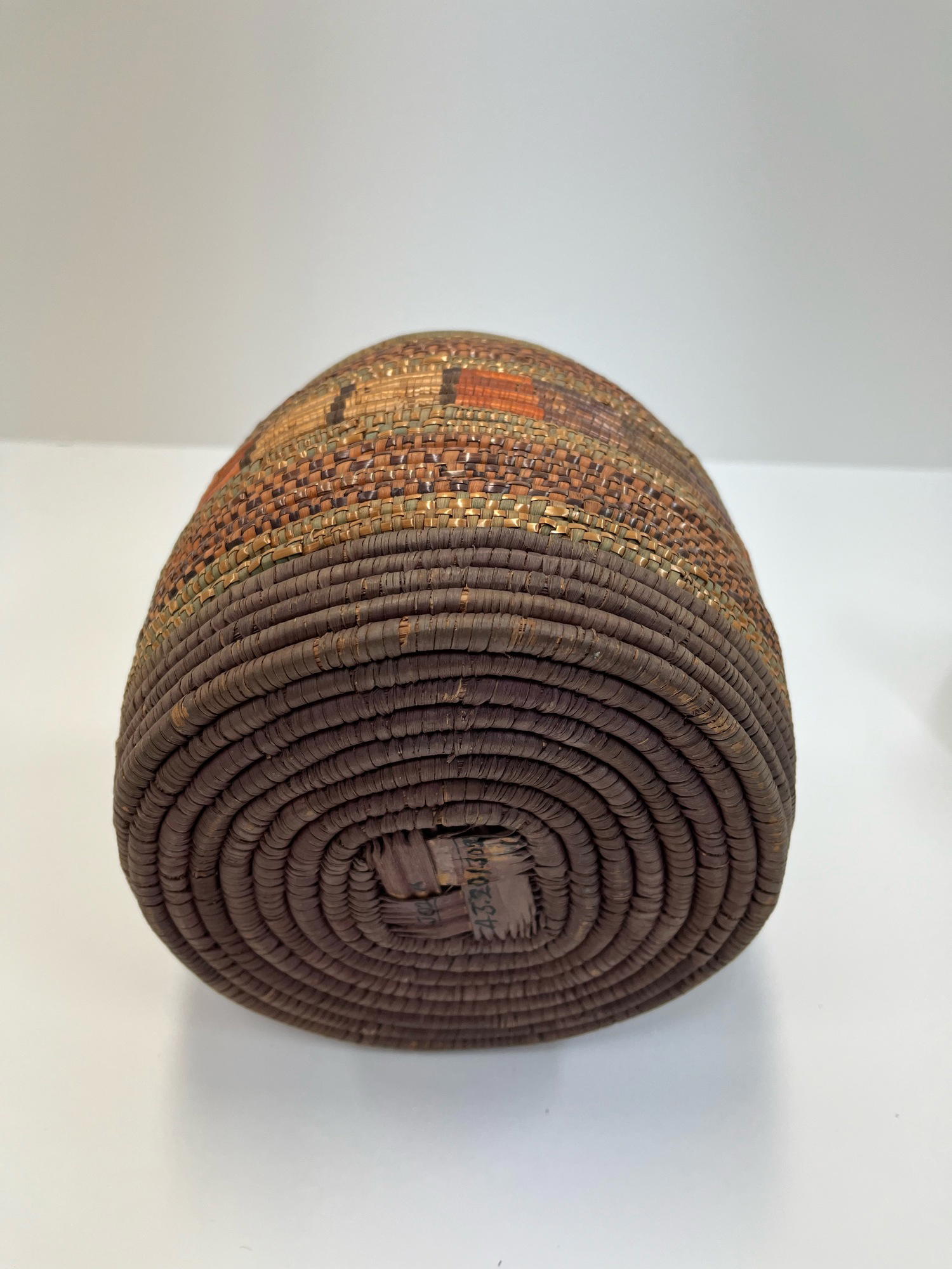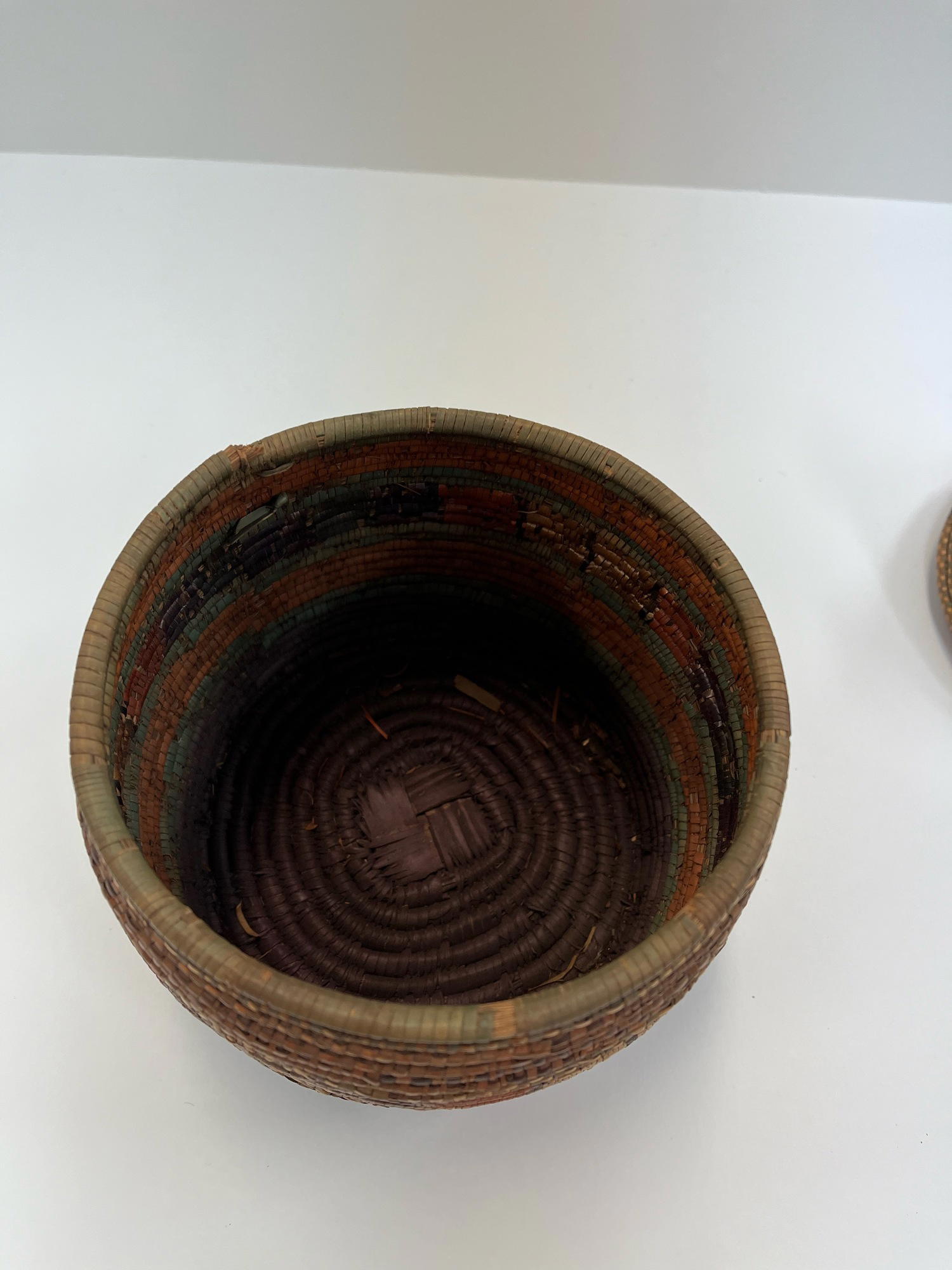 Coiled Basket with Lid, Vegetable fiber, leather, overall: 5 1/8 × 5 1/8 × 5 7/8 in. (13 × 13 × 15 cm) base: 5 1/8 × 5 7/8 × 5 1/8 in. (13 × 15 × 13 cm) lid: 4 1/2 × 5 1/8 × 4 1/2 in. (11.5 × 13 × 11.5 cm). Brooklyn Museum, Anonymous gift in memory of Dr. Harlow Brooks, 43.201.302a-b. (Photo: Brooklyn Museum)