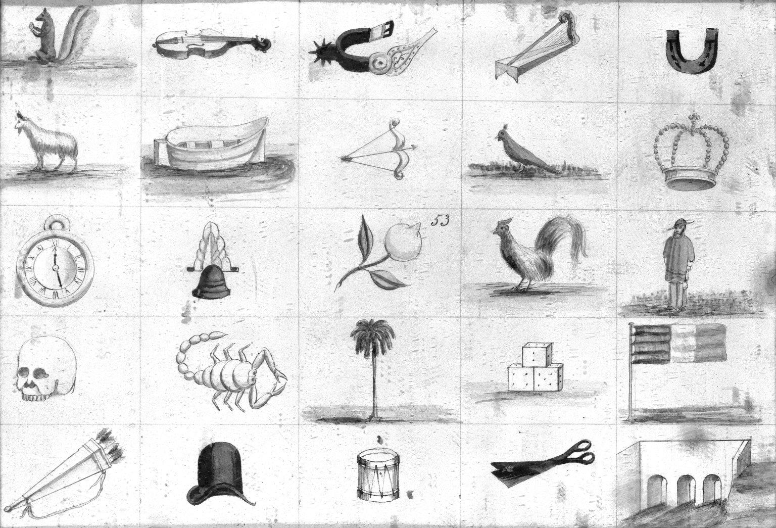 Game of Lotto (Cards and Discs), 1880s. Tin, glass, card: 10 3/4 x 7 5/16 in. (27.3 x 18.5 cm) disk diameter: 1 3/8 in. (3.5 cm). Brooklyn Museum, Museum Expedition 1944, Purchased with funds given by the Estate of Warren S.M. Mead, 44.195.6. (Photo: Brooklyn Museum)