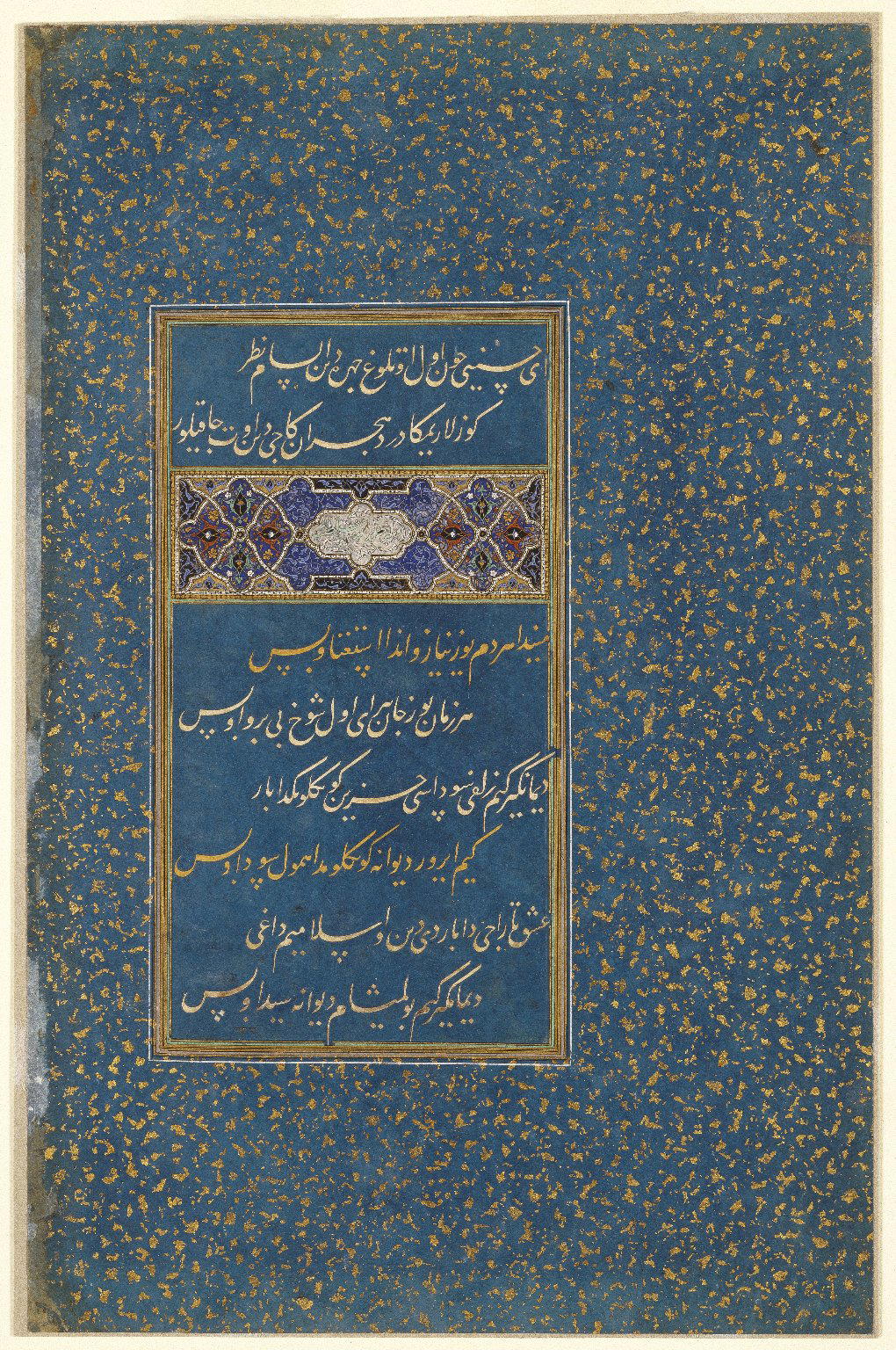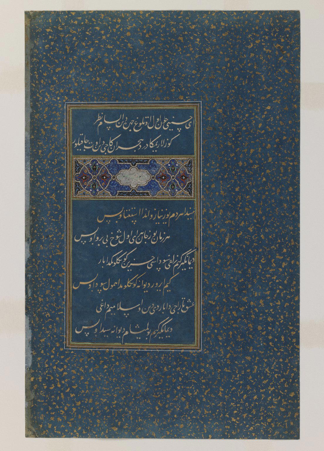 Attributed to Sultan 'Ali Mashhadi (Persian, 1442–1519). Folio of Poetry From the Divan of Sultan Husayn Mirza, ca. 1490. Ink, opaque watercolors, and gold on indigo blue ground, with découpage and gold-flecked border, 8 7/8 x 5 1/4 in. (22.5 x 13.3 cm). Brooklyn Museum, Ella C. Woodward Memorial Fund, 45.4.3. (Photo: Brooklyn Museum)