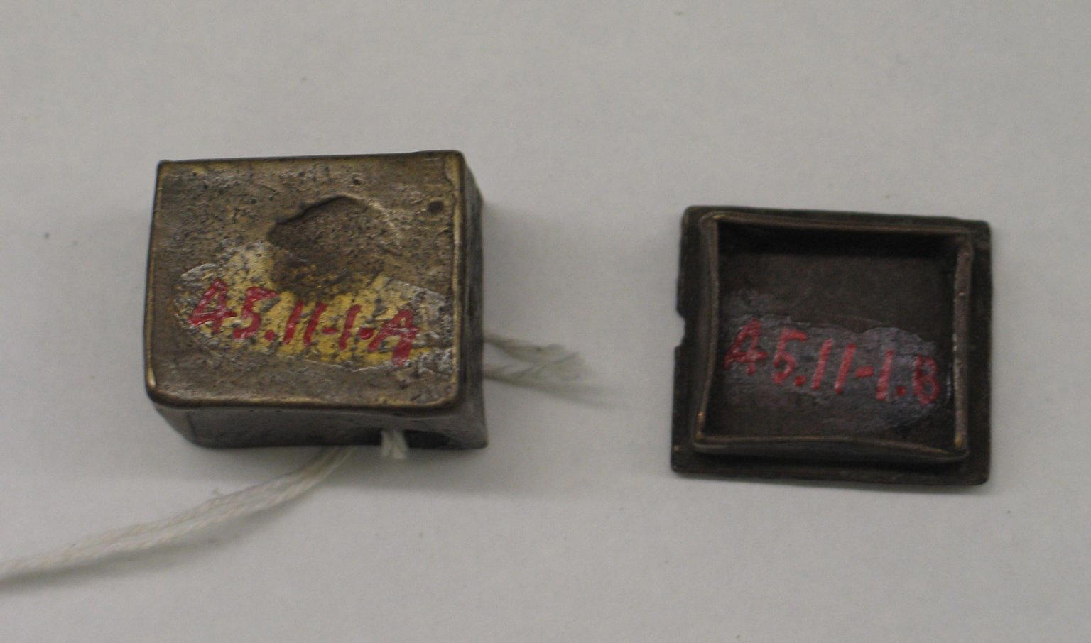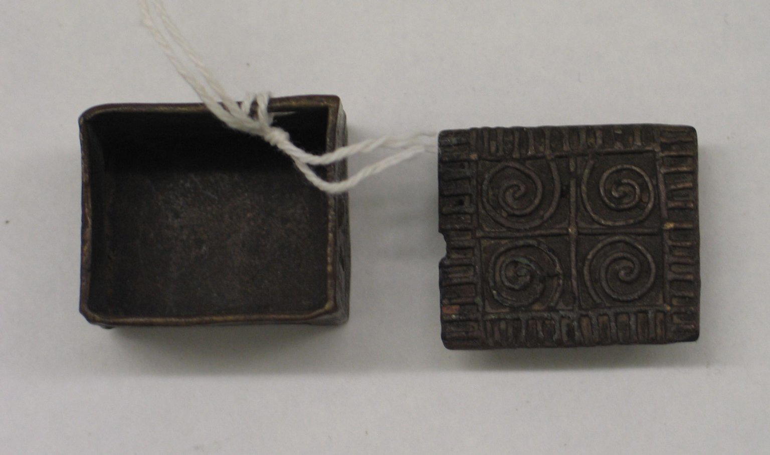 Akan. Small Box with Cover, 19th century. Copper alloy, A: 7/8 x 1 1/8 x 13/16 in. (2.2 x 2.8 x 2 cm) B: 1 x 1 1/8 x 1/4 in. (2.5 x 2.9 x 0.7 cm). Brooklyn Museum, Carll H. de Silver Fund, 45.11.1a-b. (Photo: Brooklyn Museum)