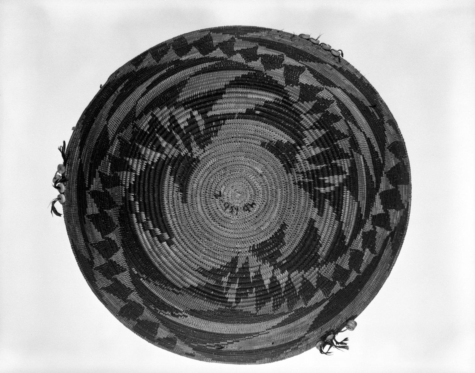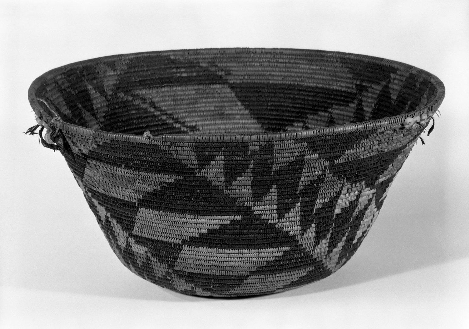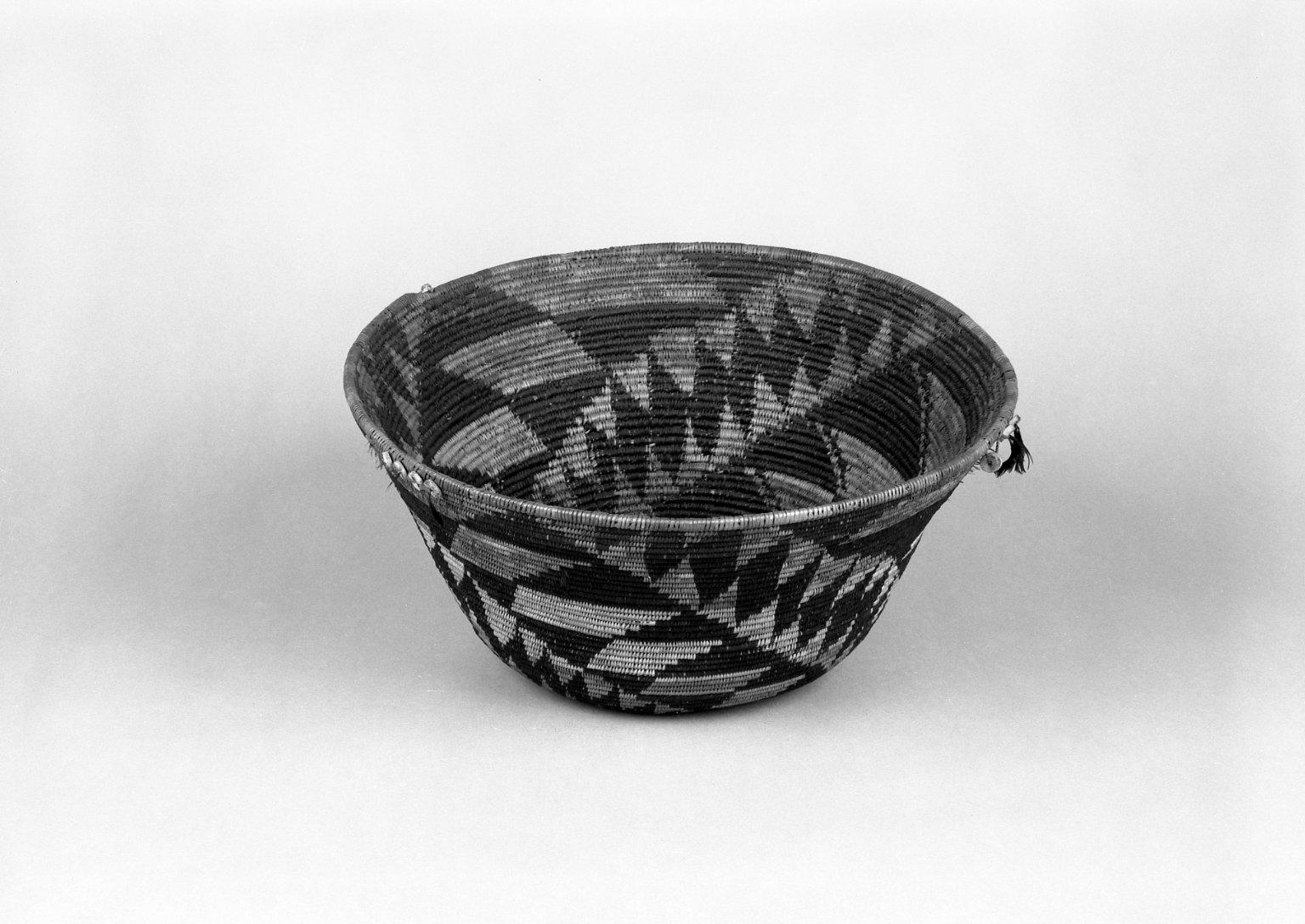 Pomo. Coiled Basket with spiralling triangle patterns, Clam shell, acorn woodpecker feather, quail feather, bulrush, sedge root, 5 7/8 x 12 1/16 in. (15.0 x 30.7 cm). Brooklyn Museum, Gift of Pratt Institute, 46.136.2. (Photo: Brooklyn Museum)