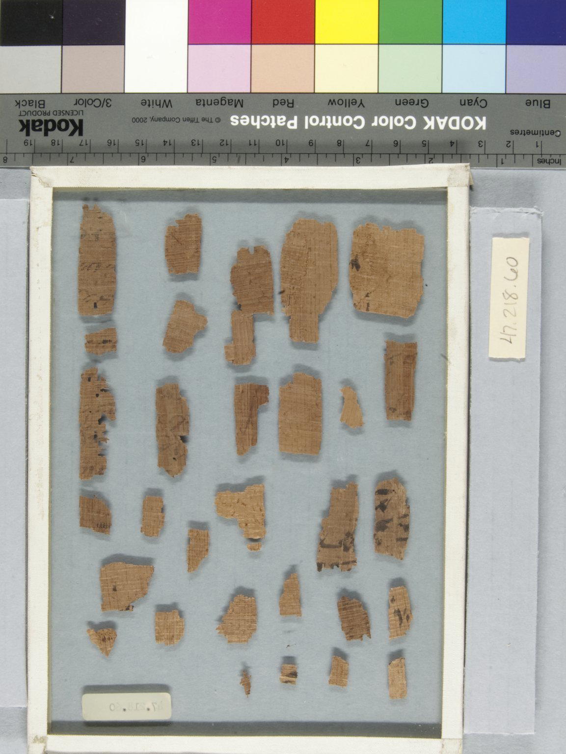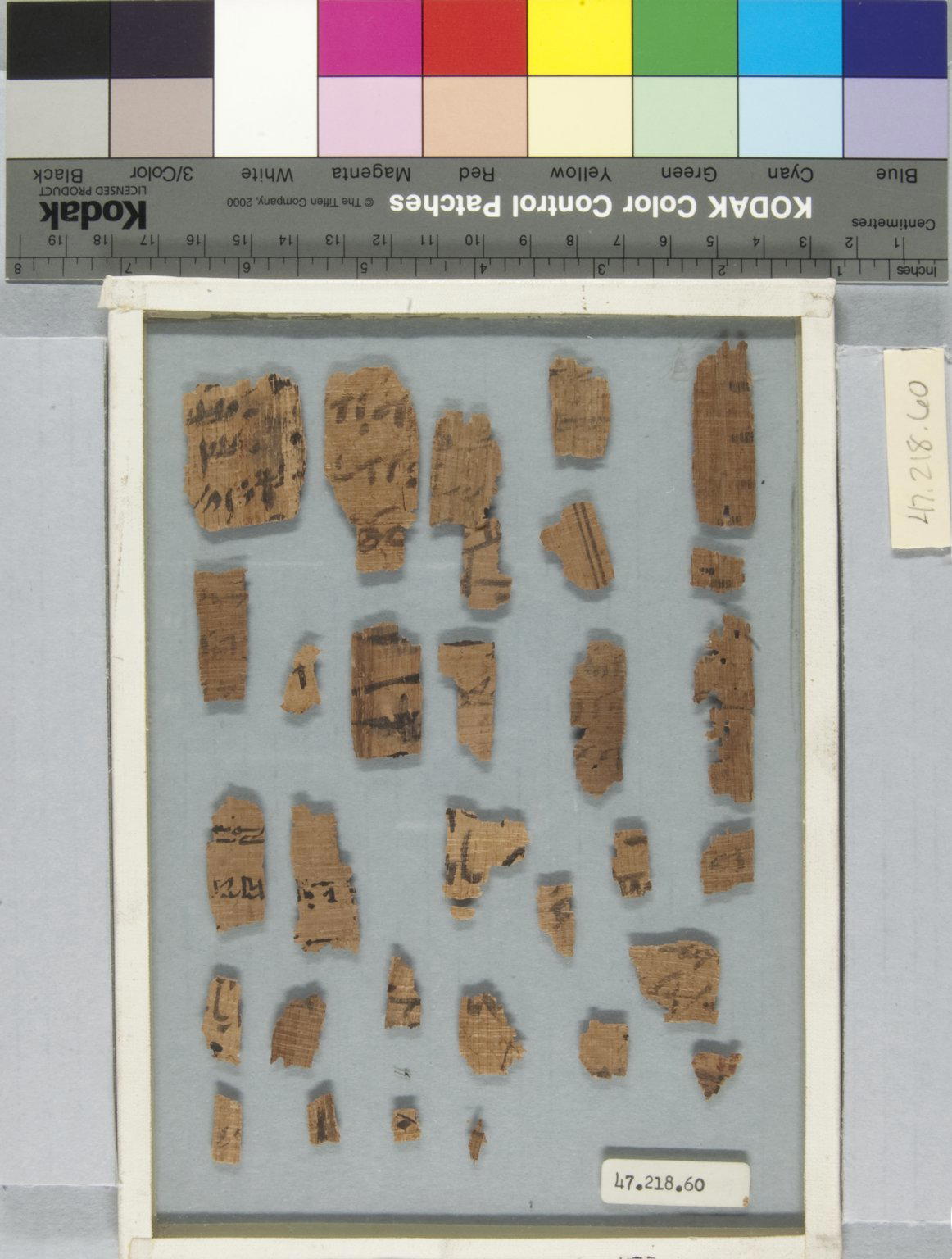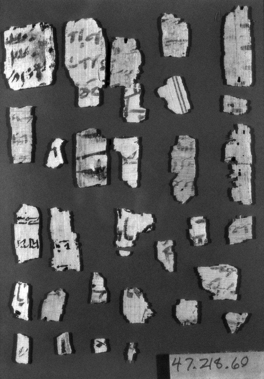 Papyrus Fragments Inscribed in Hieratic and Demotic, 664–30 B.C.E.. Papyrus, ink, Glass: 6 1/8 x 8 1/4 in. (15.5 x 21 cm) Largest Fragment: 7/8 x 1 3/4 in. (2.2 x 4.4 cm). Brooklyn Museum, Bequest of Theodora Wilbour from the collection of her father, Charles Edwin Wilbour, 47.218.60. (Photo: Brooklyn Museum)