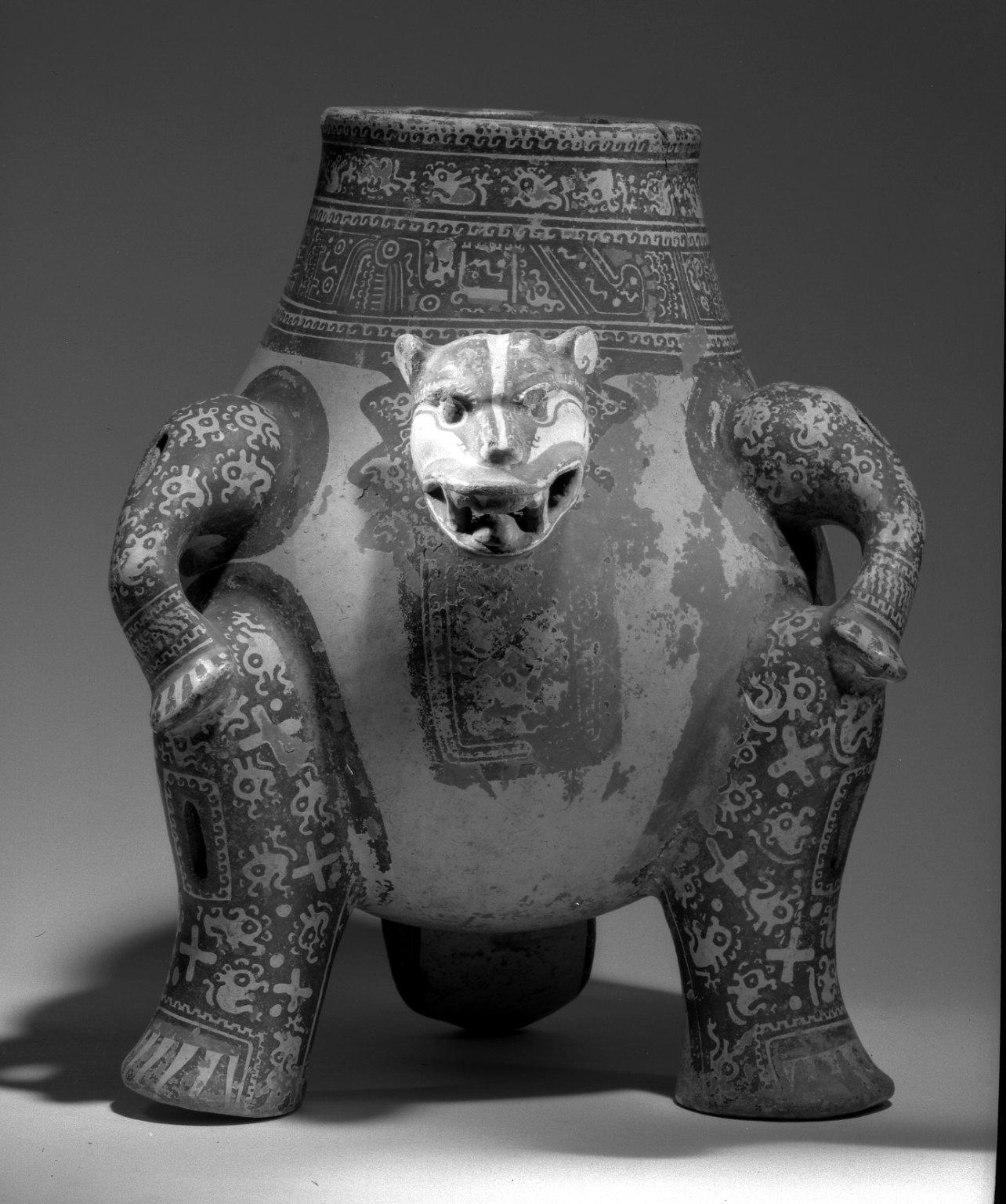 The representation of the jaguar as a fearsome and powerful predator reaches its pinnacle in this pear-shaped, highly decorated jar. The blood-stained open mouth, pronounced incisors, and crouching stance convey that this is an intimidating species to be respected. The black-and-white patterned areas, made up of stylized jaguar heads, imitate the animal’s spotted coat, and the anthropomorphic pose, with hands on knees, is standard in Costa Rican depictions of shamans, who have the power to transform themselves into animals and move between the natural and supernatural realms.