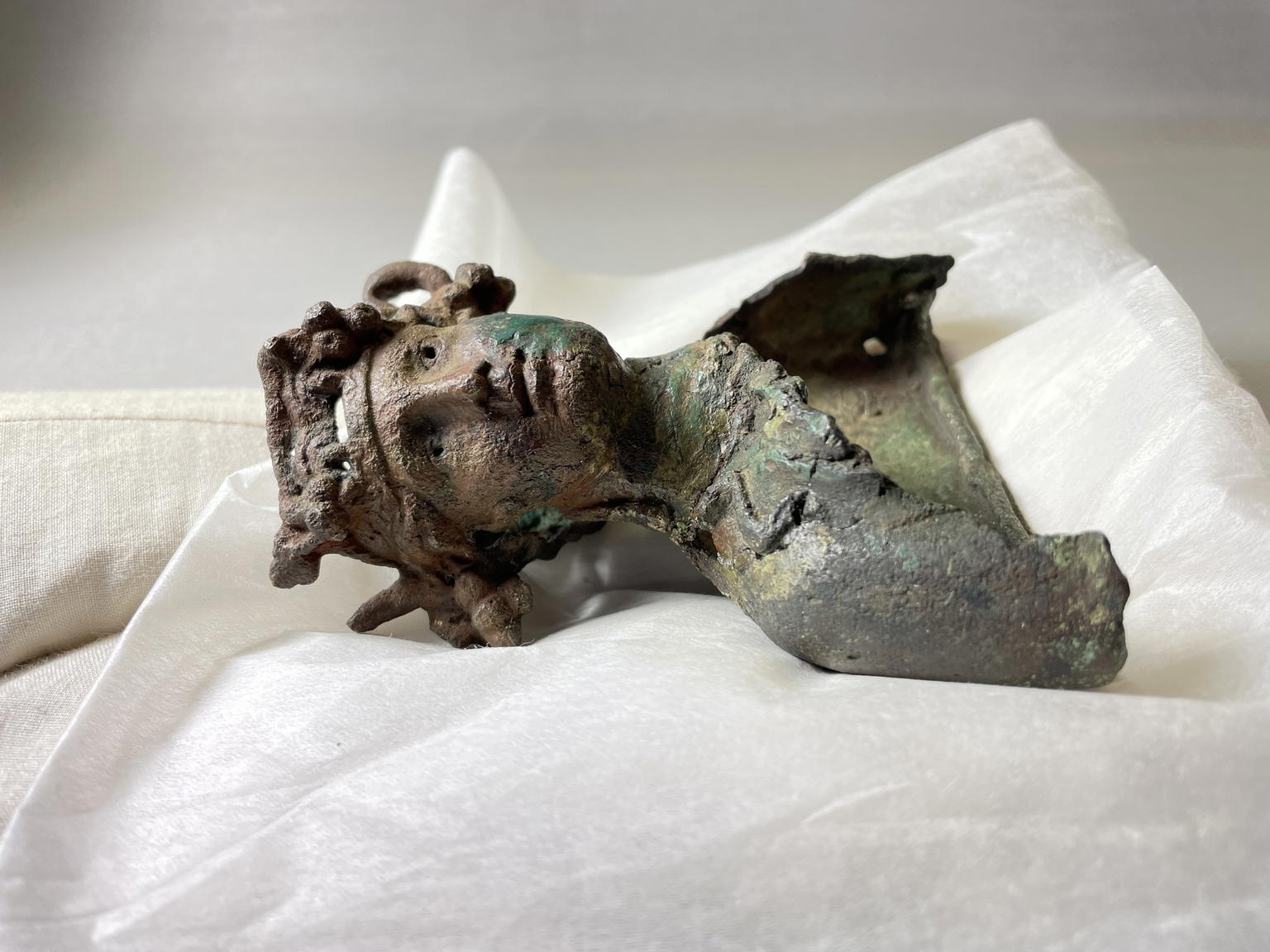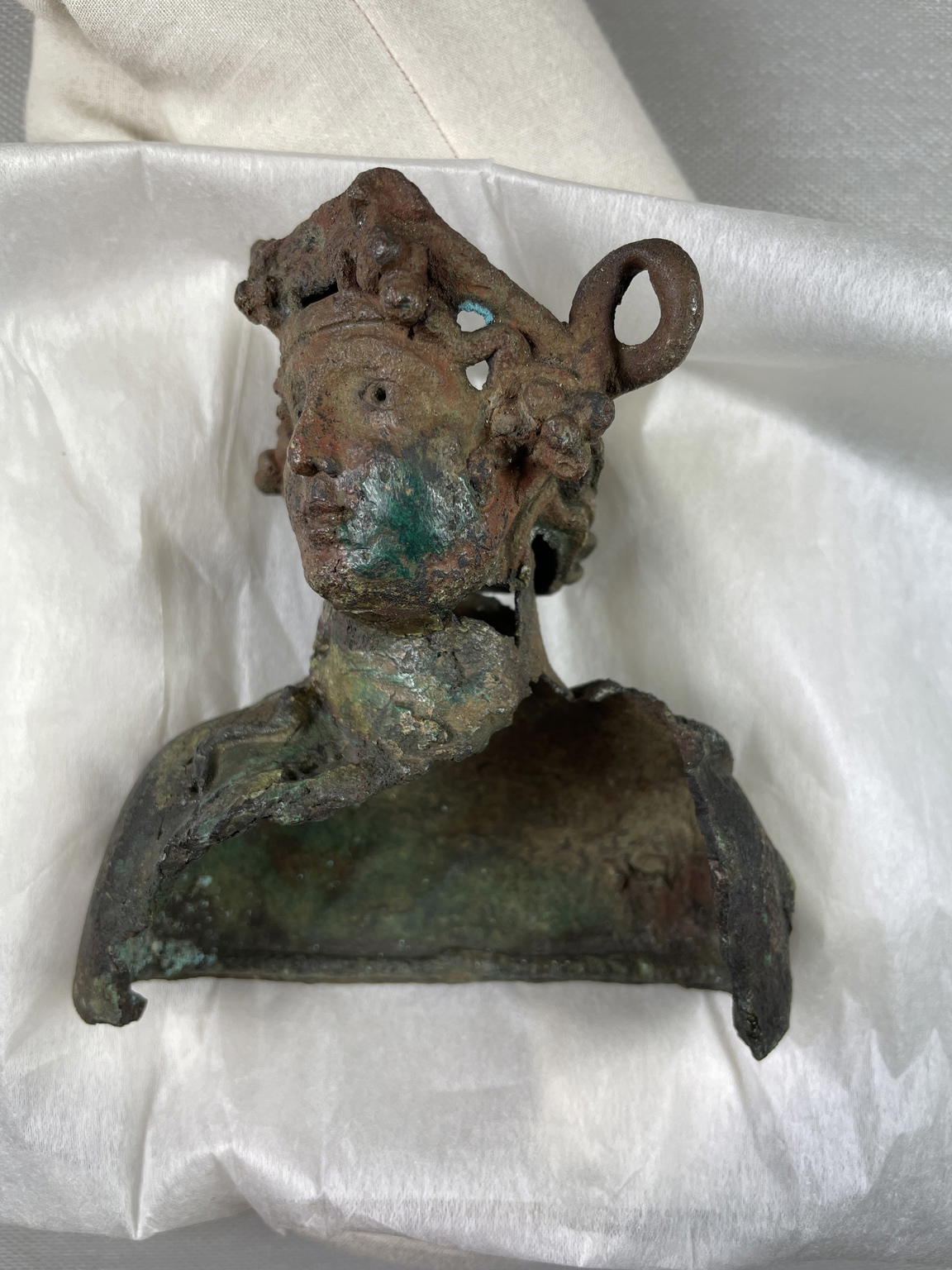 Bust of Dionysos, ca. 2nd–3rd century C.E., or earlier. Bronze, 4 1/8 × 3 11/16 × 1 15/16 in. (10.5 × 9.3 × 4.9 cm). Brooklyn Museum, Gift of Albert Gallatin, 49.64. (Photo: Brooklyn Museum)