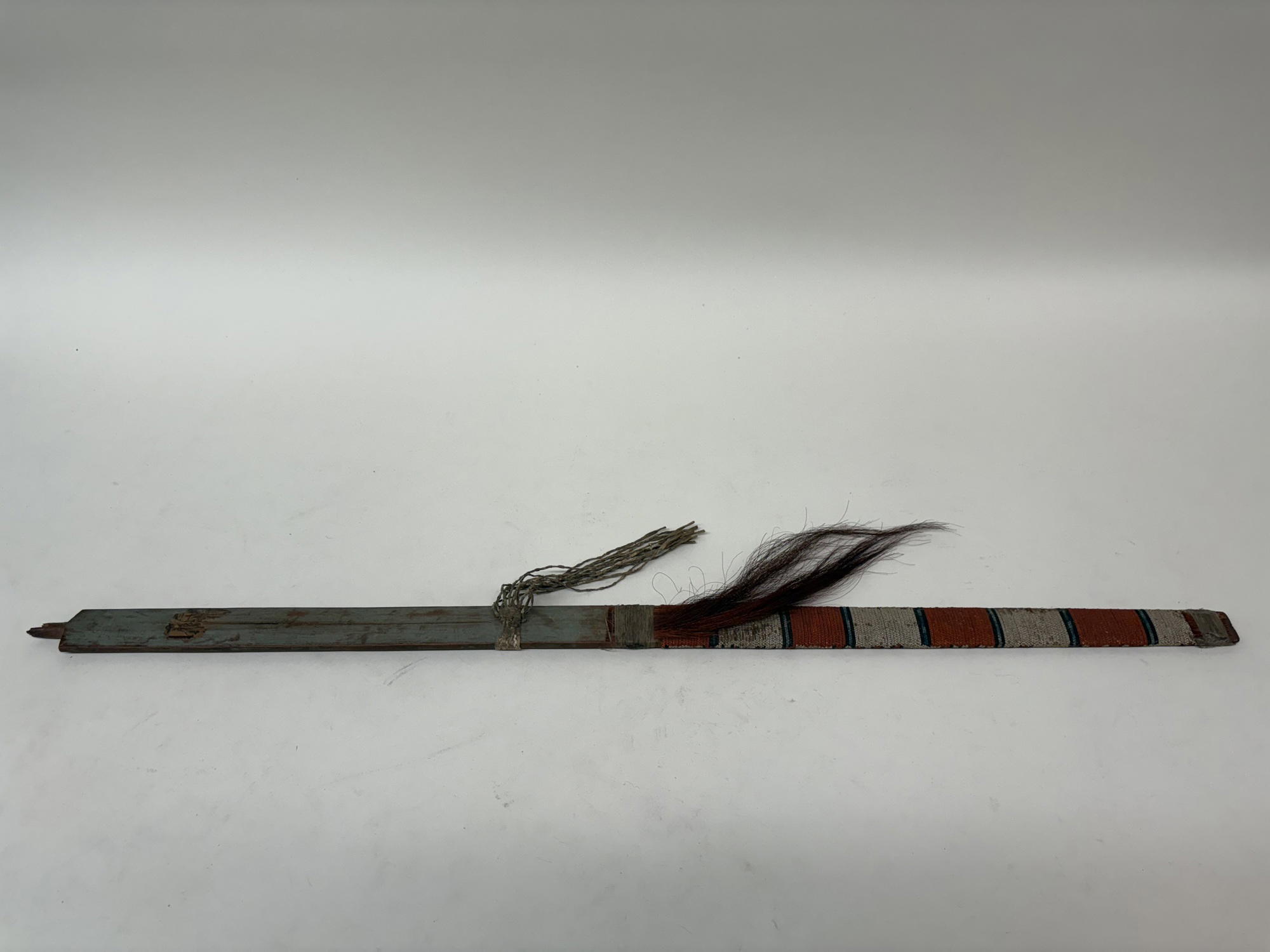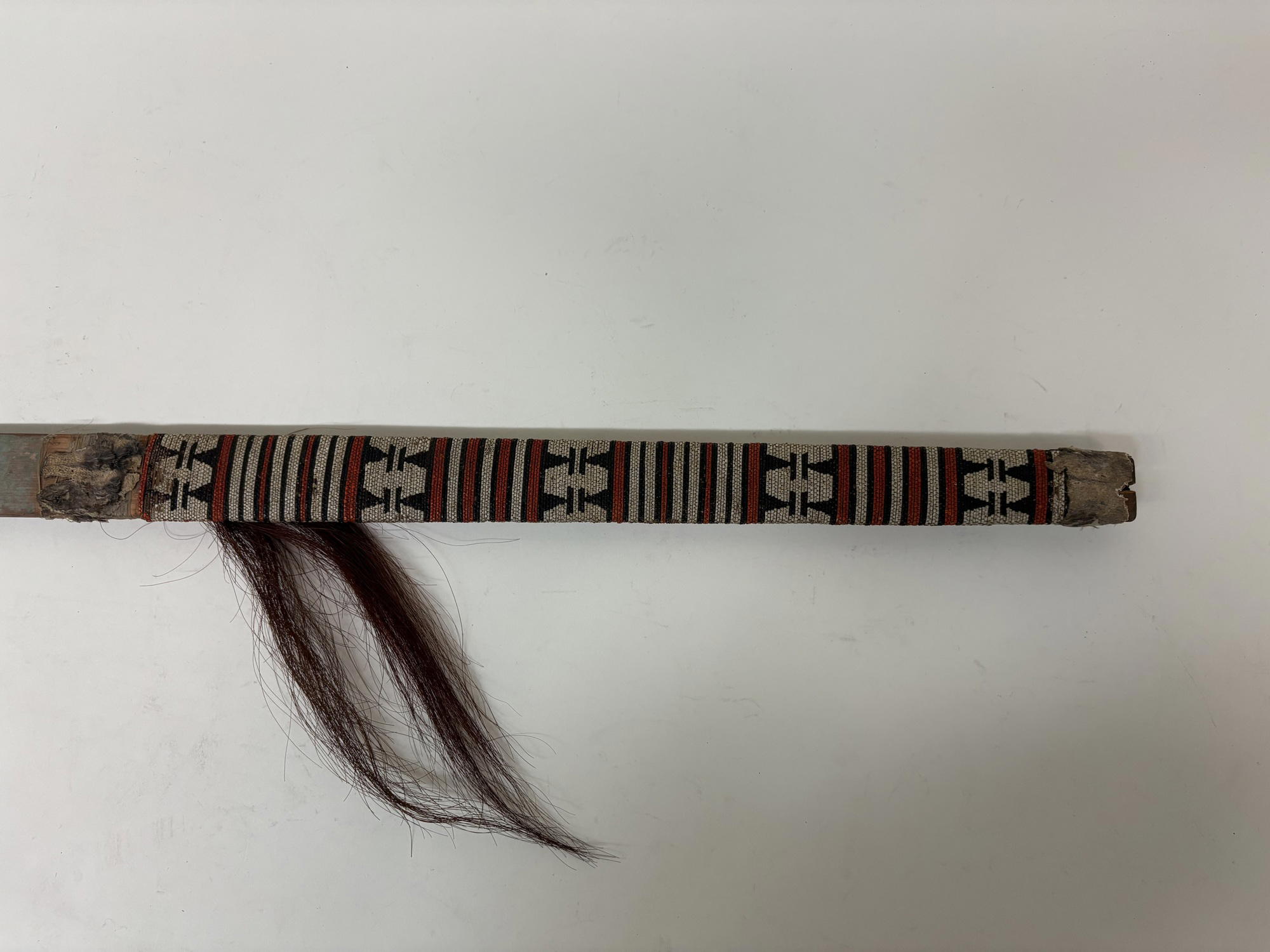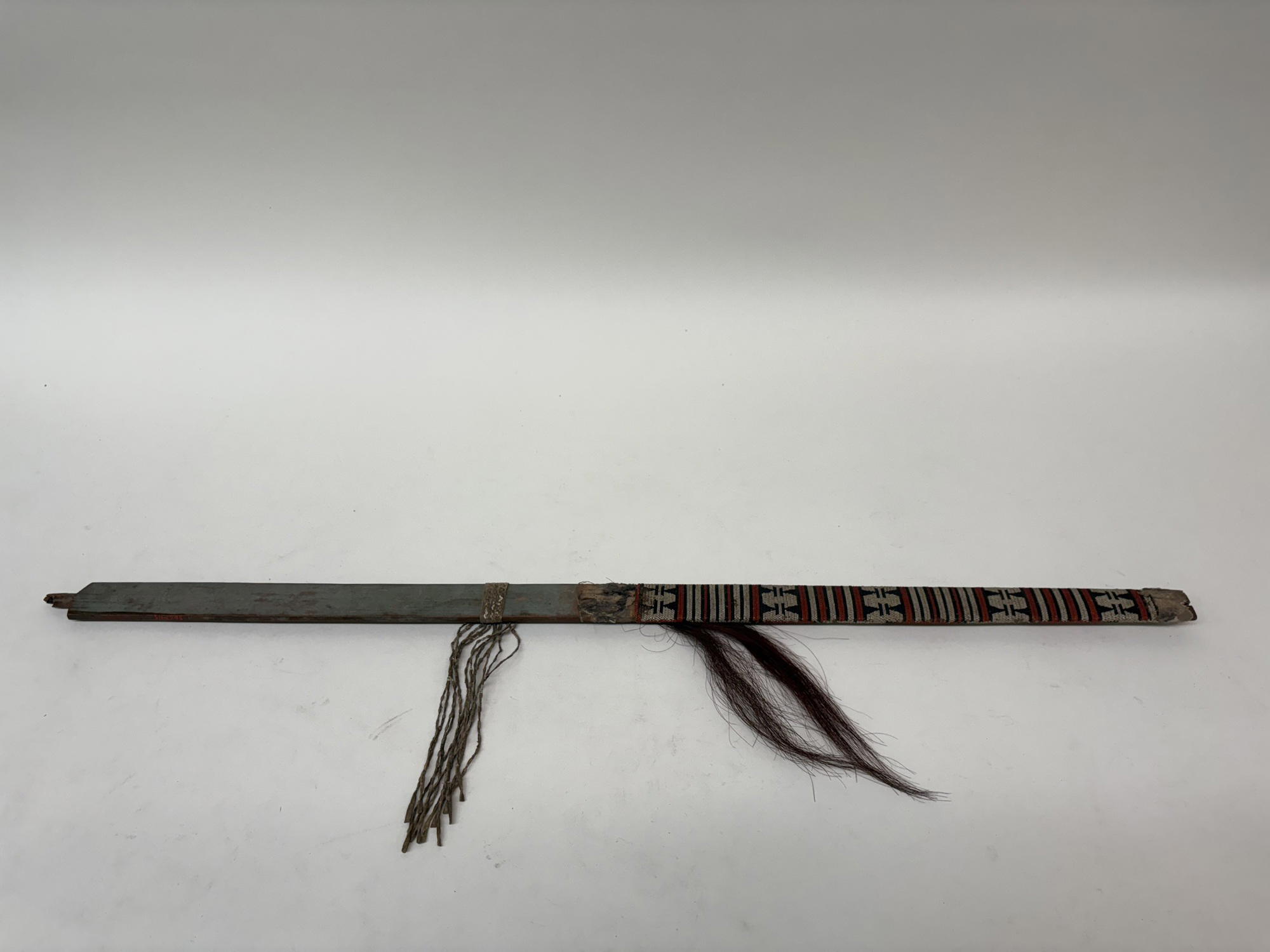 Wood, pigment, porcupine quills, horsehair, bird scalps, buckskin