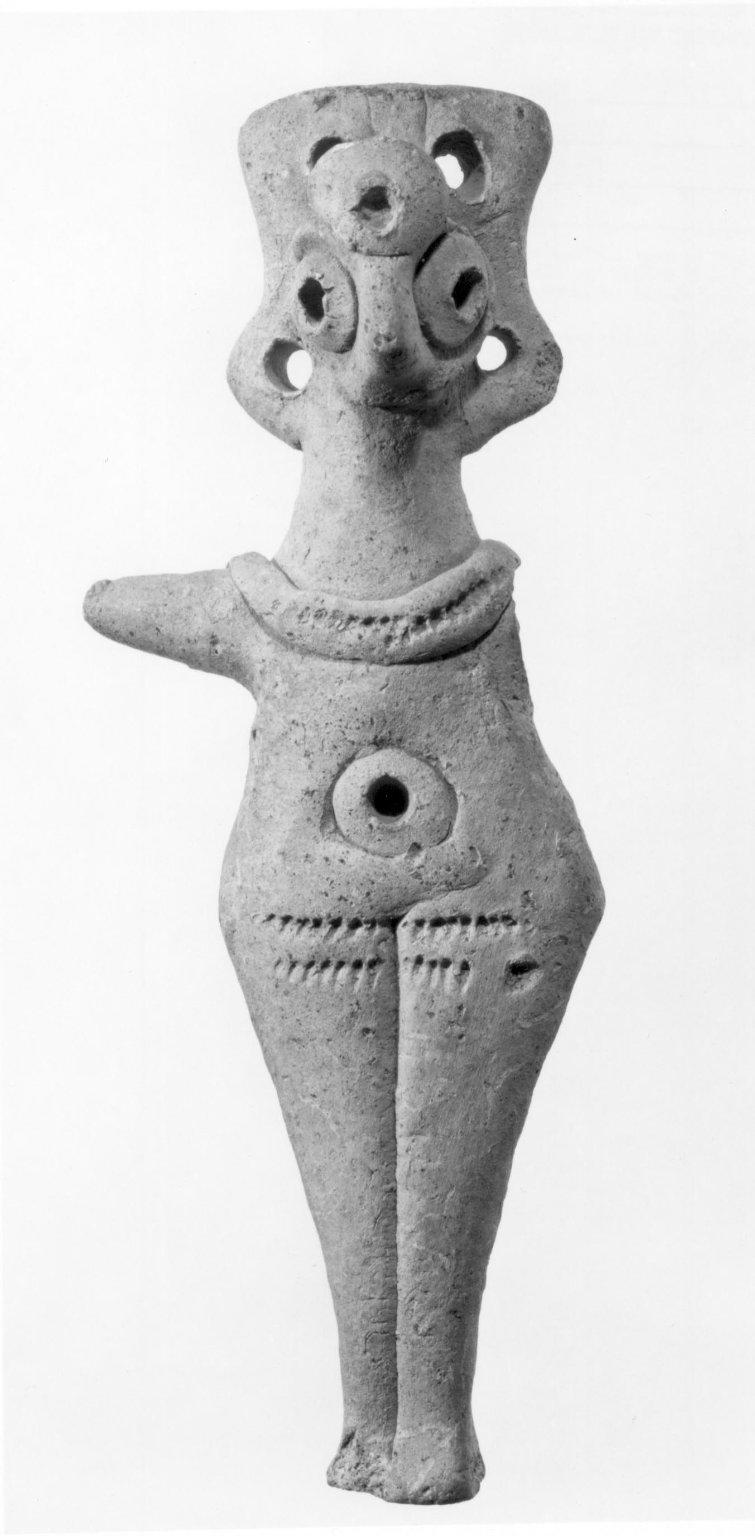 The majority of ancient Near Eastern female figures emphasize their fertility. Although the three terracotta (baked clay) figures here come from very different times and places, all are nude and two have overlarge, patterned pubic areas. Their faces are rudimentary, with little or no indication of a mouth. The copper figure, though very schematically modeled, suggests a real woman with pulled-back hair and a bulging belly, wearing a knee-length skirt and carrying an infant on her back. In contrast, the marble image, with its circular head, long neck, and U-shaped body, is reduced almost to abstraction.