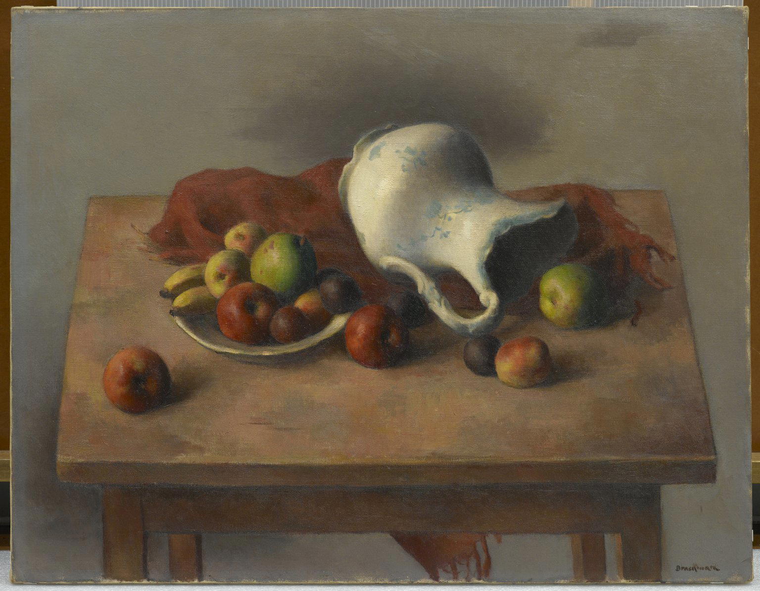 This is Robert Brackman's "Still Life with a Discarded Pitcher." Brackman was born in Ukraine in 1898 and emigrated to New York in 1898. He studied at the National Academy of Design and he worked in several genres, including portraits, figures, and still lifes like this one!