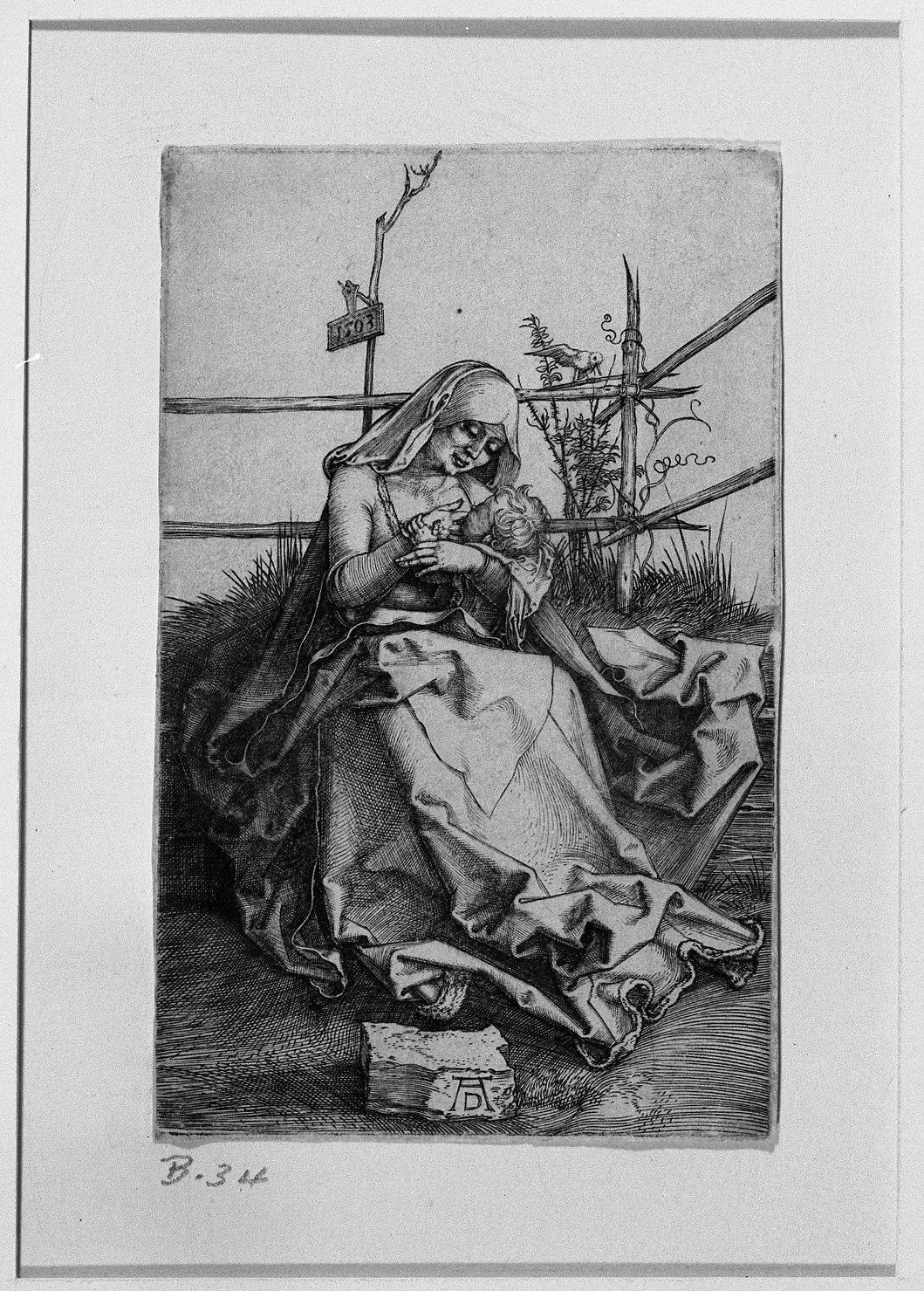 Albrecht Dürer (German, 1471–1528). The Virgin Nursing the Child, 1503. Engraving on fine-laid reinforced paper, 4 1/2 x 2 13/16 in. (11.5 x 7.2 cm). Brooklyn Museum, Gift of Mrs. Horace O. Havemeyer, 54.35.5. (Photo: Brooklyn Museum)