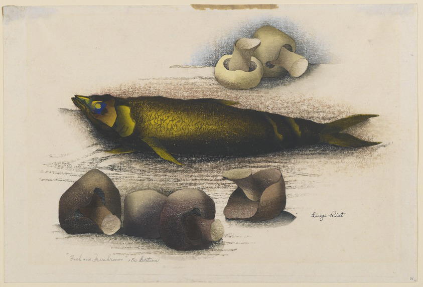 Luigi Rist (American, 1888–1959). Fish and Mushrooms, 1954. Woodcut on paper, 9 1/2 x 13 1/4 in. (24.1 x 33.7 cm). Brooklyn Museum, Dick S. Ramsay Fund, 54.107.3. (Photo: Brooklyn Museum)