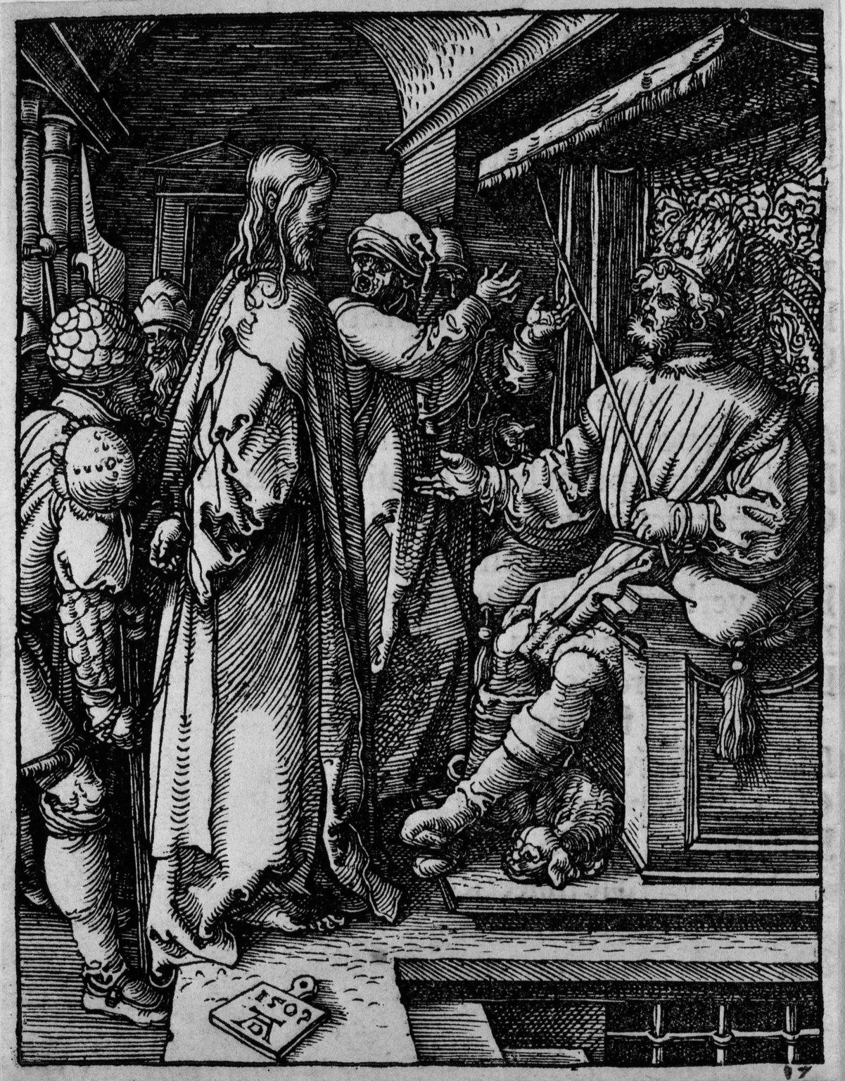 Albrecht Dürer (German, 1471–1528). Christ before Herod, 1509; edition of 1511. Woodcut on laid paper, Sheet: 5 1/4 x 4 1/16 in. (13.3 x 10.3 cm) Image: 5 x 3 7/8 in. (12.7 x 9.8 cm). Brooklyn Museum, Gift of Mrs. Howard M. Morse, 56.105.17. (Photo: Brooklyn Museum)