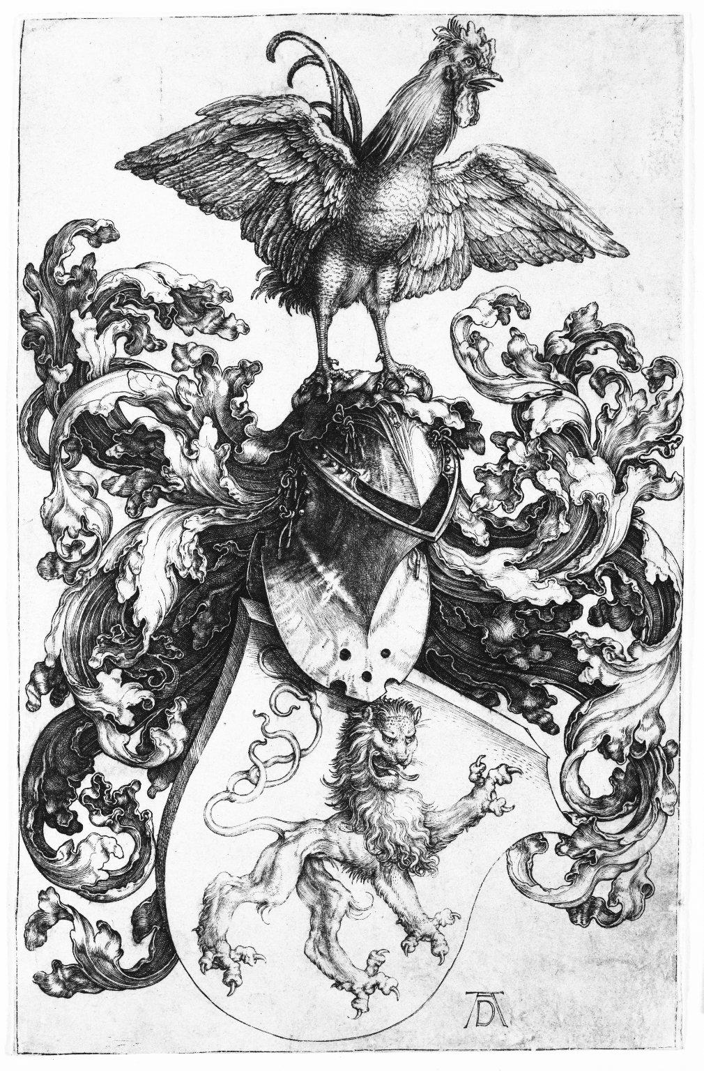 Albrecht Dürer (German, 1471–1528). The Coat of Arms with Lion and Rooster, 1503. Engraving on laid paper, 7 1/4 x 4 3/4 in. (18.4 x 12.1 cm). Brooklyn Museum, Gift of Mrs. Charles Pratt, 57.188.12. (Photo: Brooklyn Museum)