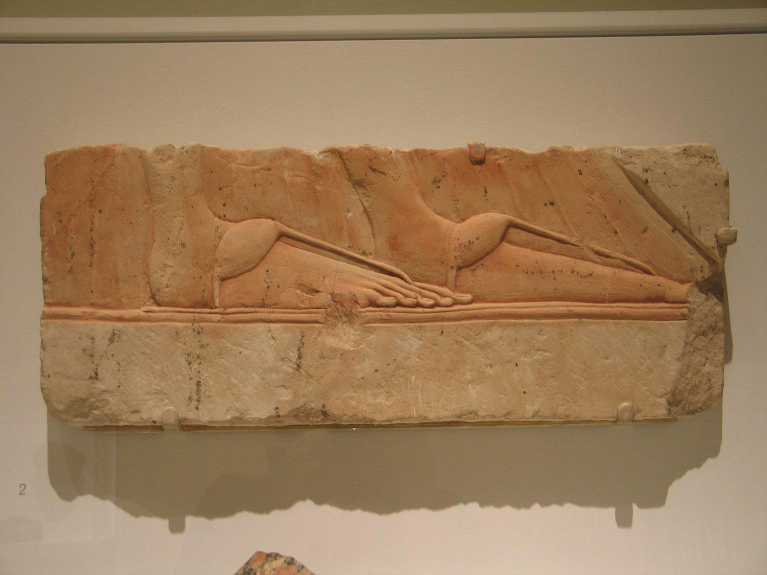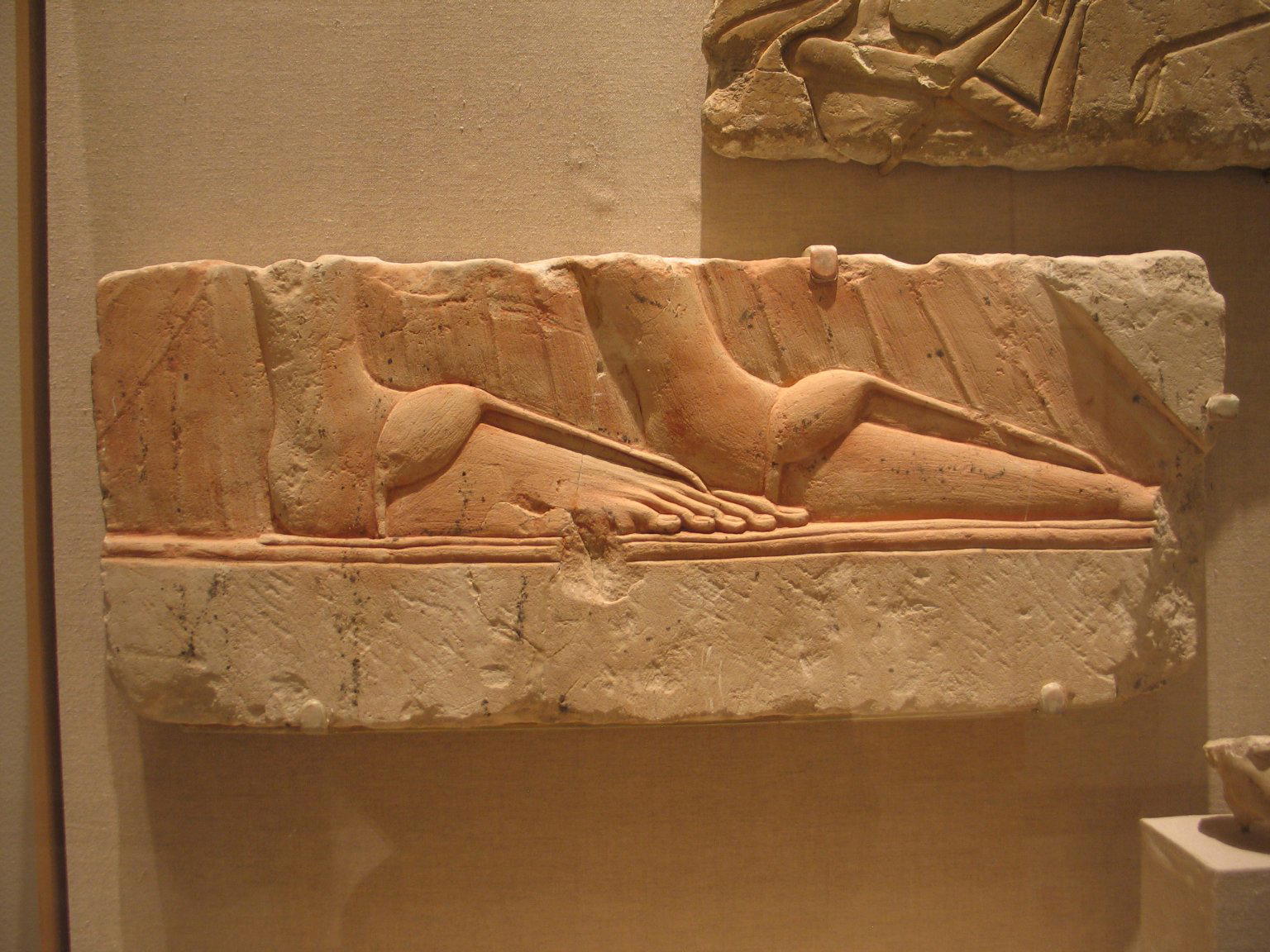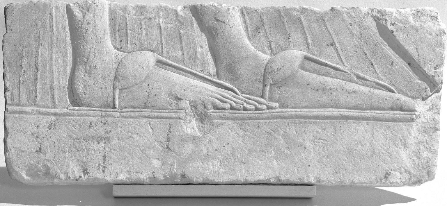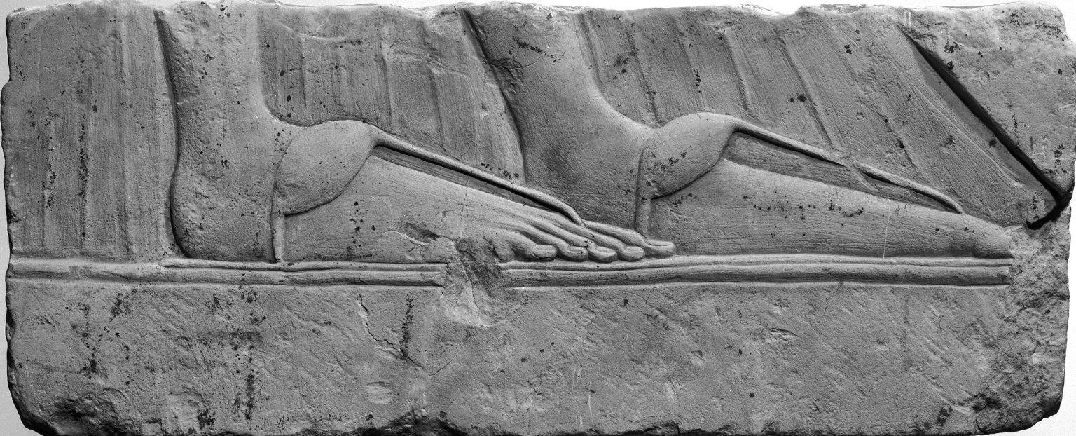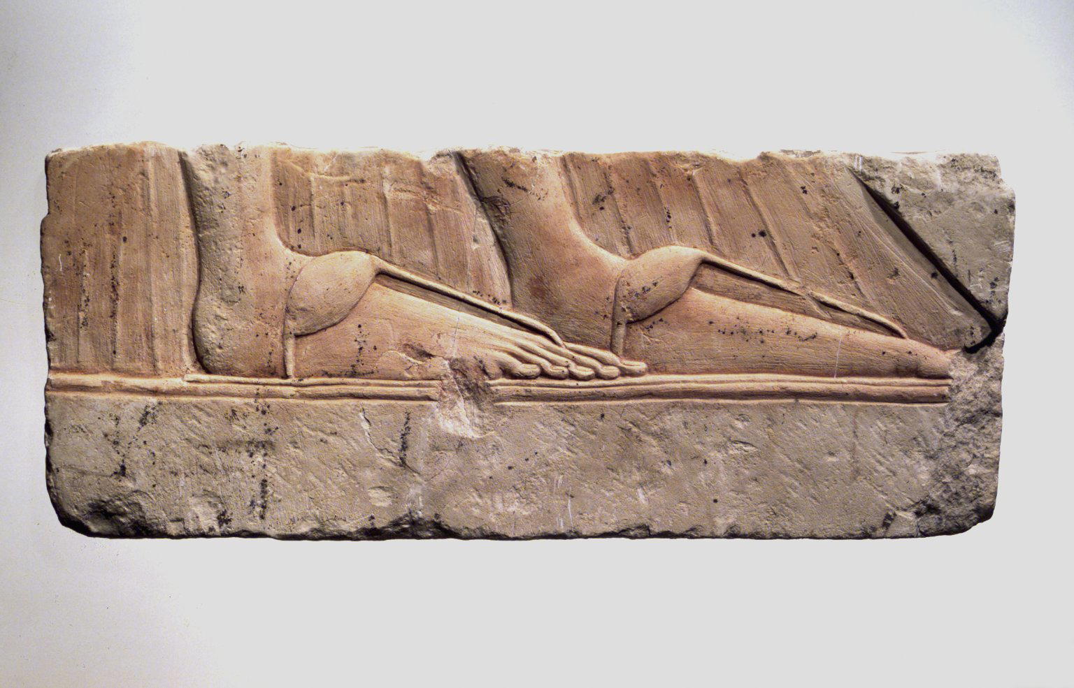Traditional Egyptian relief rendered both feet as seen from the inside, with the big toe closer to the viewer. In the Eighteenth Dynasty, however, artists began to experiment with more accurate representations, first in tomb painting and then in sculpture and relief. This relief, representing all five toes of the right foot, is one of the first examples of a break with the earlier tradition.