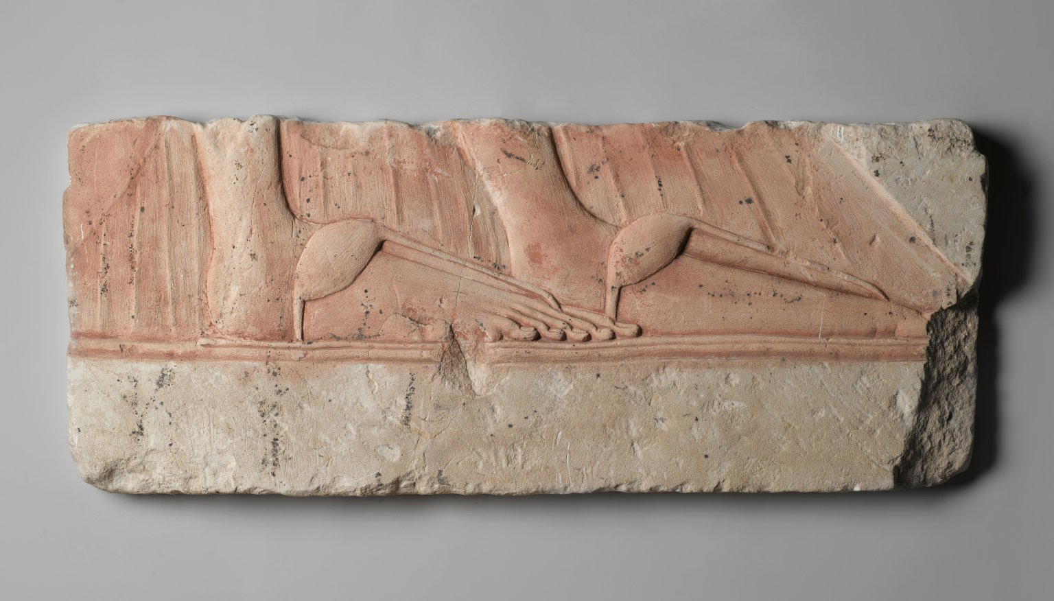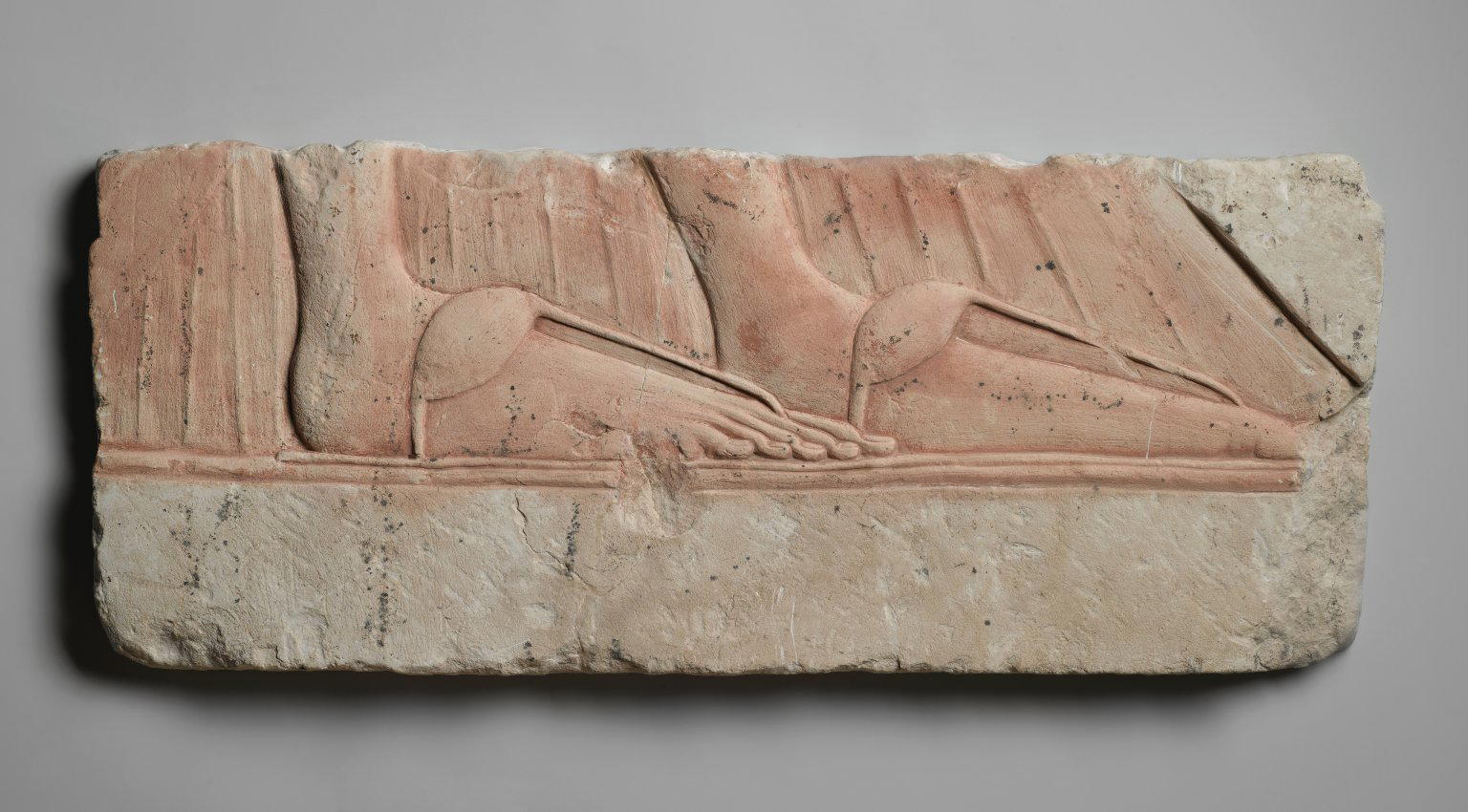 Relief of Sandaled Feet of a Royal Woman, 1352–1332 B.C.E.. Limestone, pigment, 8 7/8 x 21 3/4 in. (22.6 x 55.3 cm). Brooklyn Museum, Charles Edwin Wilbour Fund, 60.197.7. (Photo: Brooklyn Museum)