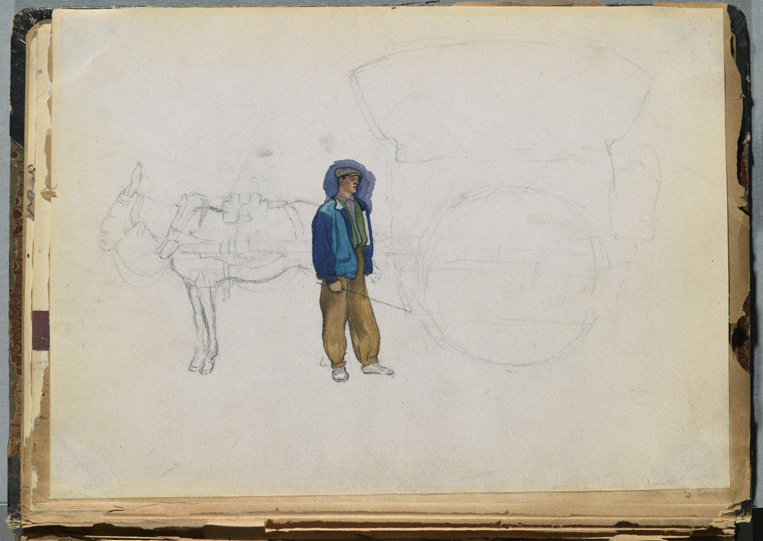 Edward Penfield (American, 1866–1925). Spanish Sketch Mounted in Scrap Book, ca. 1911. Watercolor and graphite on paper mounted in scrap book, sheet: 8 1/8 x 11 3/16 in. (20.6 x 28.4 cm). Brooklyn Museum, Gift of the Enoch Pratt Free Library, 61.36.7. (Photo: Brooklyn Museum)