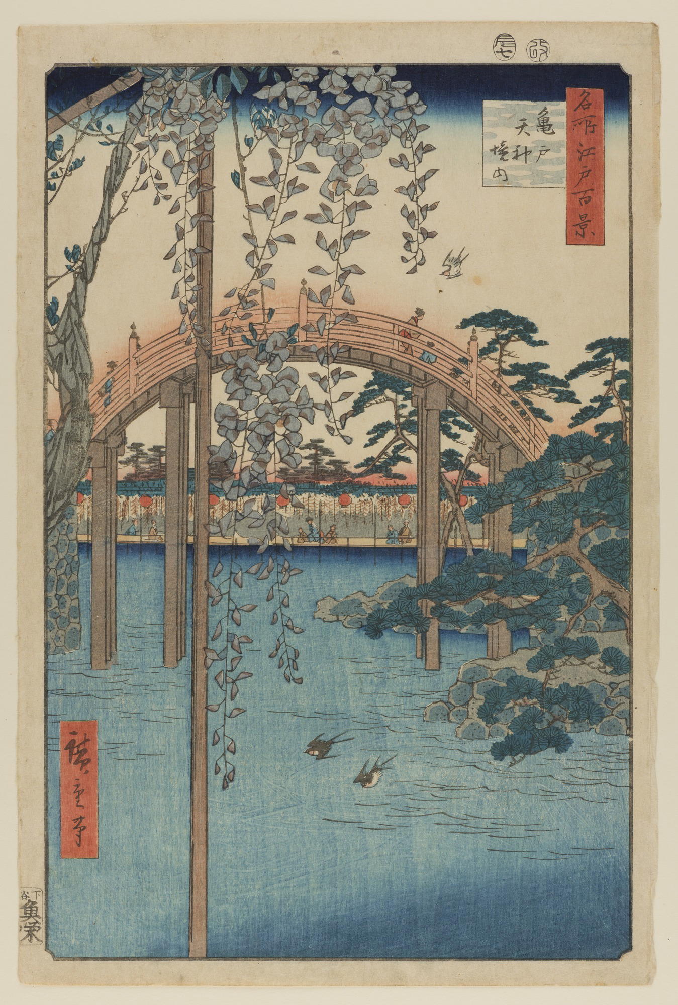 Utagawa Hiroshige (Japanese, 1797–1858). Inside Kameido Tenjin Shrine, from One Hundred Famous Views of Edo, ca. 1857. Woodblock color print, Sheet: 14 7/16 x 9 5/8 in. (36.7 x 25.0 cm) Image: 13 3/8 x 8 3/4 in. (34.0 x 22.2 cm). Brooklyn Museum, Gift of Dr. and Mrs. Frank L. Babbott, Jr., 62.79.5. (Photo: Brooklyn Museum)