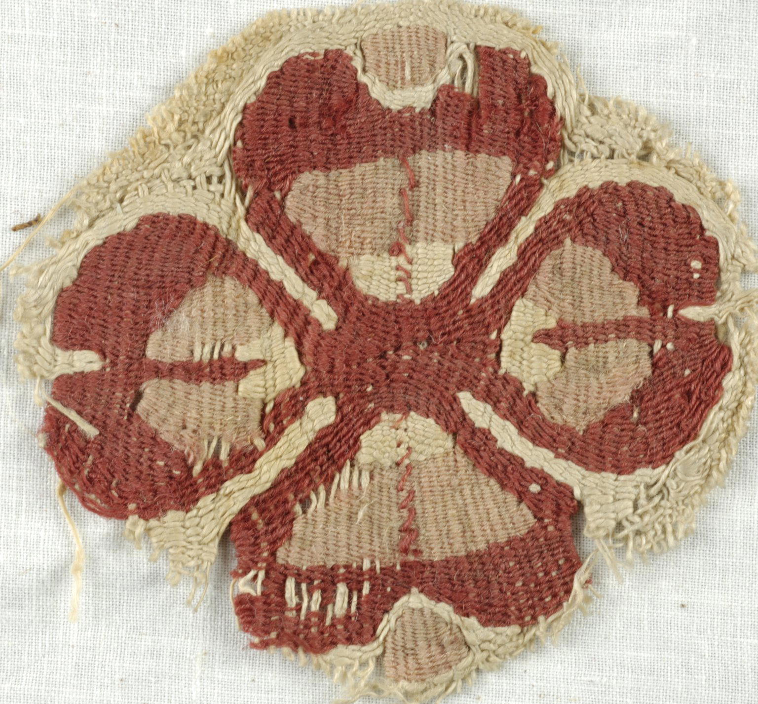 Coptic. Rosette, 5th–7th century C.E.. Flax, wool, 3 1/8 x 3 1/8 in. (8 x 8 cm). Brooklyn Museum, Gift of Adelaide Goan, 64.114.265. (Photo: Brooklyn Museum (in collaboration with Index of Christian Art, Princeton University))