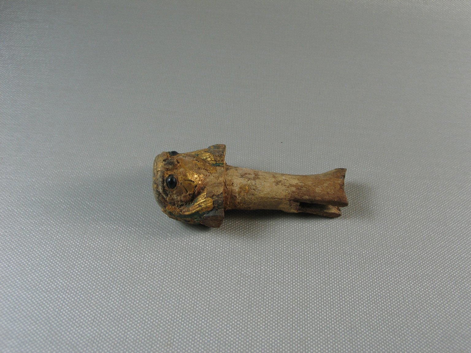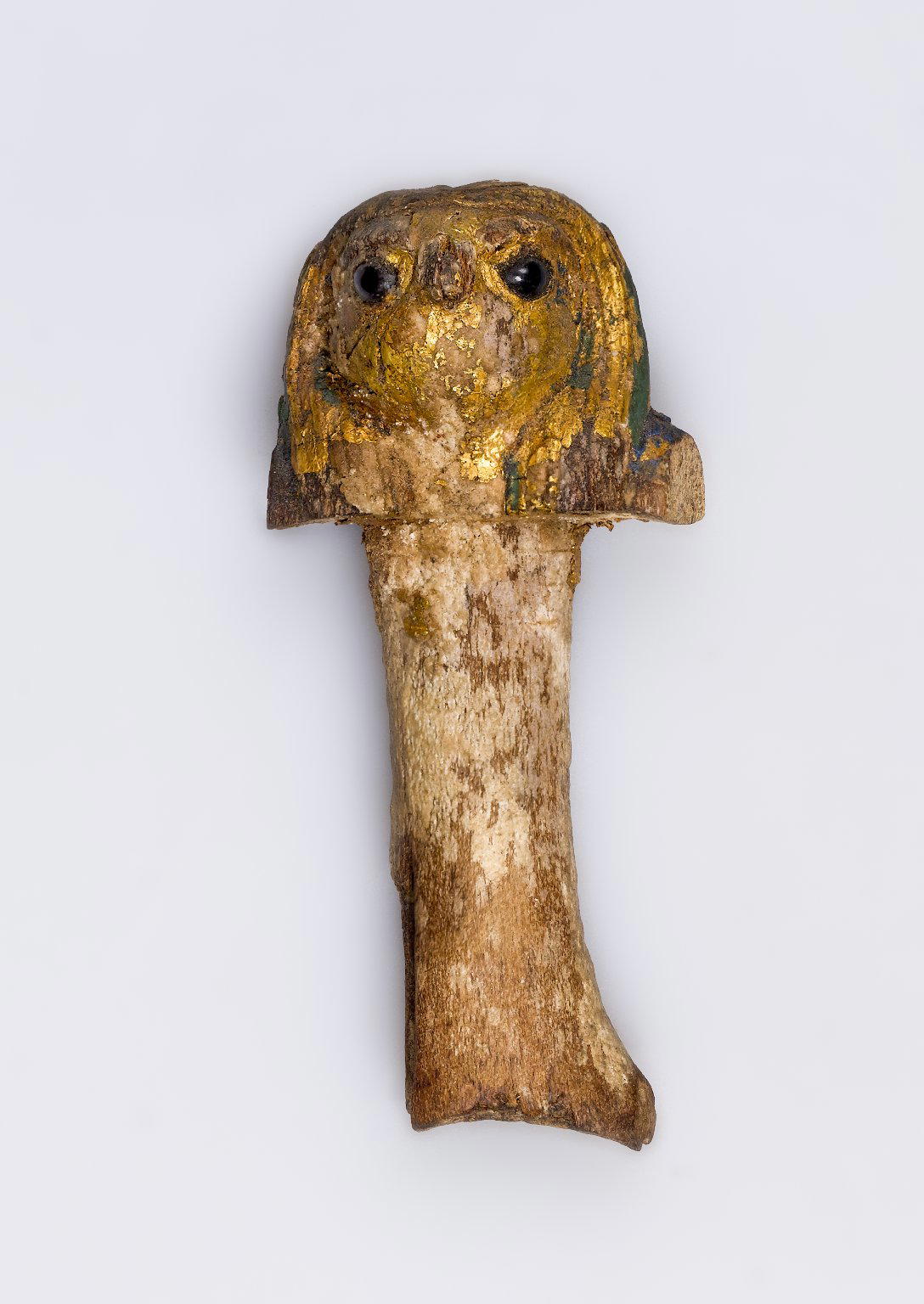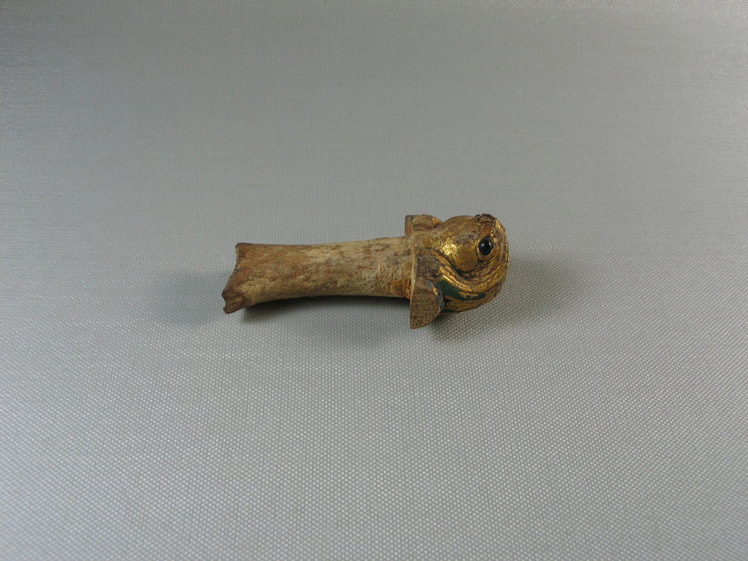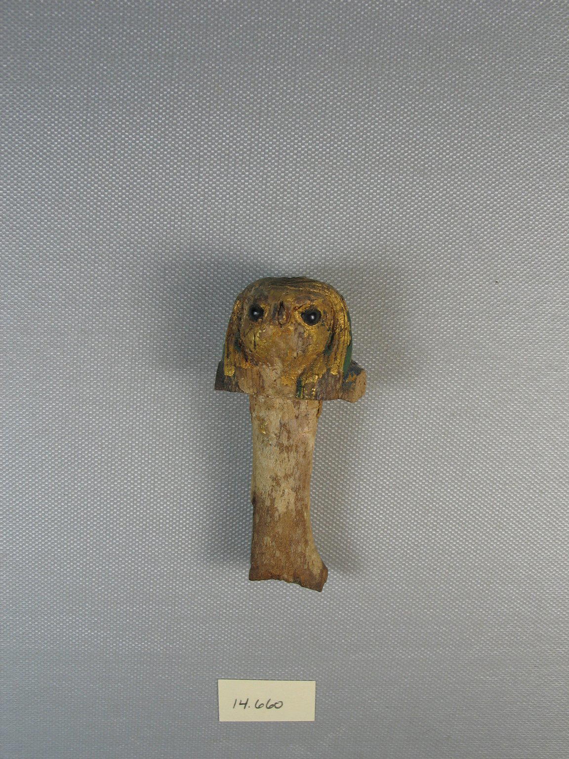 Hawk-Headed Handle, ca. 1938–1759 B.C.E.. Wood, garnet (?), gold, pigment, 3 11/16 x 1 5/8 x 1 1/4 in. (9.3 x 4.2 x 3.1 cm). Brooklyn Museum, Museum Collection Fund, 14.660. (Photo: Brooklyn Museum)