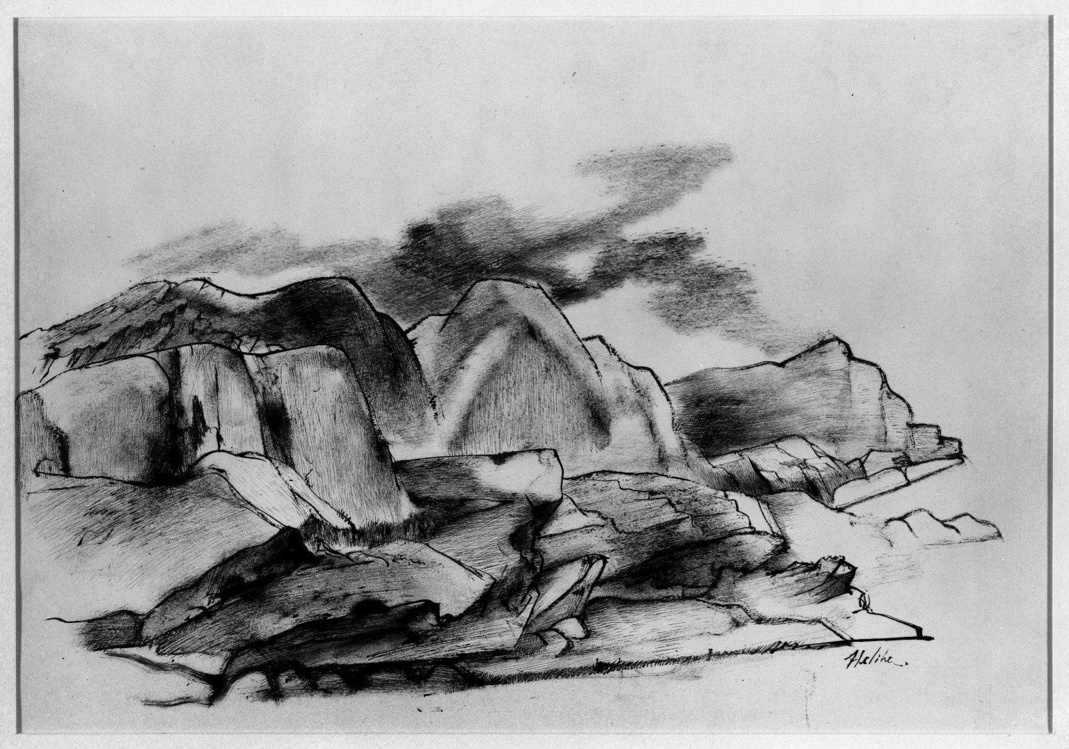 John Edward Heliker (American, 1909–2000). Cliffs, ca. 1960. Ink on paper, sheet: 13 7/8 x 16 15/16 in. (35.2 x 43 cm). Brooklyn Museum, Gift of Daniel and Rita Fraad, Jr., 65.260.1. © Estate of John Edward Heliker. (Photo: Brooklyn Museum)
