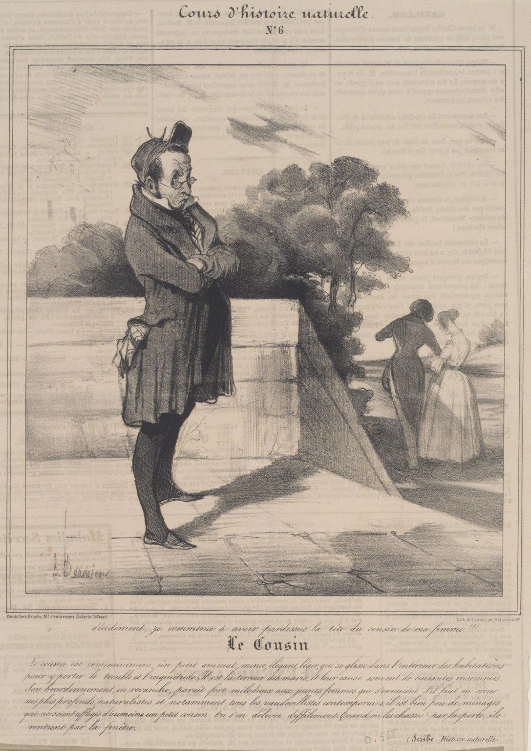 Honoré Daumier (Marseille, France, 1808–1879, Valmondois, France). Le Cousin, December 7, 1837. Lithograph on newsprint, Sheet: 9 11/16 x 8 1/4 in. (24.6 x 21 cm) Image: 8 1/4 x 7 5/16 in. (21 x 18.5 cm). Brooklyn Museum, Gift of Sydel Solomon, 65.265.8. (Photo: Brooklyn Museum)