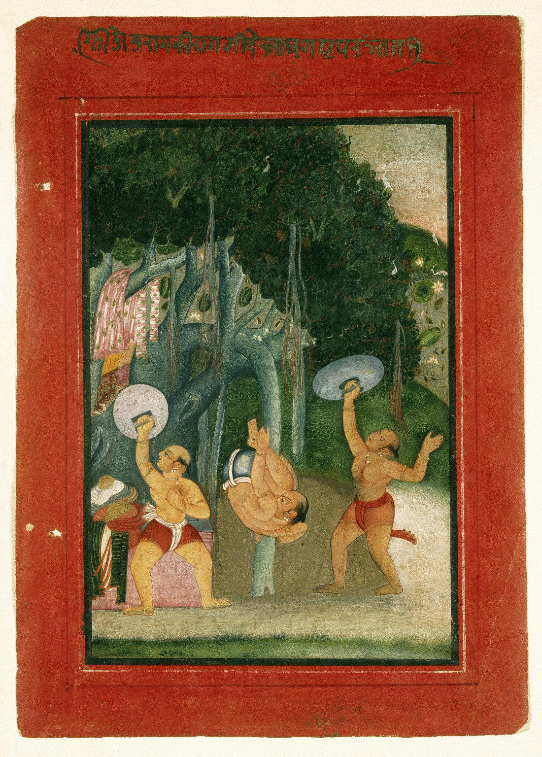 Recto, at top. In silver, in Devanagari script: Ragini Desakh of Raga Hindol, to be sung in the morning. 7 (Trans. J. Bautze)