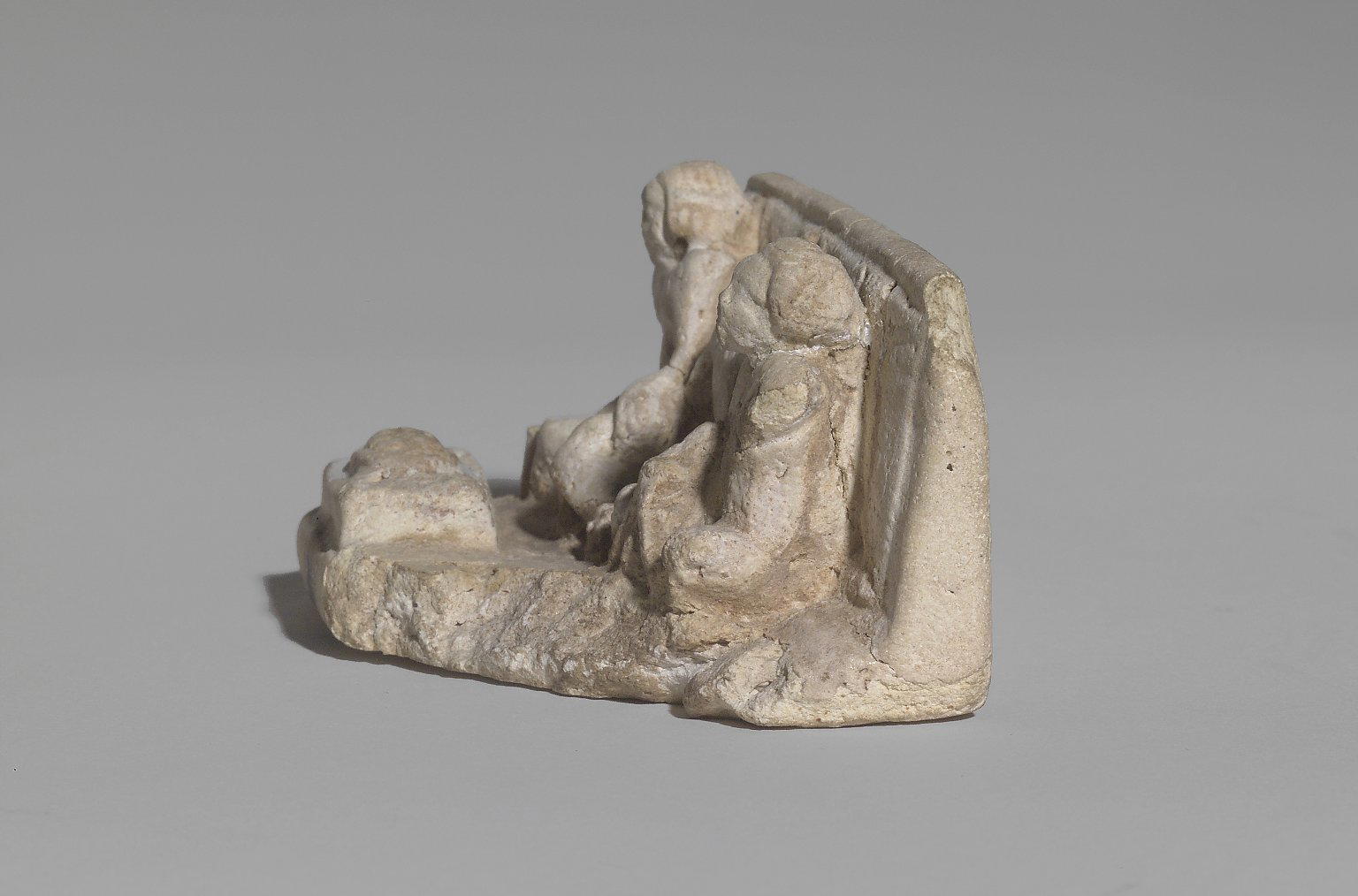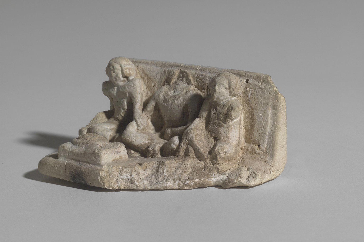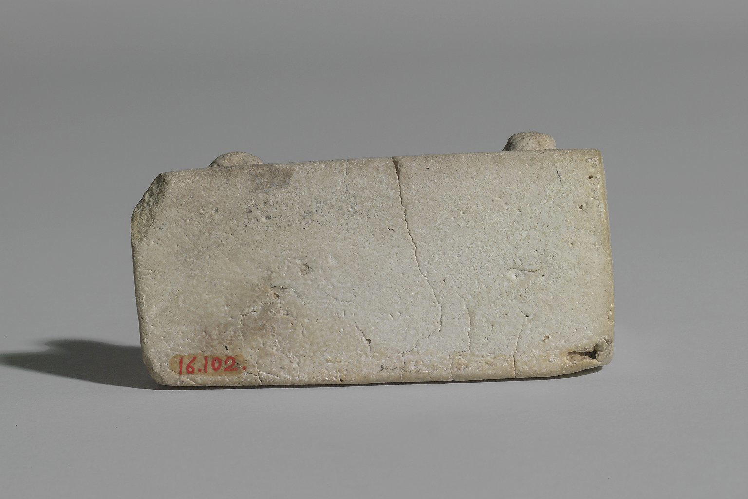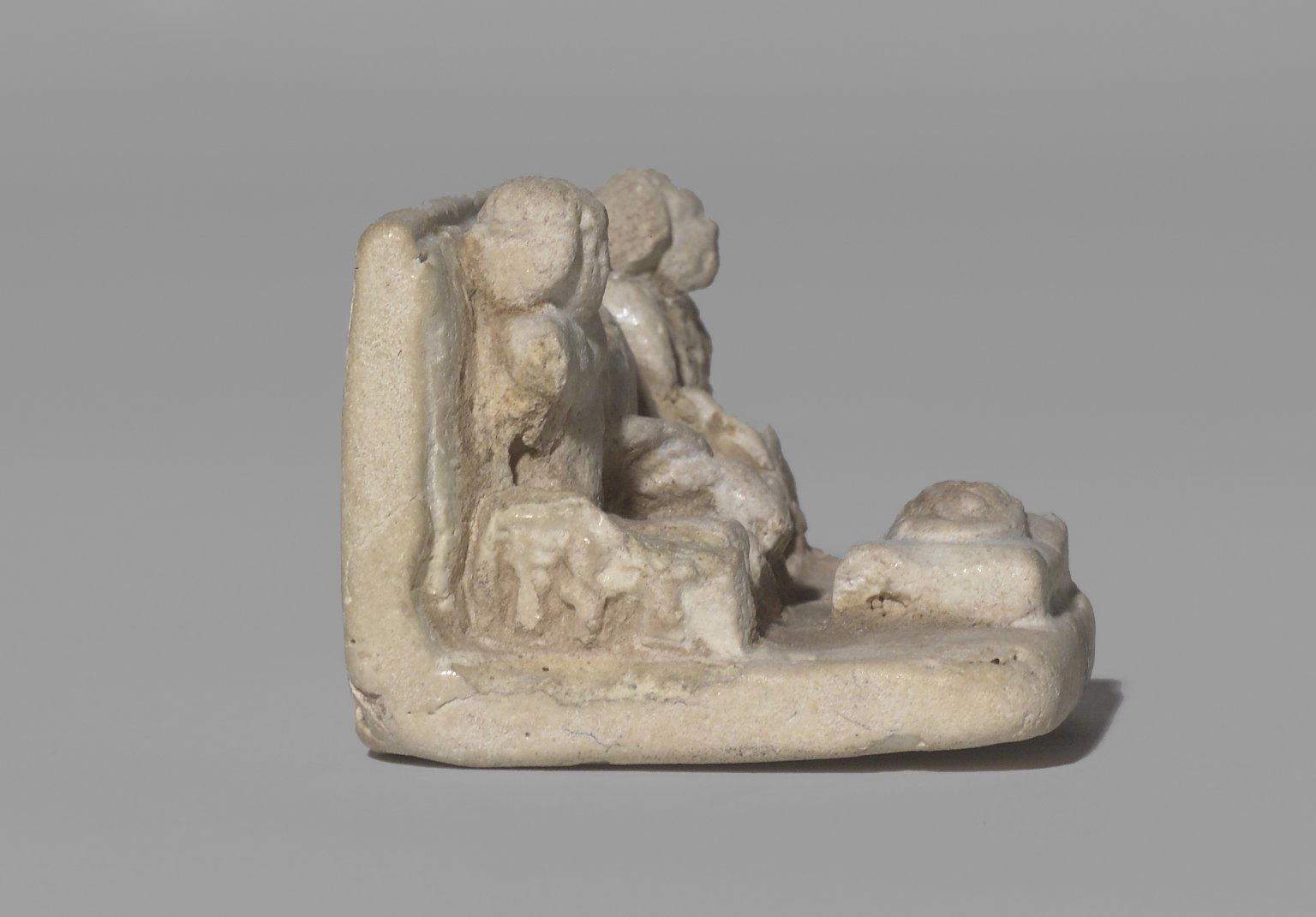 Seated Group Before an Offering Table, ca. 2500–2350 B.C.E.. Faience, 1 1/8 × 1 7/8 × 3 1/8 in. (2.8 × 4.8 × 8 cm). Brooklyn Museum, Gift of Evangeline Wilbour Blashfield, Theodora Wilbour, and Victor Wilbour honoring the wishes of their mother, Charlotte Beebe Wilbour, as a memorial to their father, Charles Edwin Wilbour, 16.102. (Photo: Brooklyn Museum)