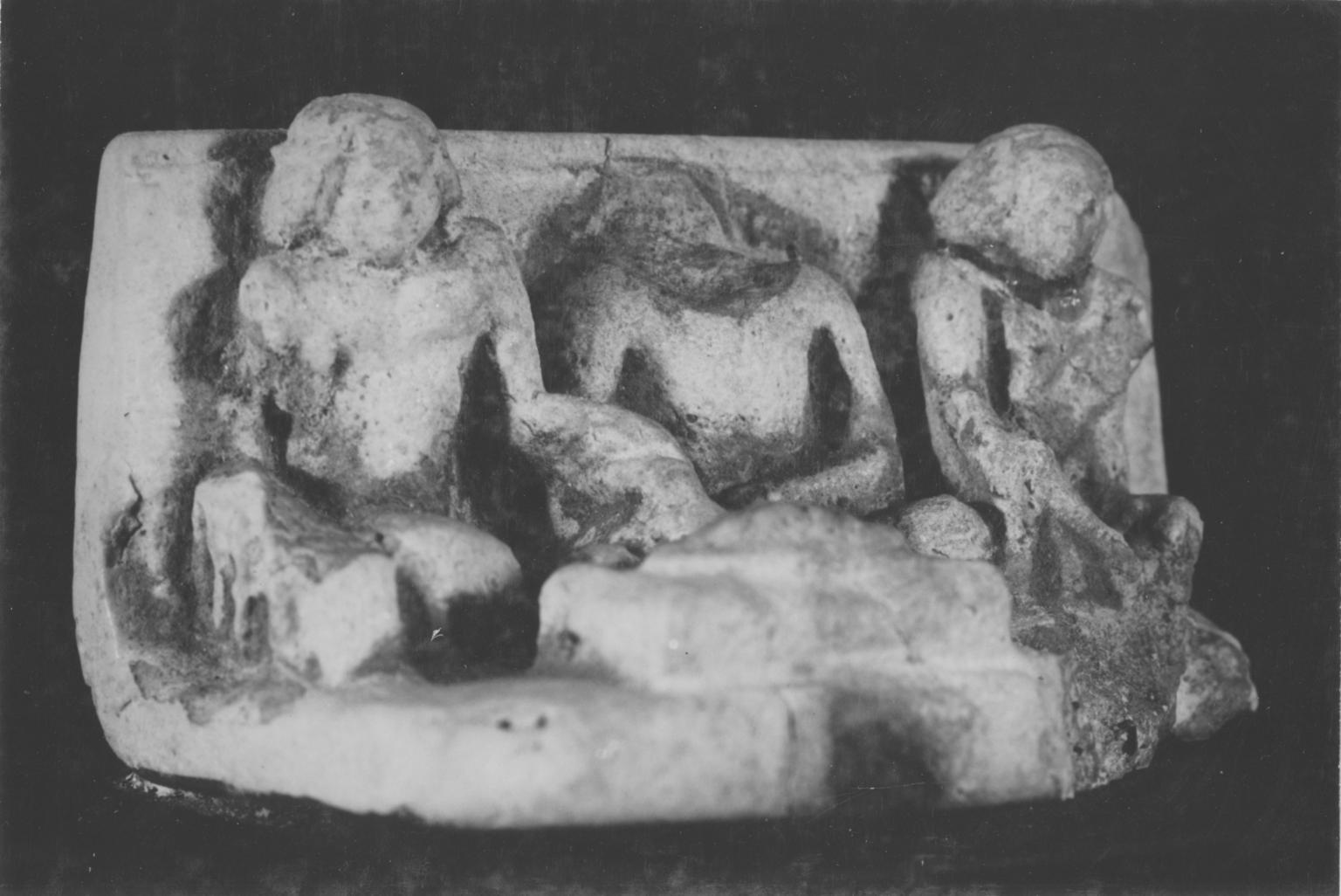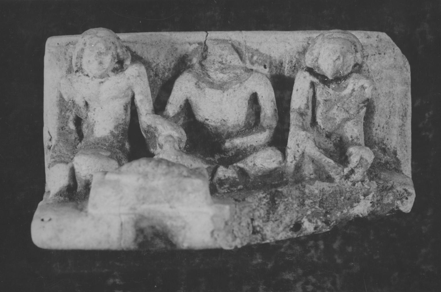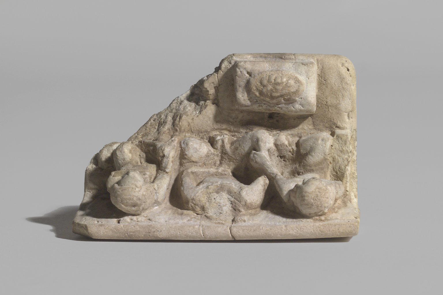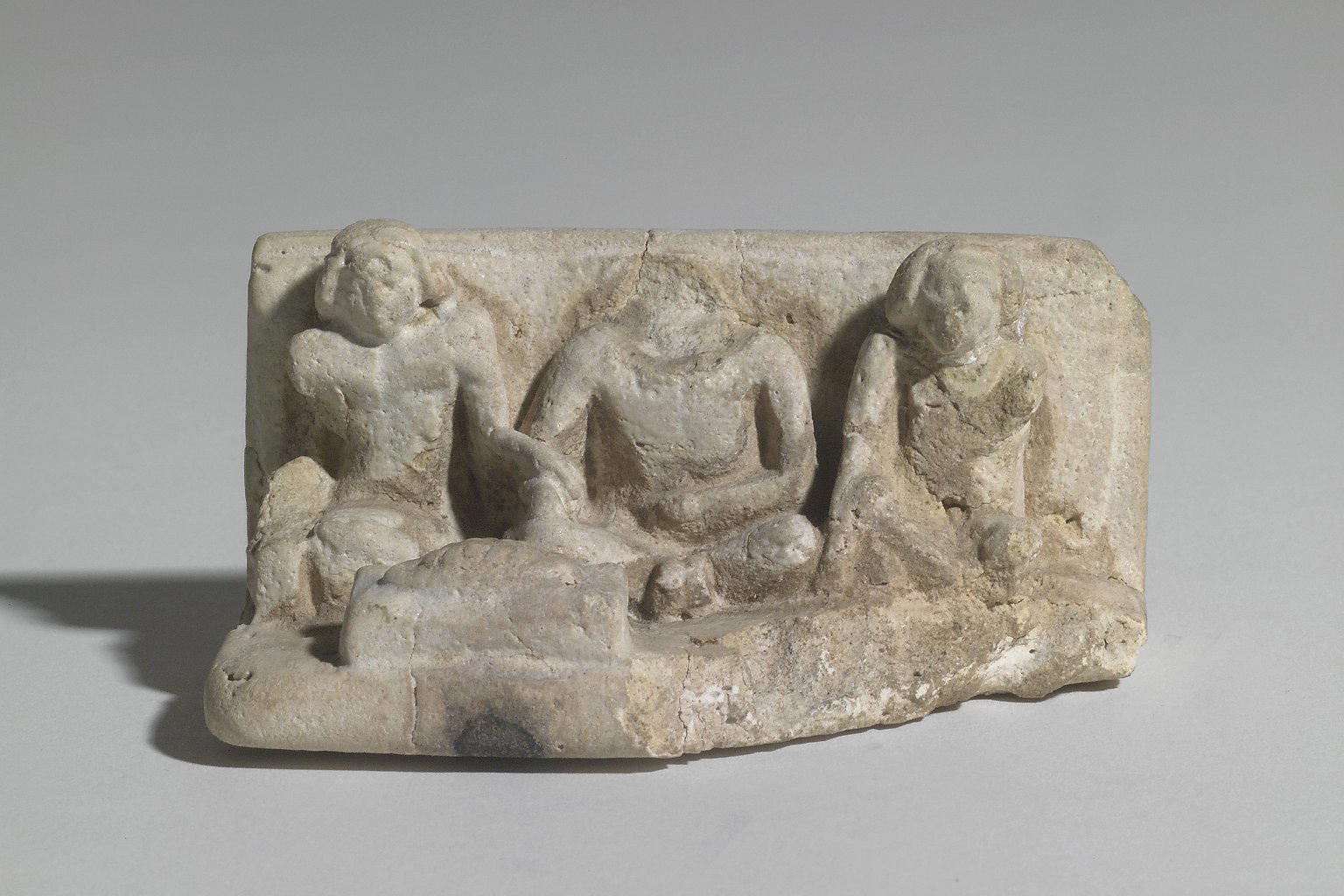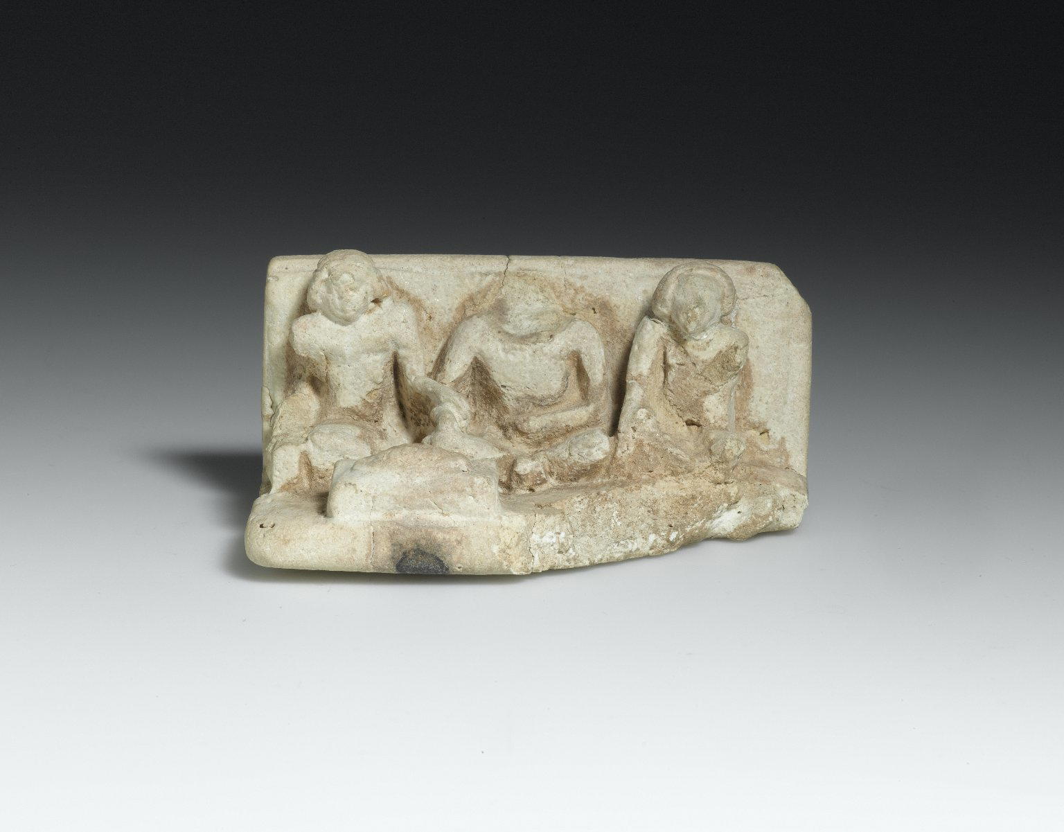 Seated Group Before an Offering Table, ca. 2500–2350 B.C.E.. Faience, 1 1/8 × 1 7/8 × 3 1/8 in. (2.8 × 4.8 × 8 cm). Brooklyn Museum, Gift of Evangeline Wilbour Blashfield, Theodora Wilbour, and Victor Wilbour honoring the wishes of their mother, Charlotte Beebe Wilbour, as a memorial to their father, Charles Edwin Wilbour, 16.102. (Photo: Brooklyn Museum)