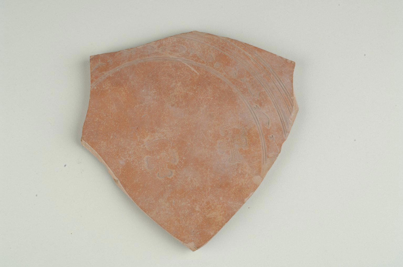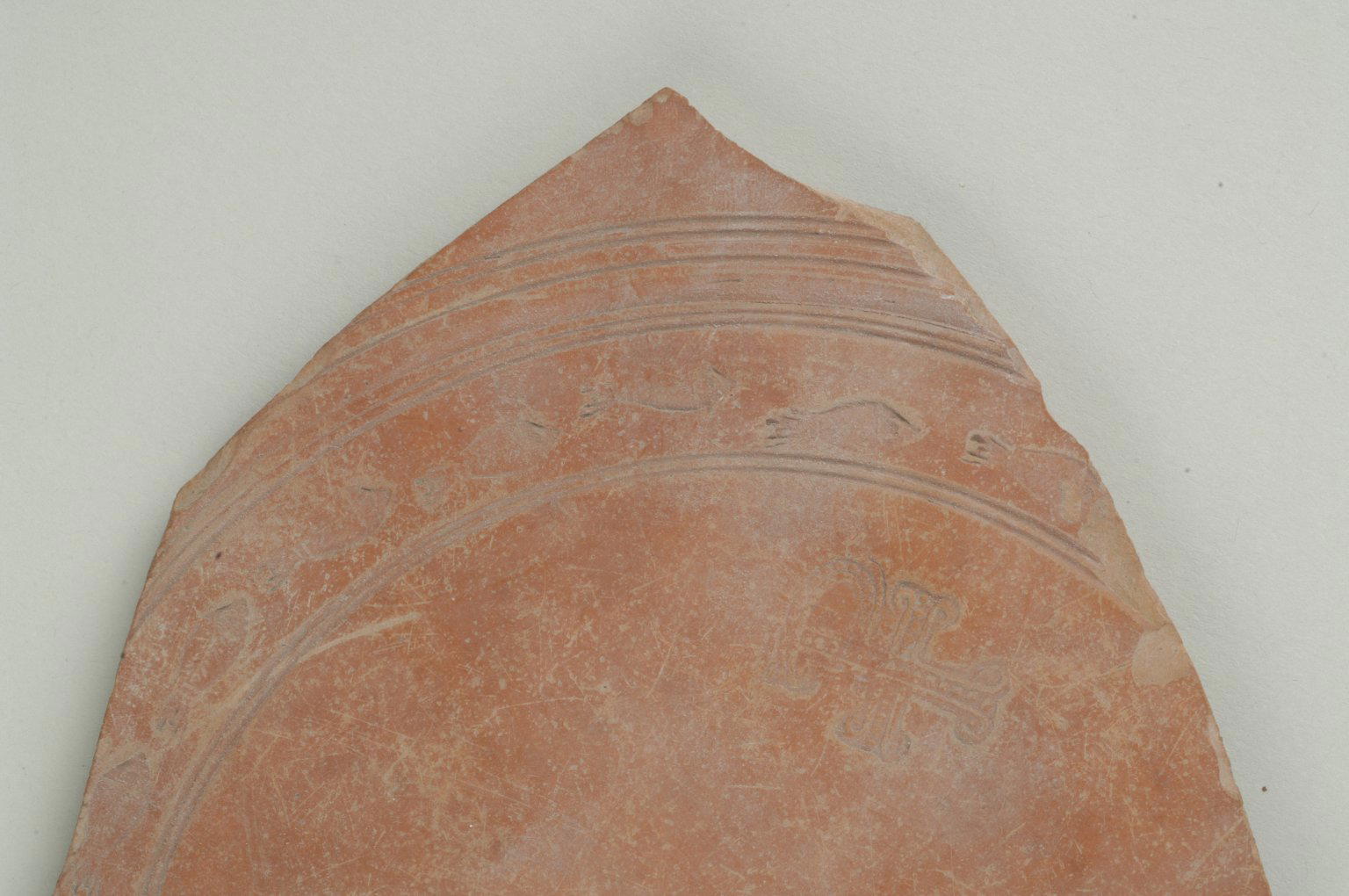 Coptic. Stamped Dish Fragment, 6th century C.E.. Clay, 5 11/16 x 1/4 x 5 15/16 in. (14.5 x 0.7 x 15.1 cm). Brooklyn Museum, Gift of Evangeline Wilbour Blashfield, Theodora Wilbour, and Victor Wilbour honoring the wishes of their mother, Charlotte Beebe Wilbour, as a memorial to their father, Charles Edwin Wilbour, 16.154.1. (Photo: Brooklyn Museum (in collaboration with Index of Christian Art, Princeton University))