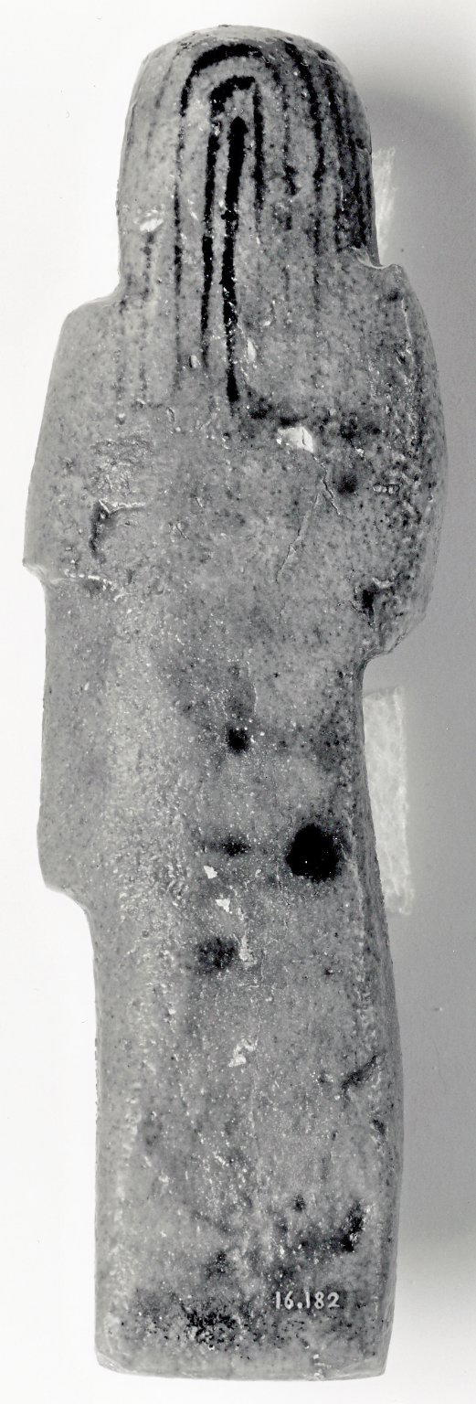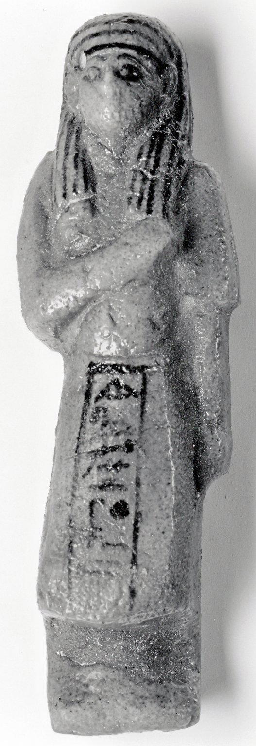 Funerary Figurine of Neskhons, ca. 1075–945 B.C.E.. Faience, 6 3/8 × 1 15/16 in. (16.2 × 5 cm). Brooklyn Museum, Gift of Evangeline Wilbour Blashfield, Theodora Wilbour, and Victor Wilbour honoring the wishes of their mother, Charlotte Beebe Wilbour, as a memorial to their father, Charles Edwin Wilbour, 16.182. (Photo: Brooklyn Museum)