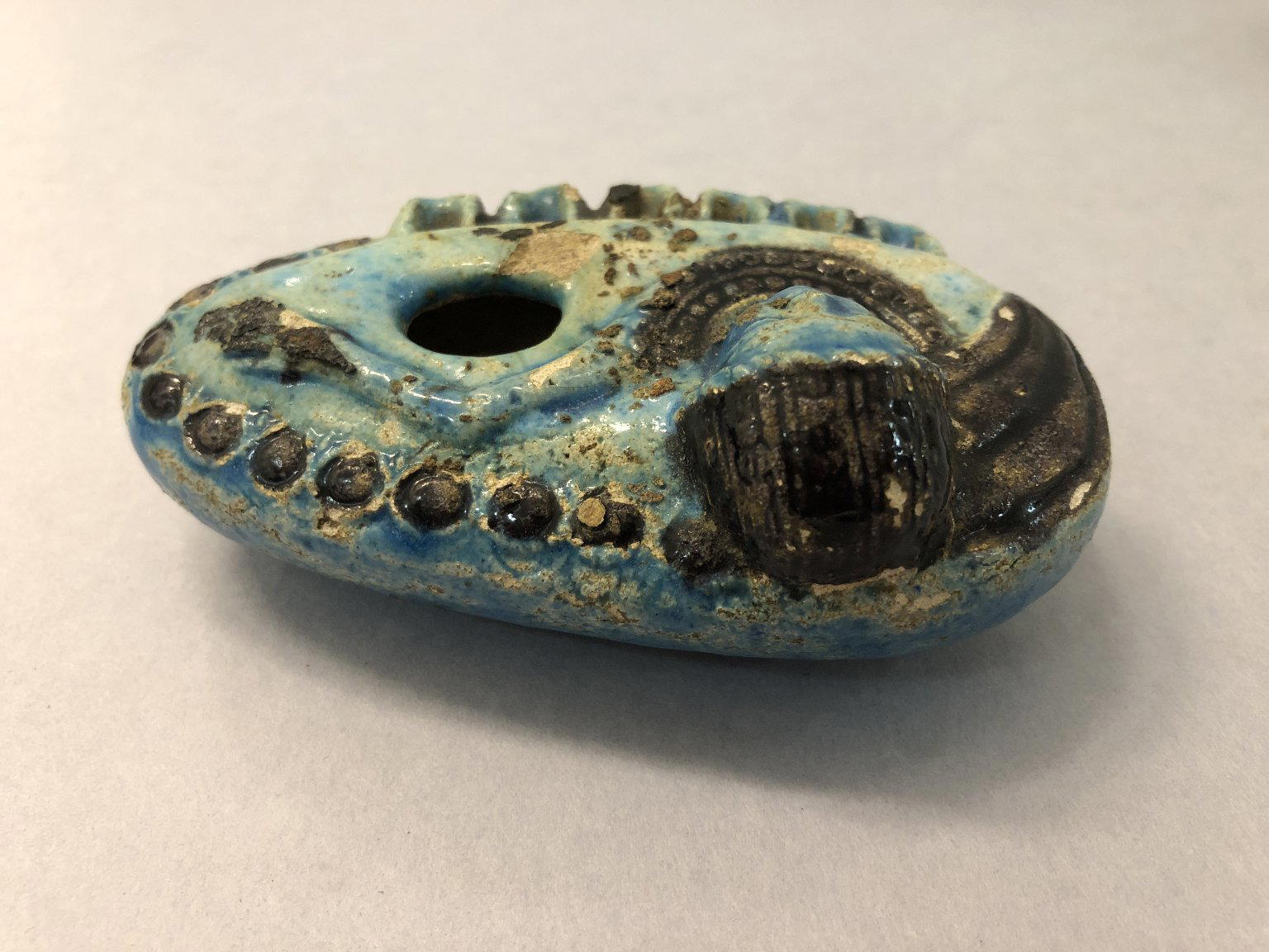 Lamp, ca. 2nd century B.C.E.. Faience, 1 3/4 × 2 1/2 × 4 3/8 in. (4.5 × 6.3 × 11.1 cm). Brooklyn Museum, Charles Edwin Wilbour Fund, 69.117.