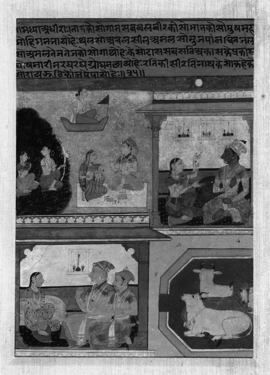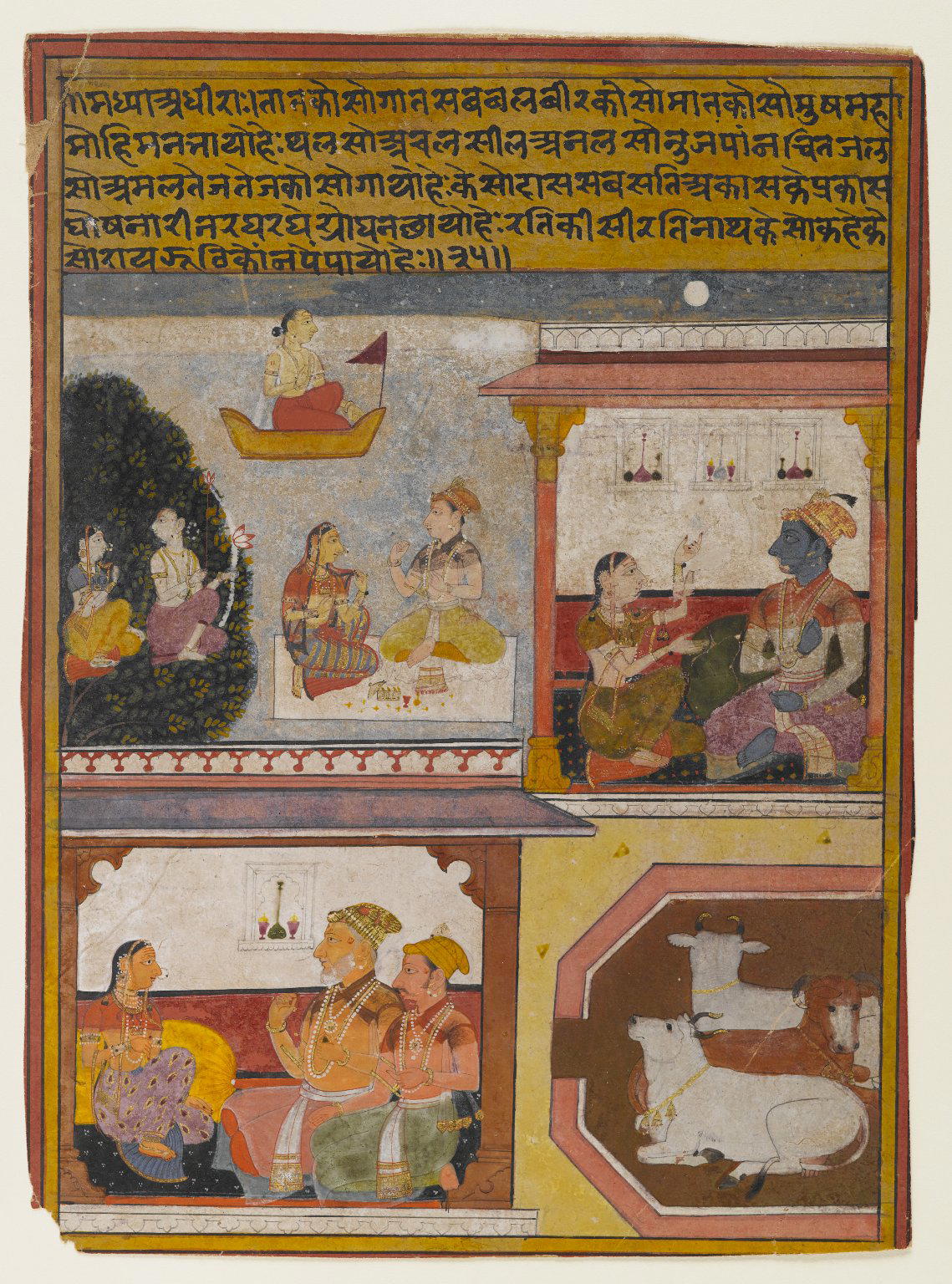 V. Desai explains that the Braj text, written in Devanagari script in the panel at the top of the page, is the title of the Rasikapriya verse (ch. 3, v. 0) expressed in the form of similes (correspondence, 1992).