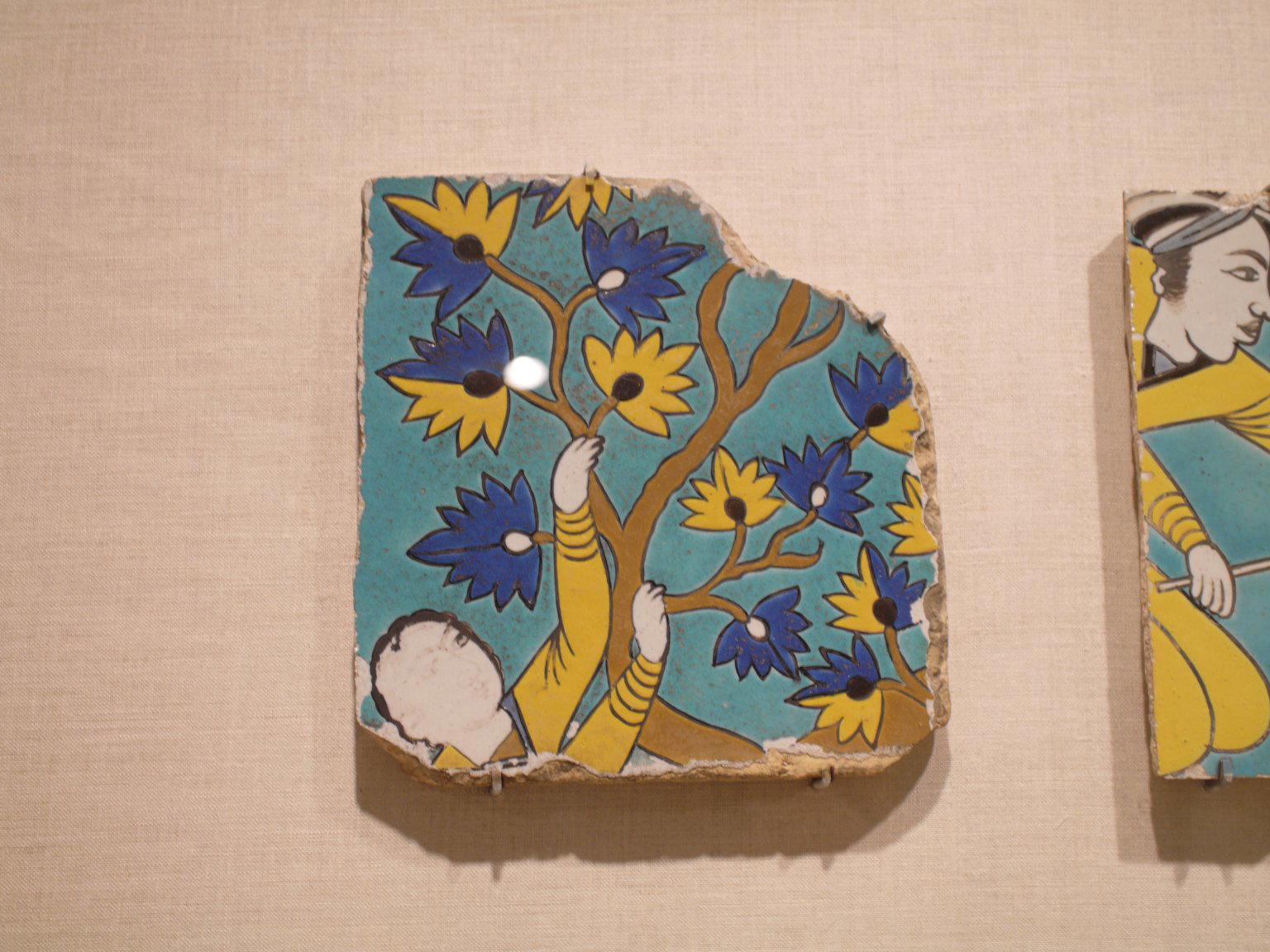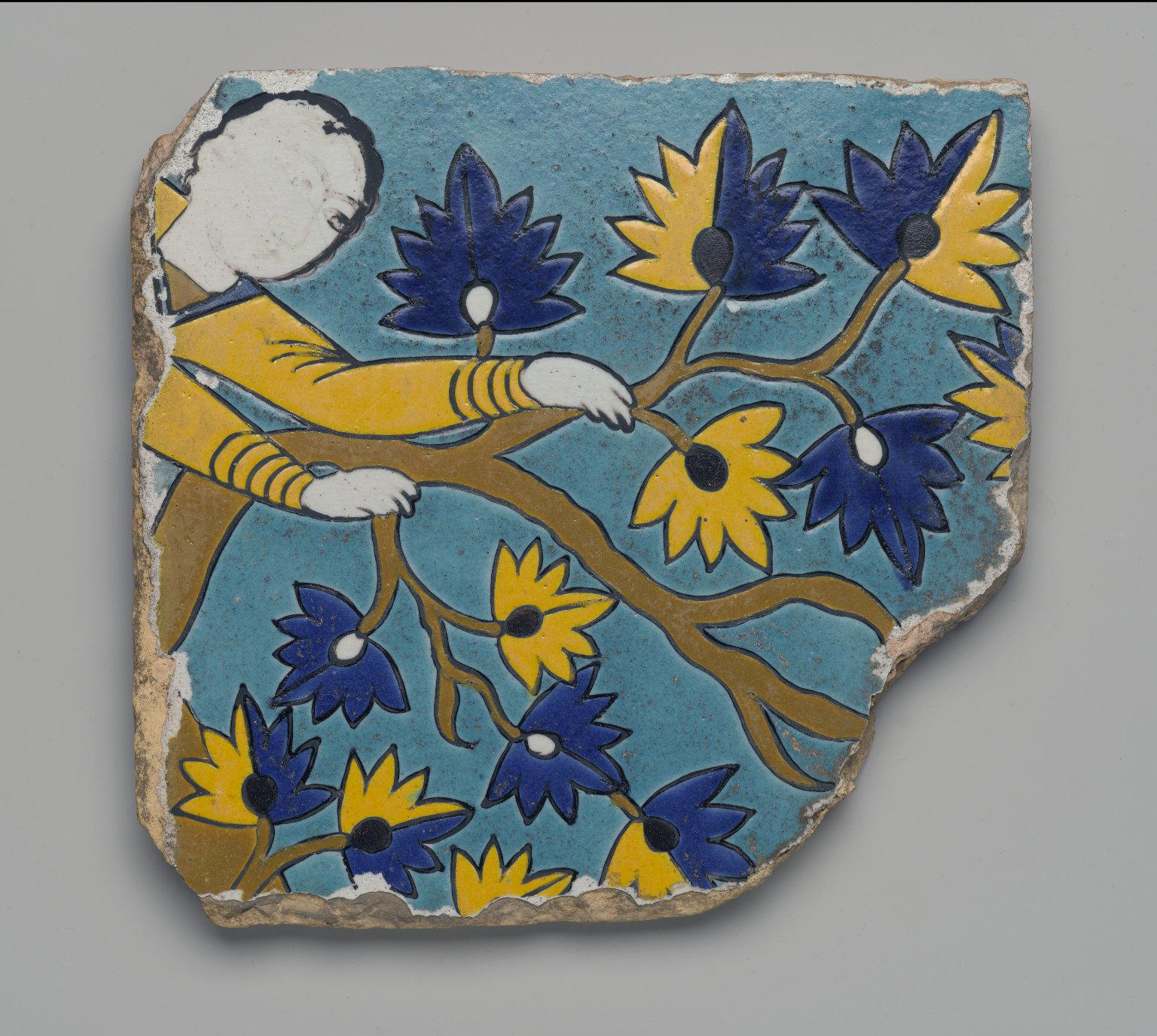 Cuerda Seca Tile Fragment Depicting Youth Climbing a Tree, first half of the 17th century. Ceramic; fritware, painted in yellow, turquoise, cobalt blue, black, opaque white, and ochre-brown glazes with manganese purple in the cuerda seca (dry-cord) technique, 9 1/4 x 9 1/2 in. (23.5 x 24.1 cm). Brooklyn Museum, Gift of Mr. and Mrs. Charles K. Wilkinson, 72.26.1. (Photo: Brooklyn Museum)